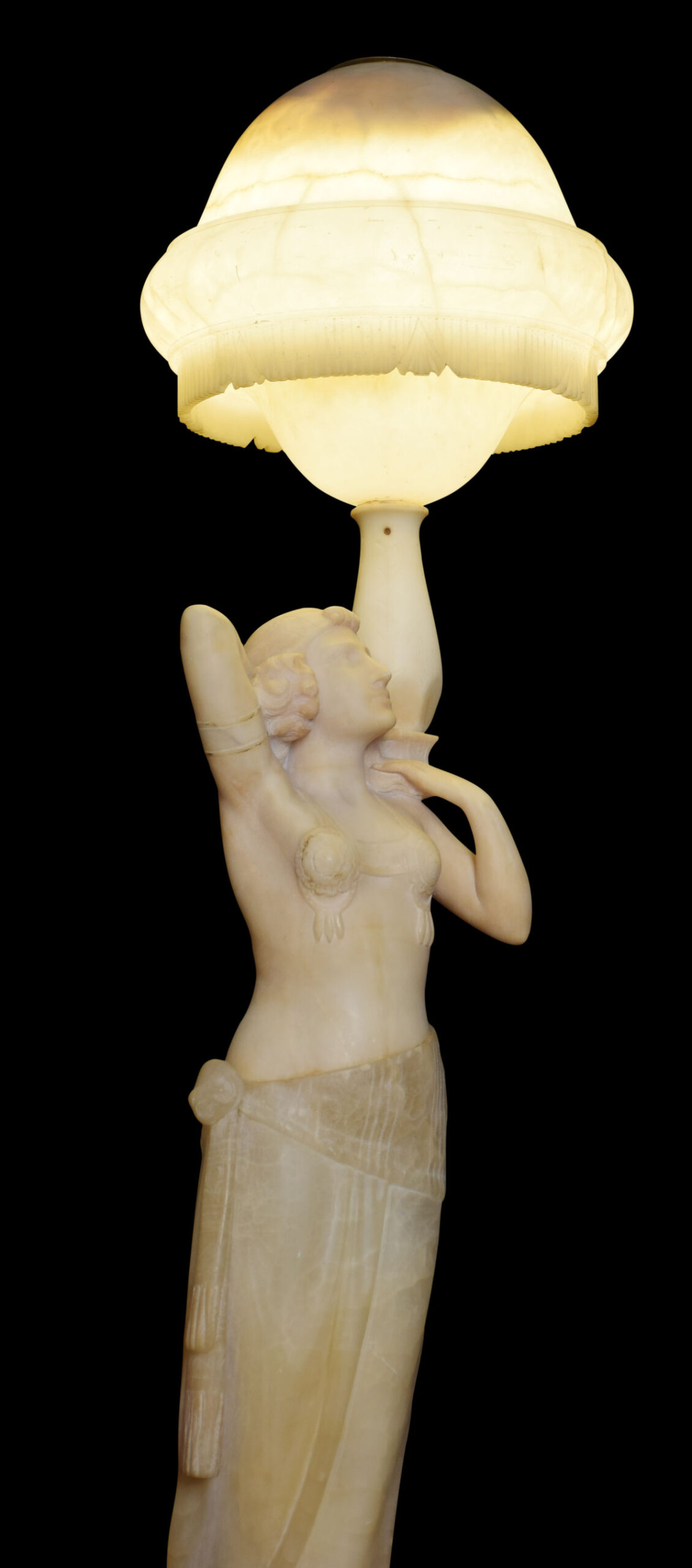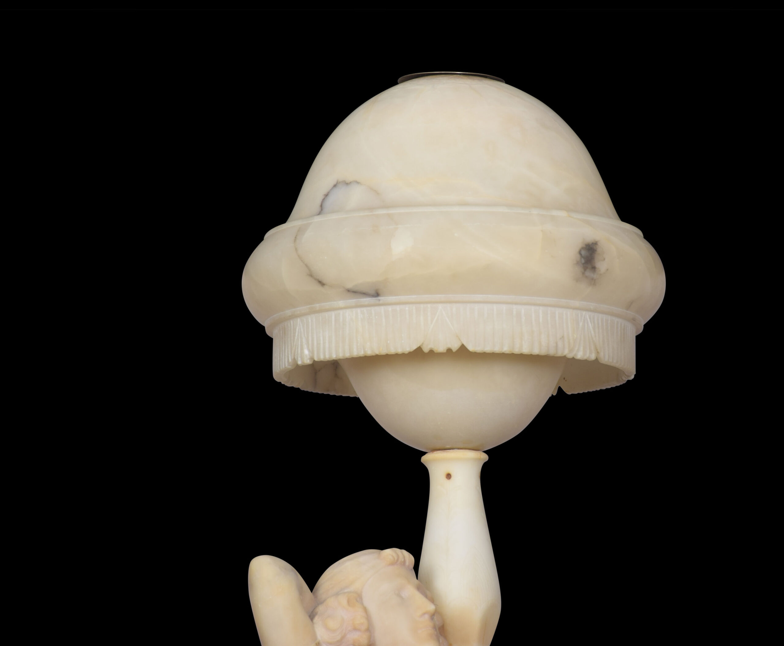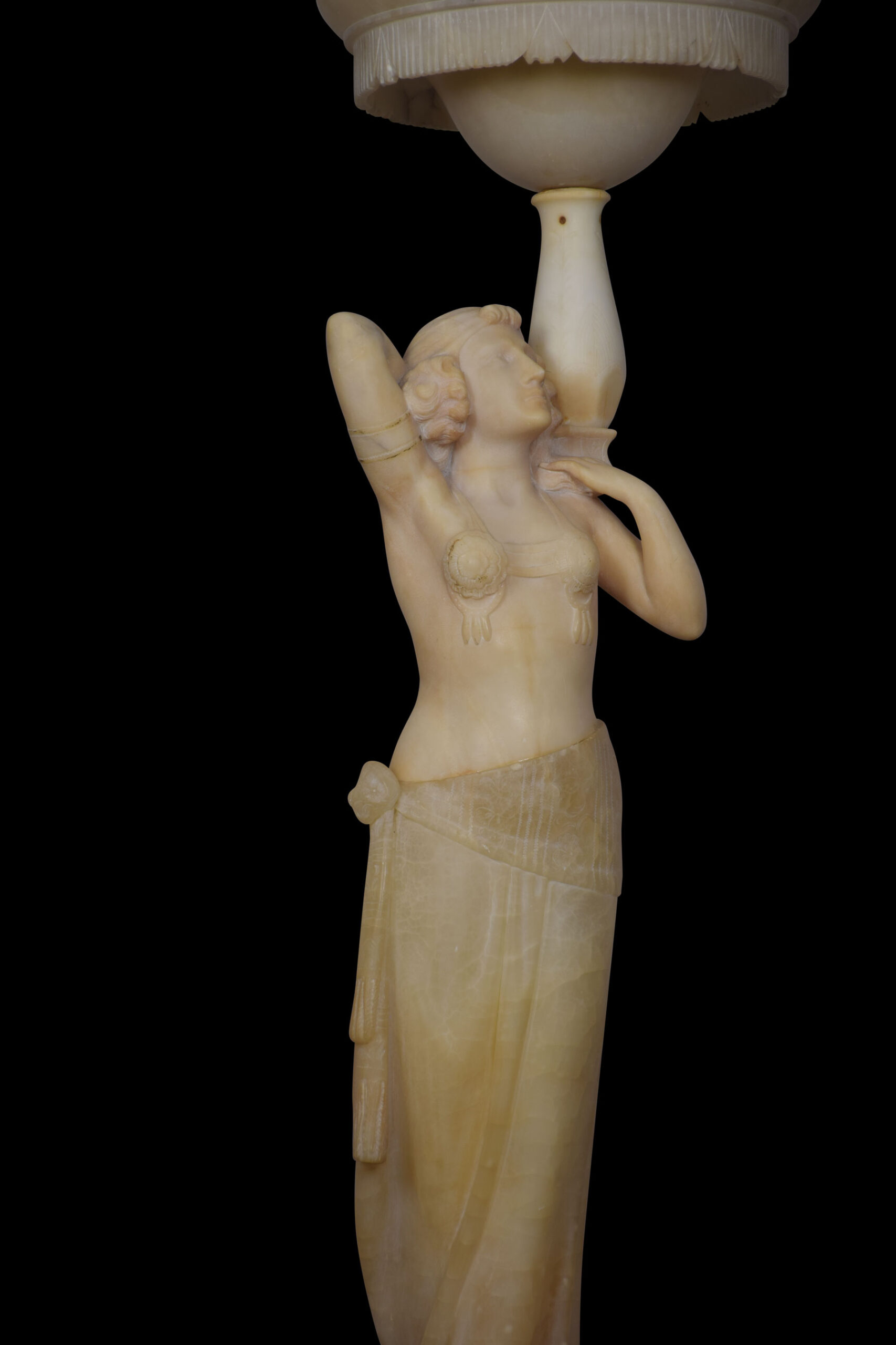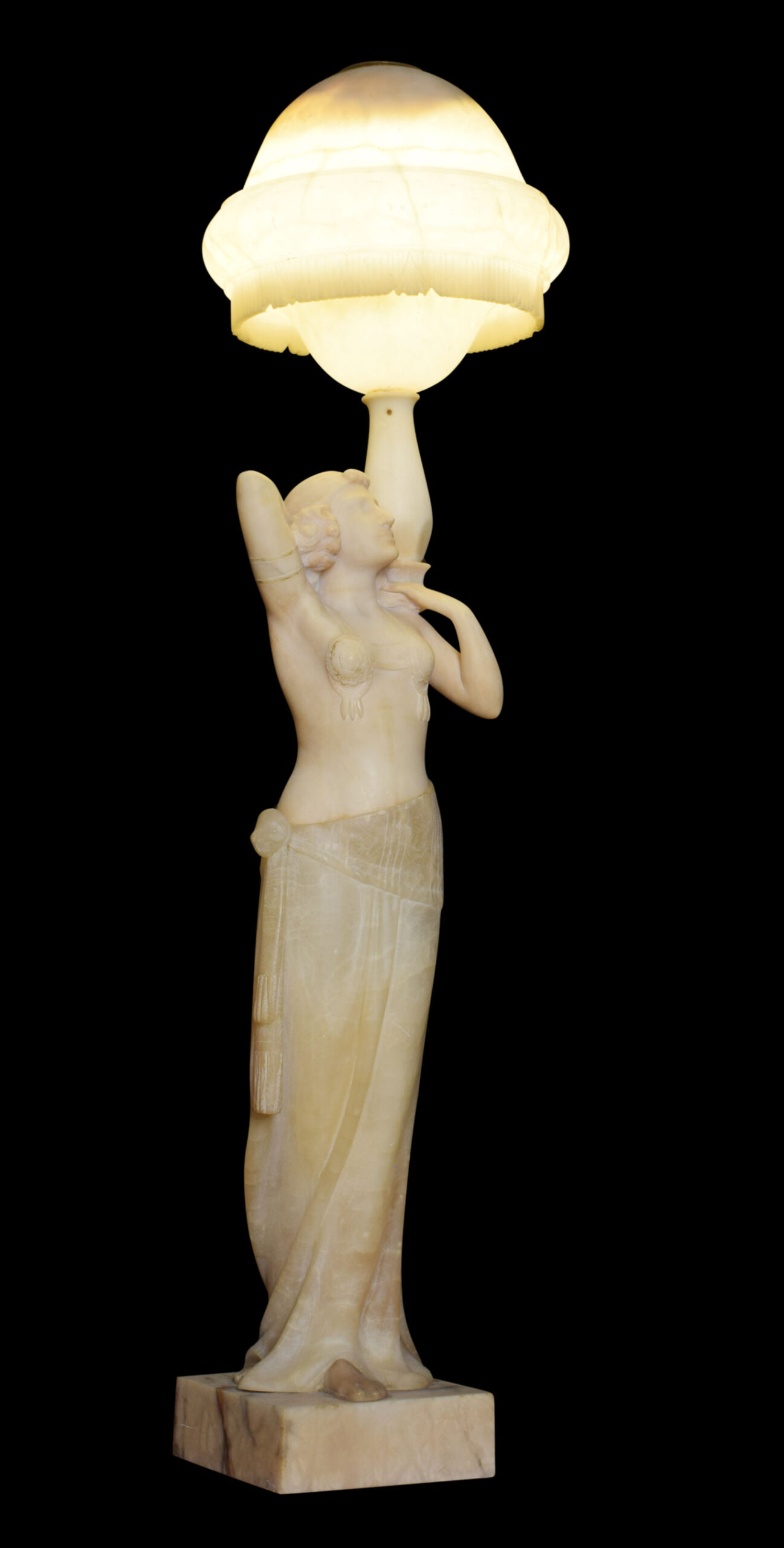 Art Deco alabaster figural lamp modelled as an Egyptian revival dancing girl having arms raised below the bowl-shaped shade. The lamp has been rewired.