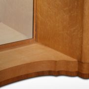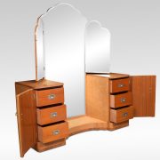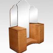 Art Deco Dressing dressing table, fitted with a large central bevelled mirror. Flanked by smaller adjustable mirrors. To the base having twin pedestals and original bakelite handles opening to reveal three drawers in each pedestal. All raised up on plinth base.