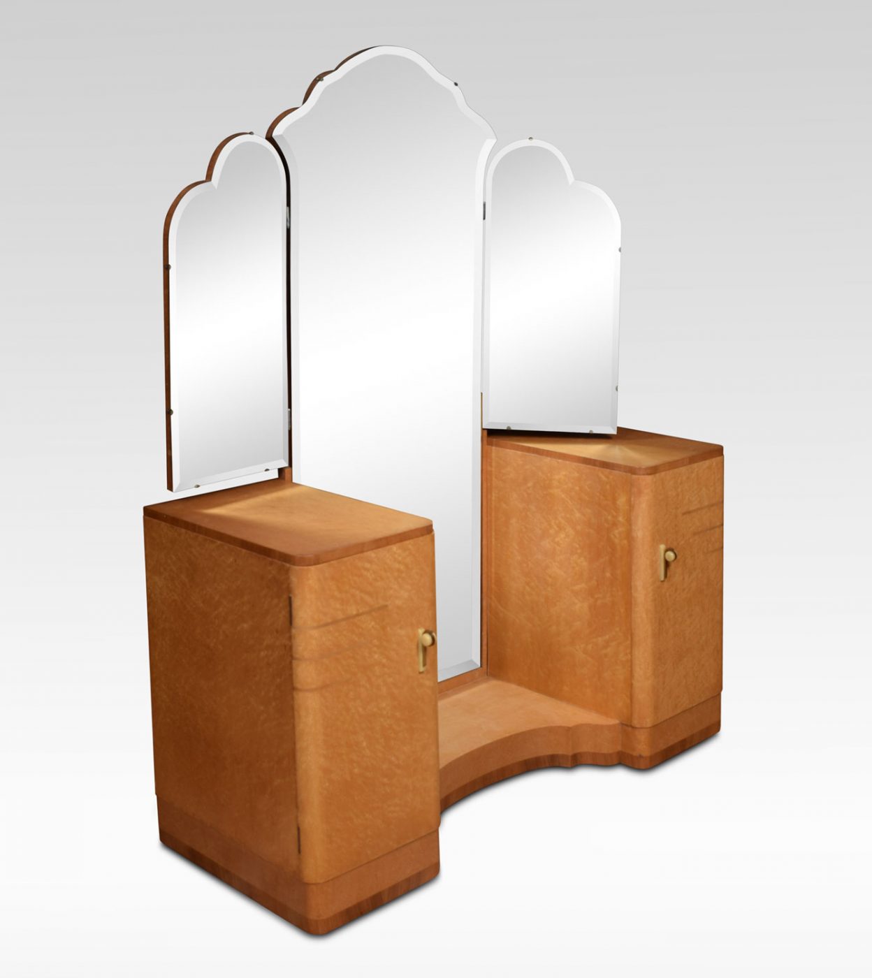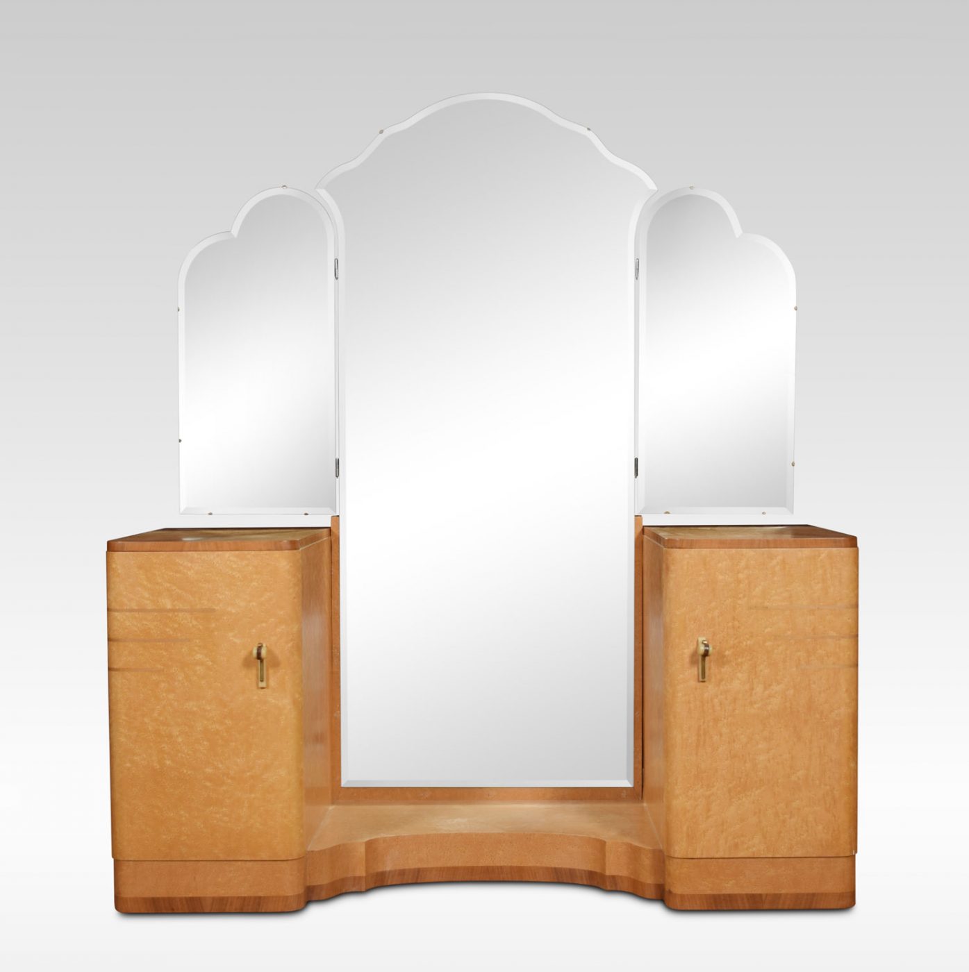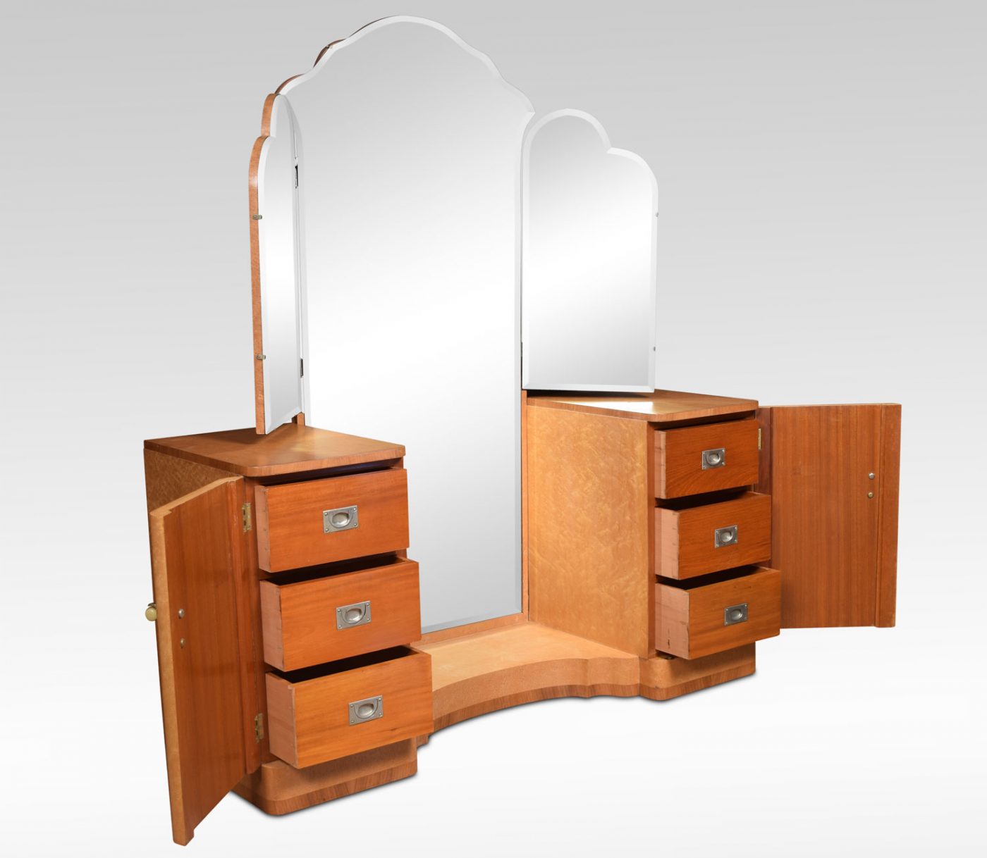 Art Deco Dressing dressing table, fitted with a large central bevelled mirror. Flanked by smaller adjustable mirrors. To the base having twin pedestals and original bakelite handles opening to reveal three drawers in each pedestal. All raised up on plinth base.