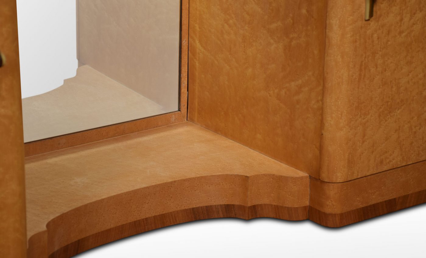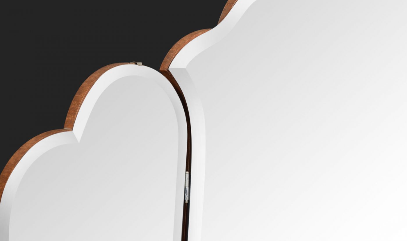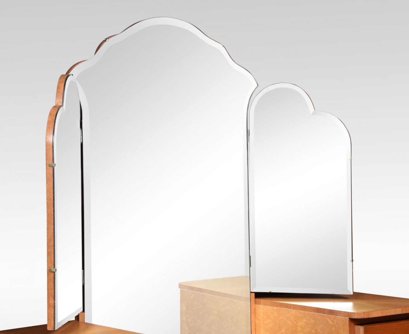 Art Deco Dressing dressing table, fitted with a large central bevelled mirror. Flanked by smaller adjustable mirrors. To the base having twin pedestals and original bakelite handles opening to reveal three drawers in each pedestal. All raised up on plinth base.