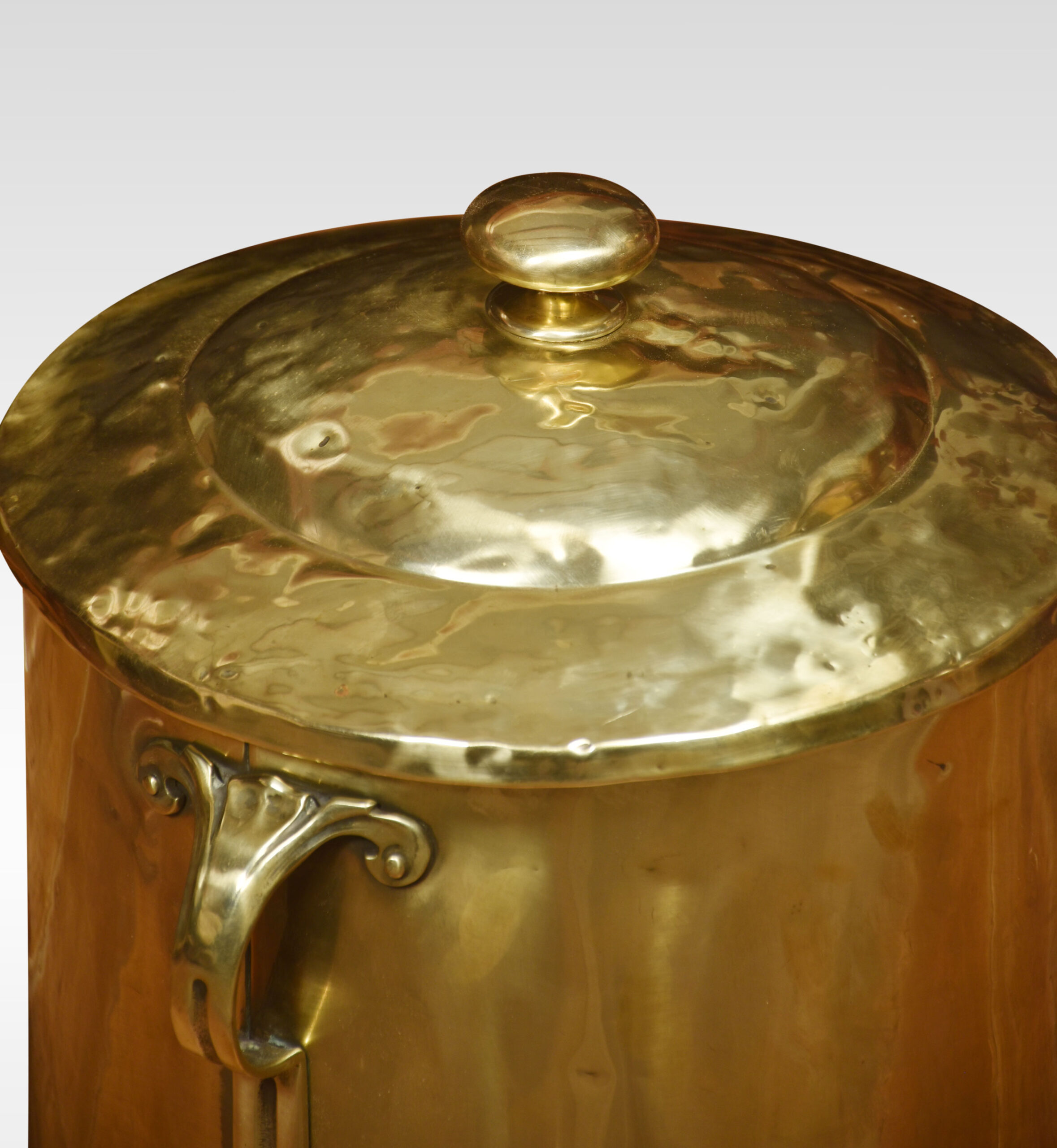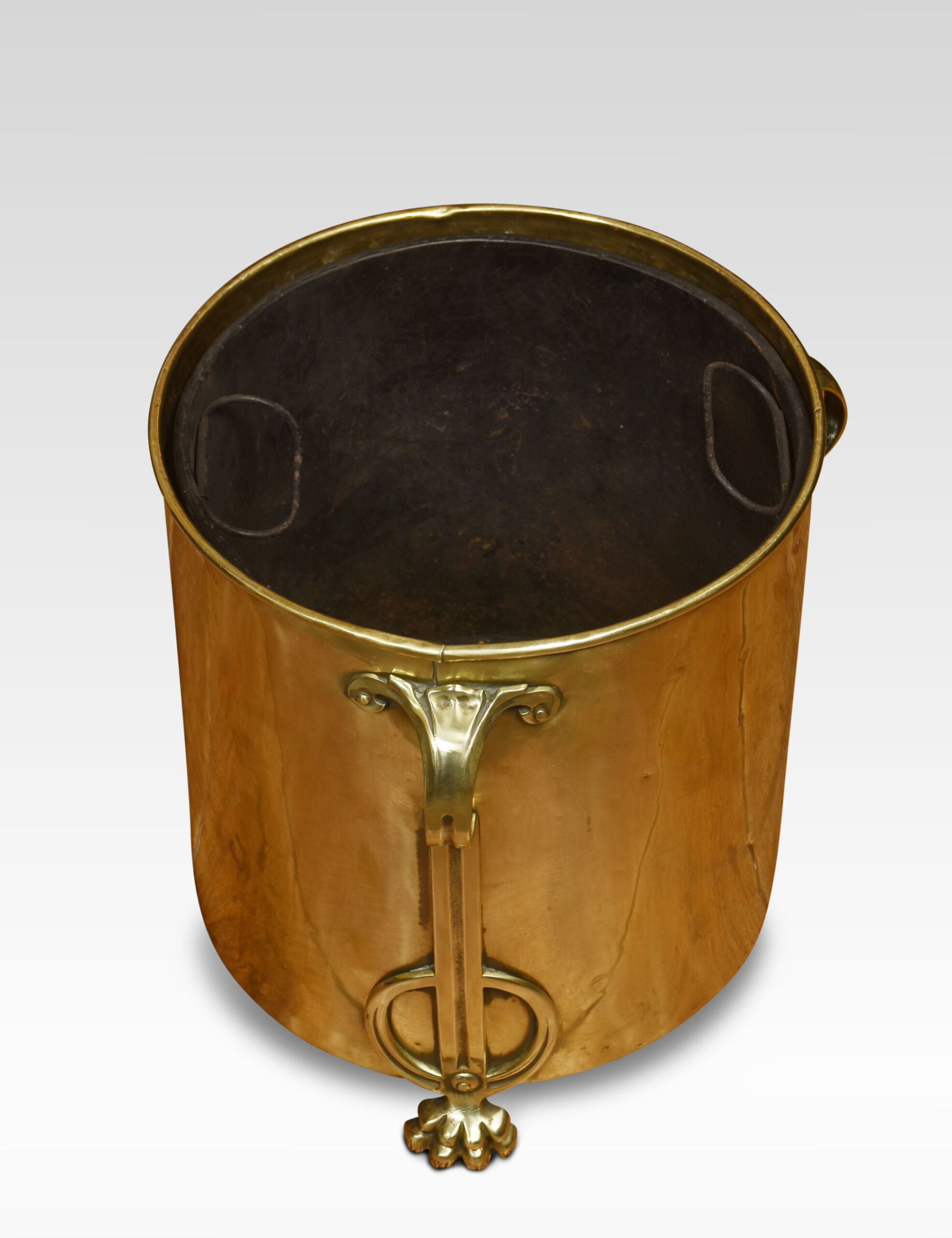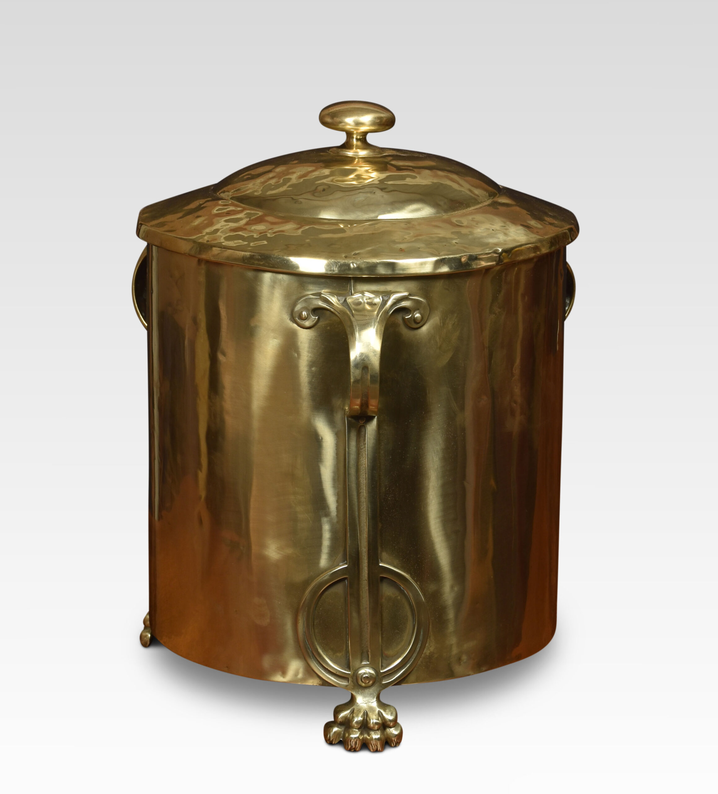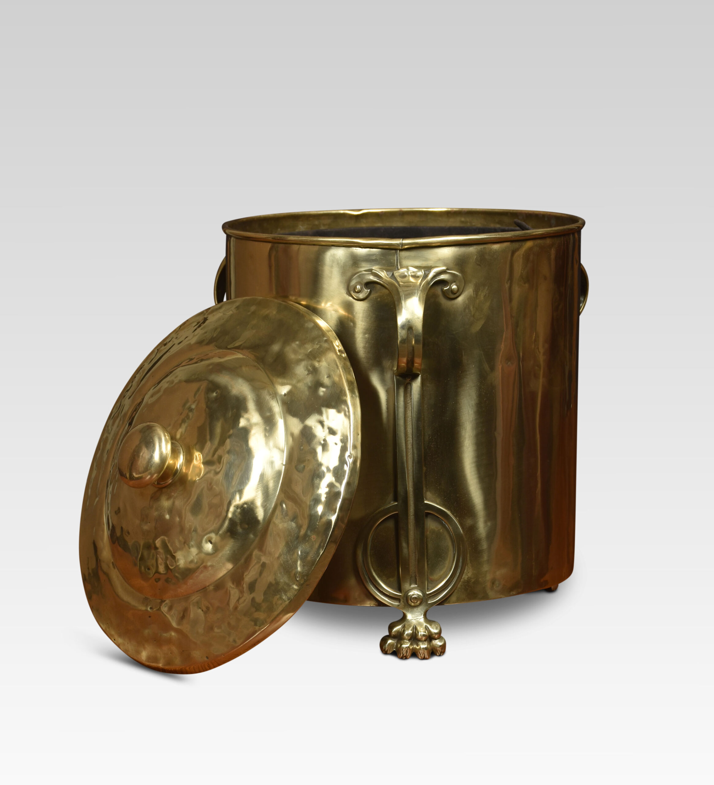 Art Nouveau brass coal bin of cylindrical form, the removable lid opening to reveal the original tin liner. Above three strap-work handles, all raised up on paw feet.