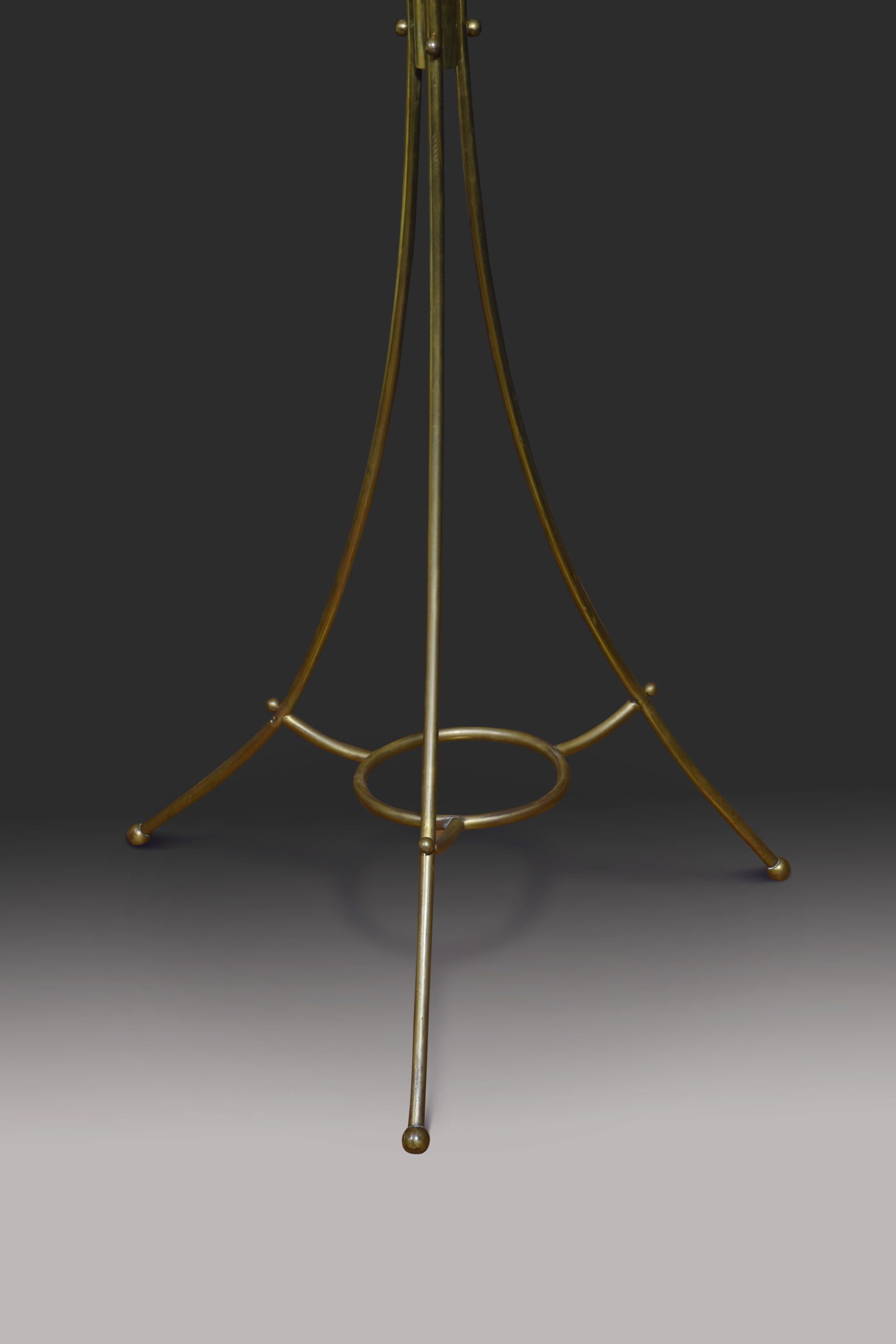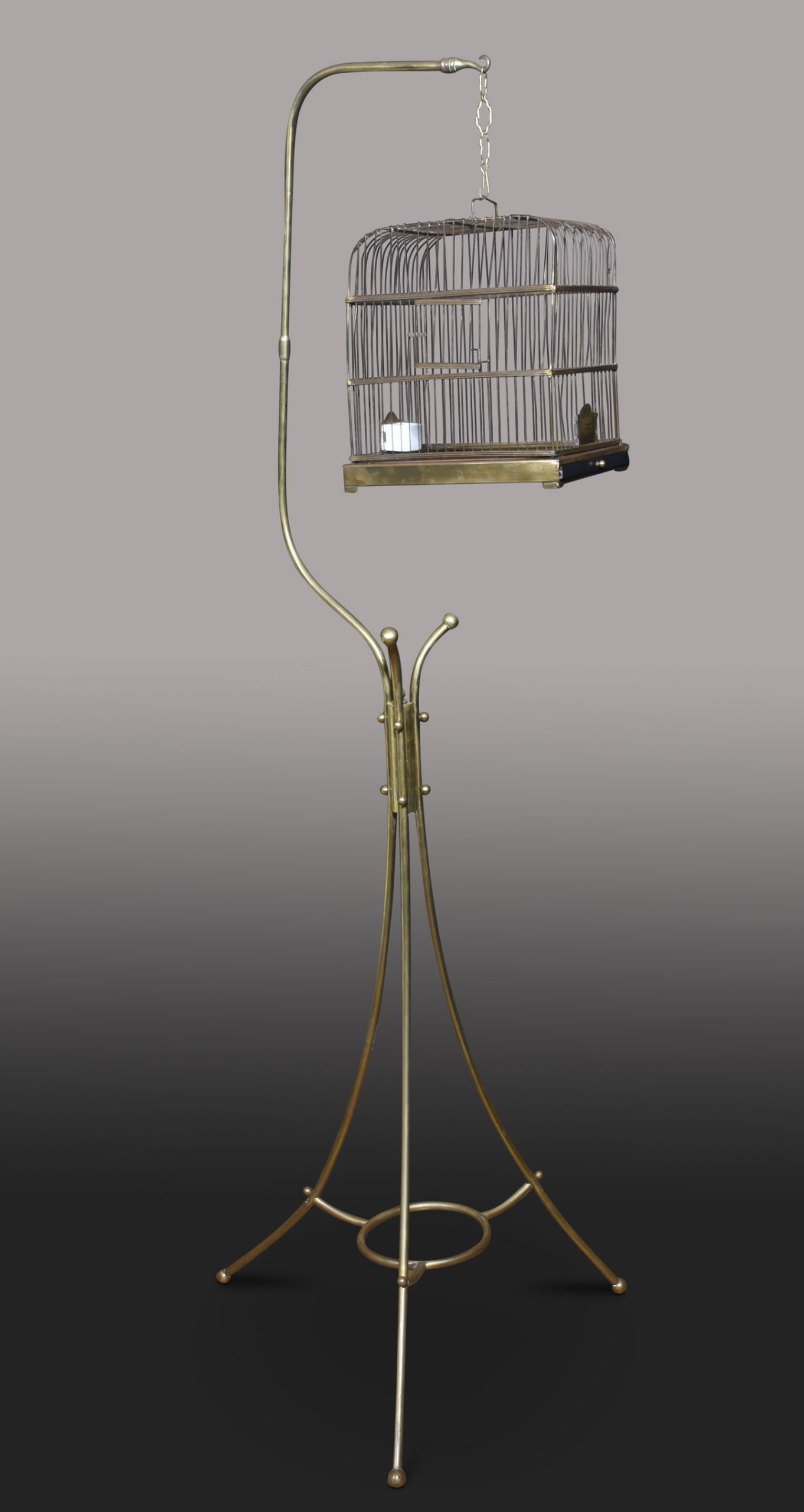 Art Nouveau brass hanging bird cage, the brass wirework top on an octagonal base with a single drawer and original feeder. Supported on brass splayed base.