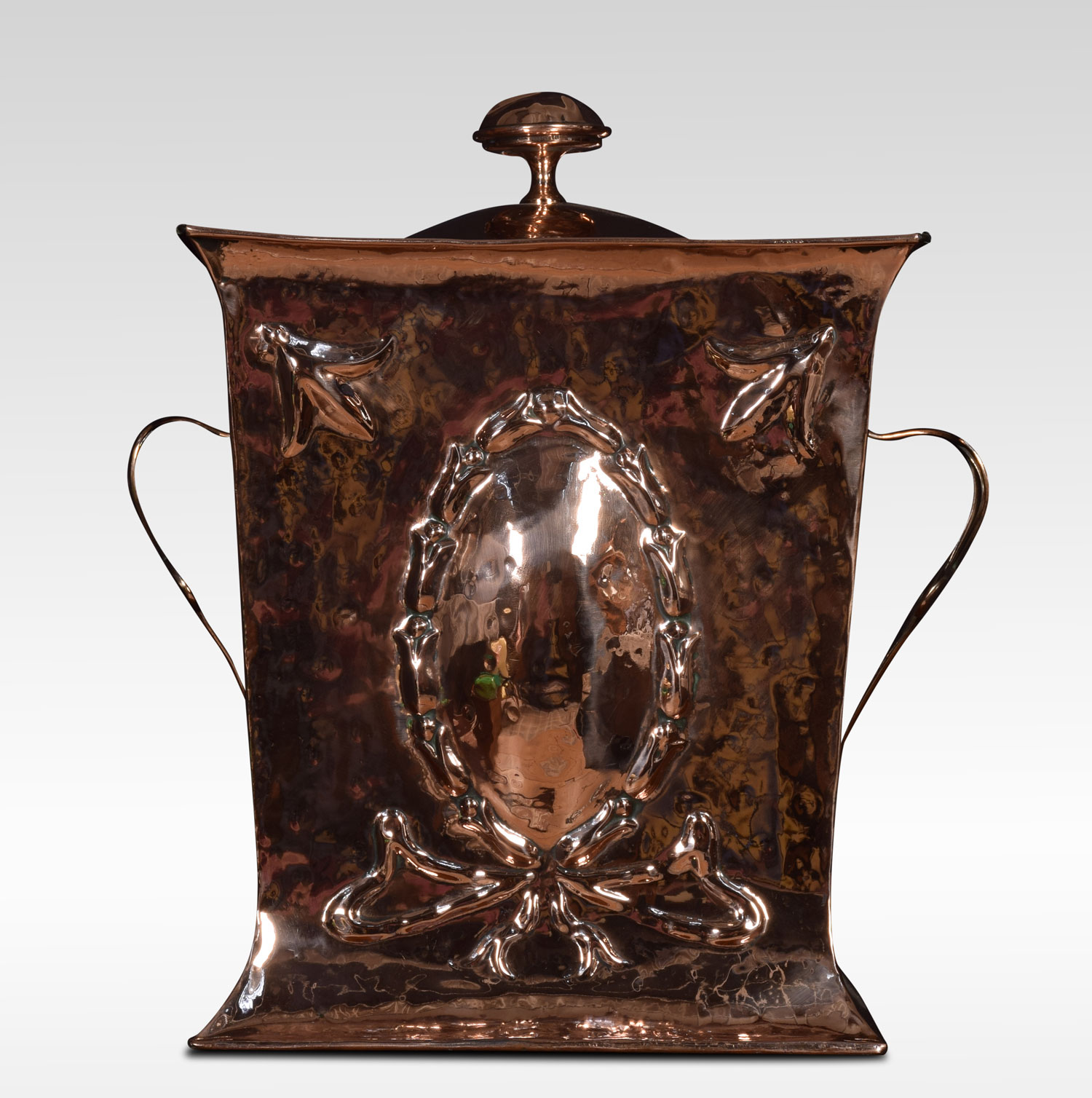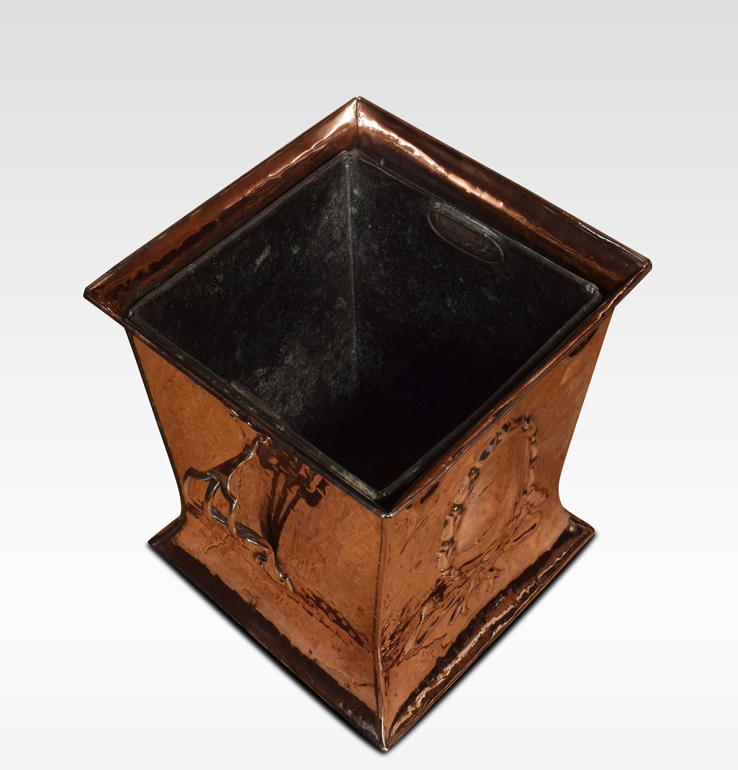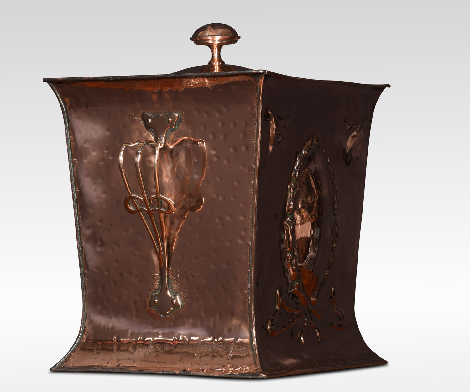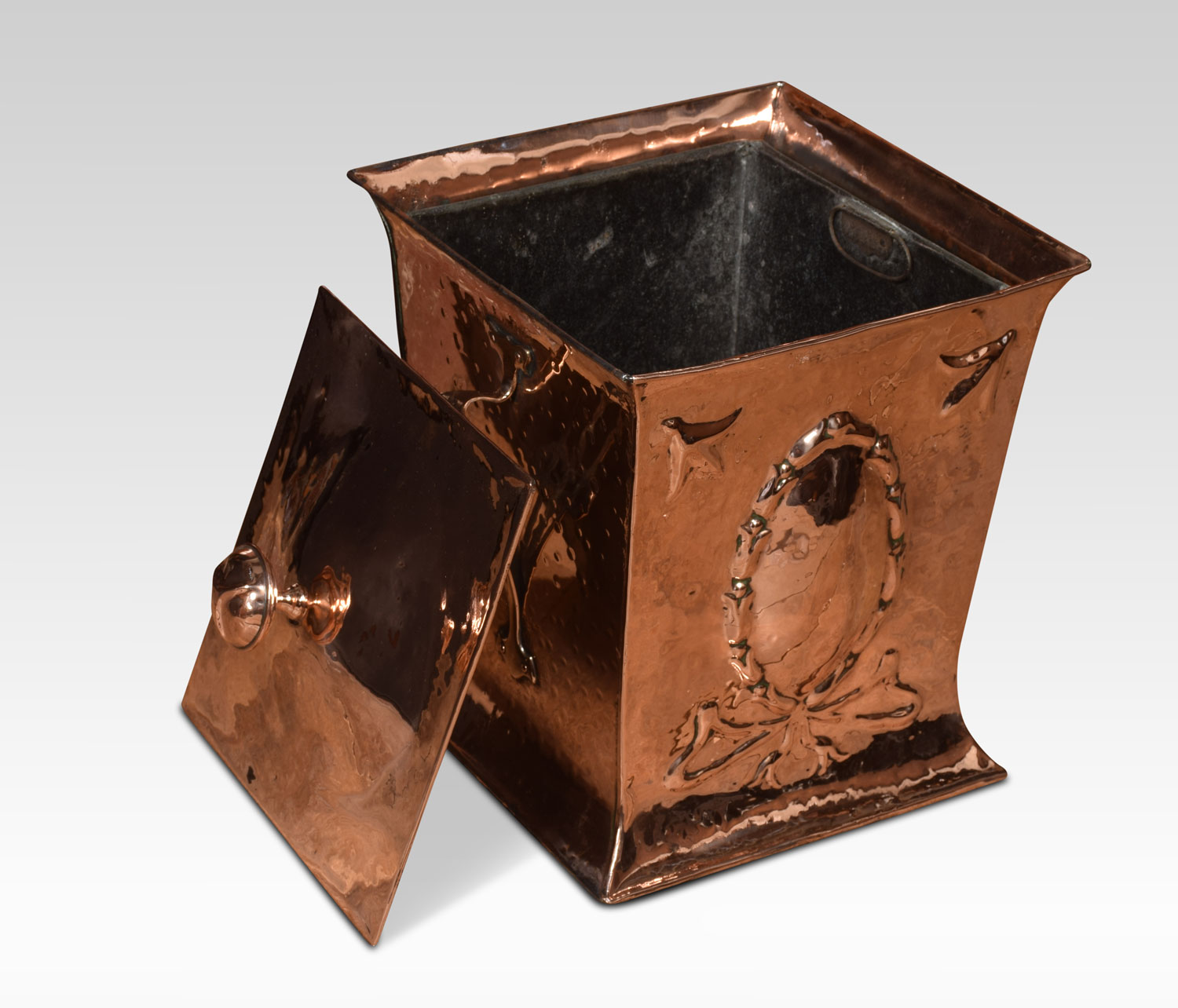 Arts and crafts copper coal bin and cover, of square form having central beaten motif retaining its original tin liner.