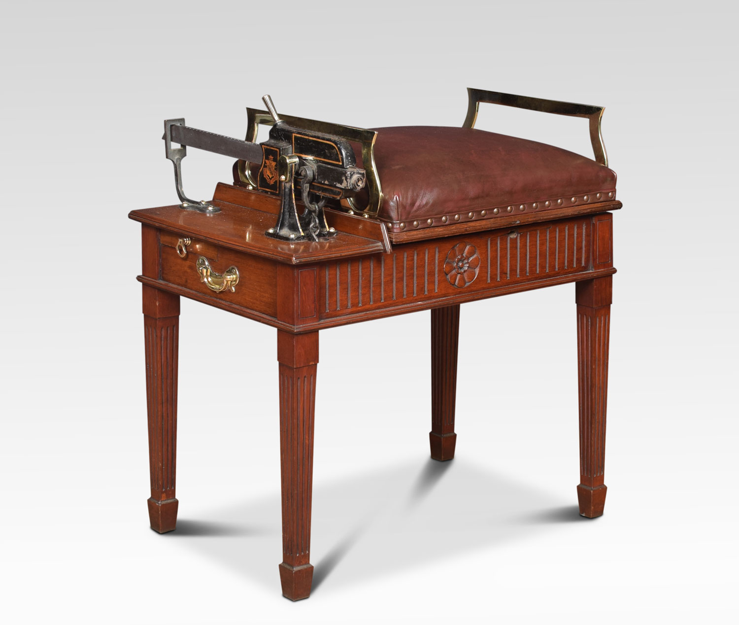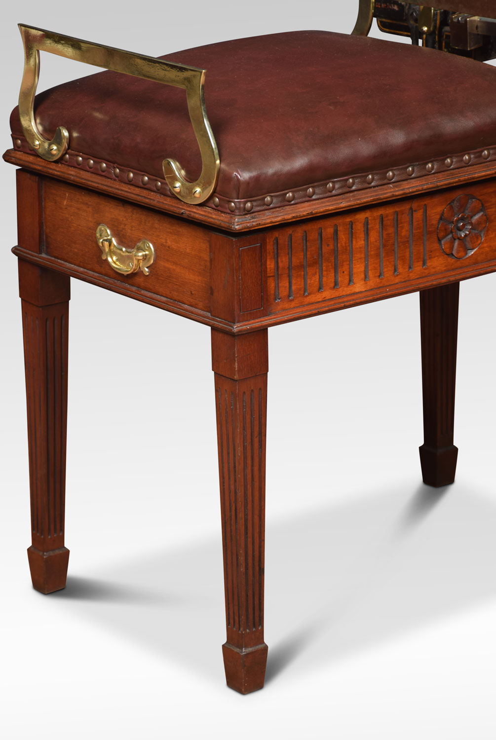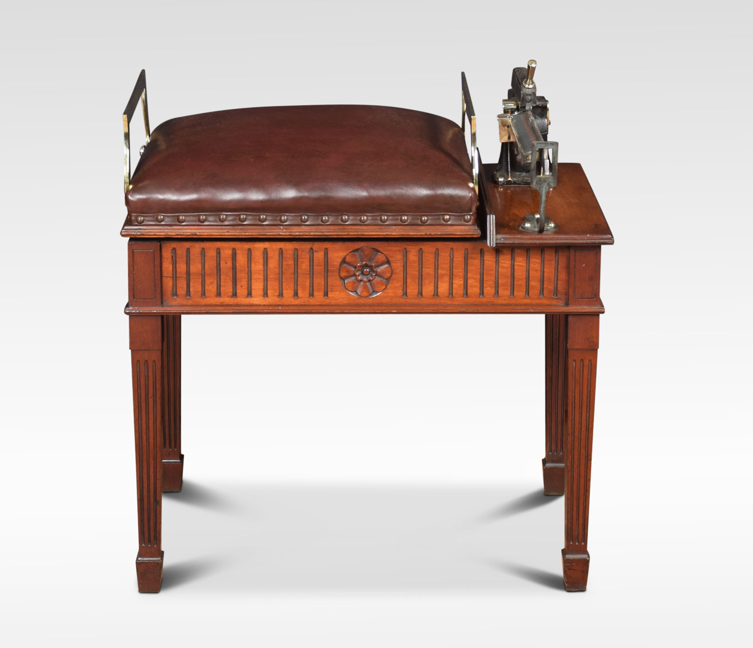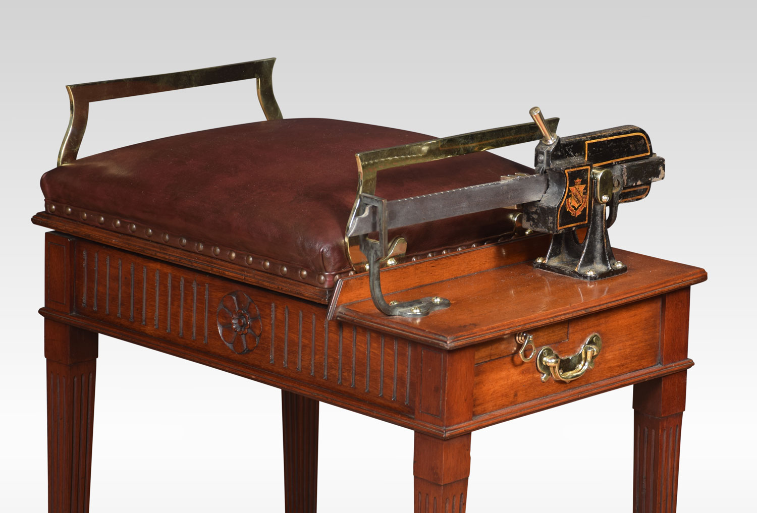 Avery Jockey scales the seat upholstered in leather above the mahogany base with carved frieze raised up on four square tapering fluted legs