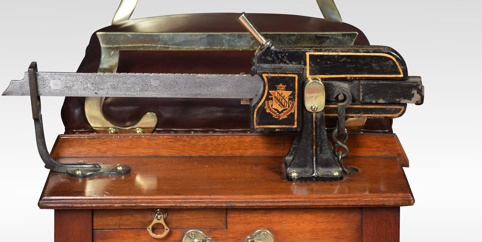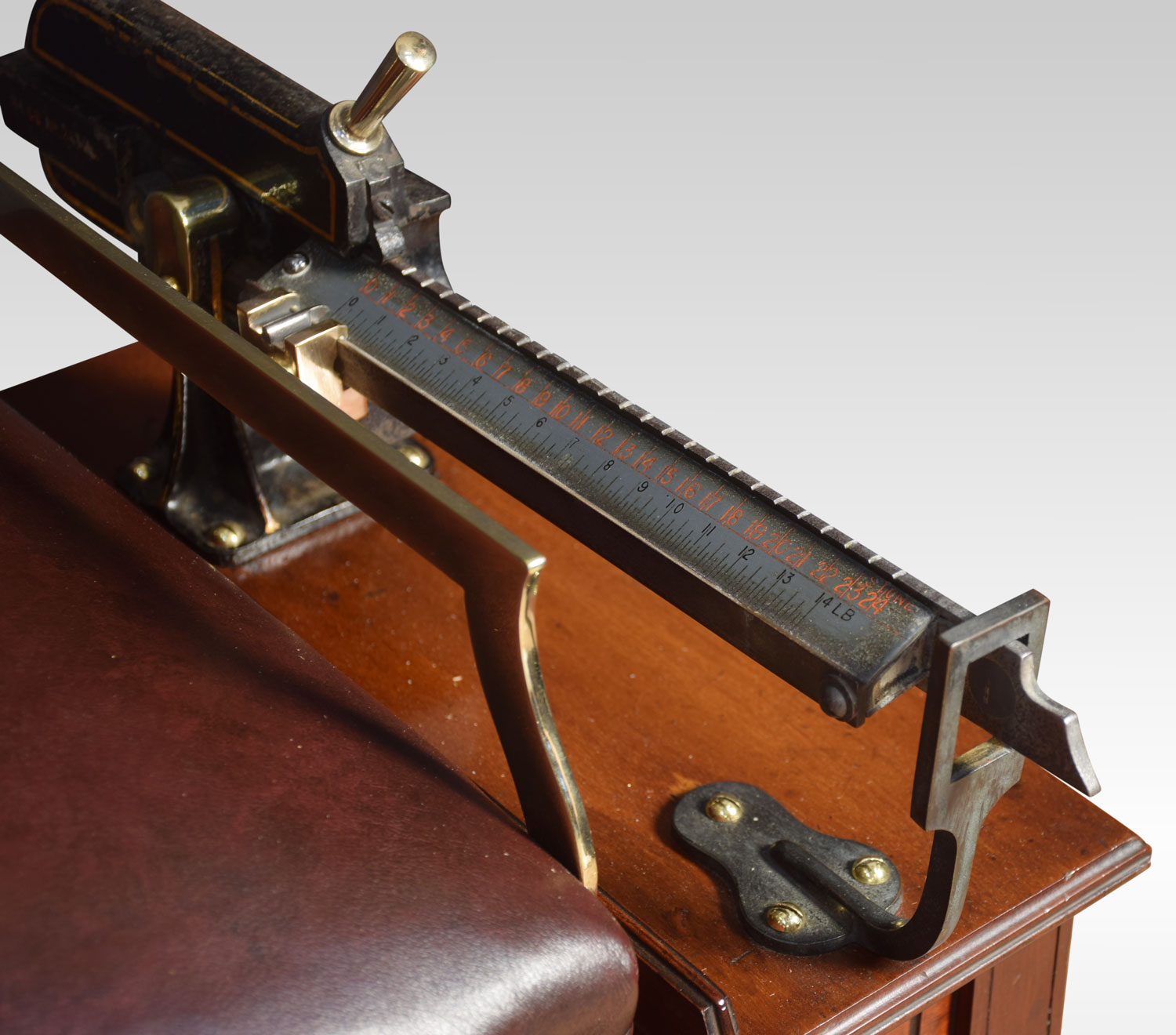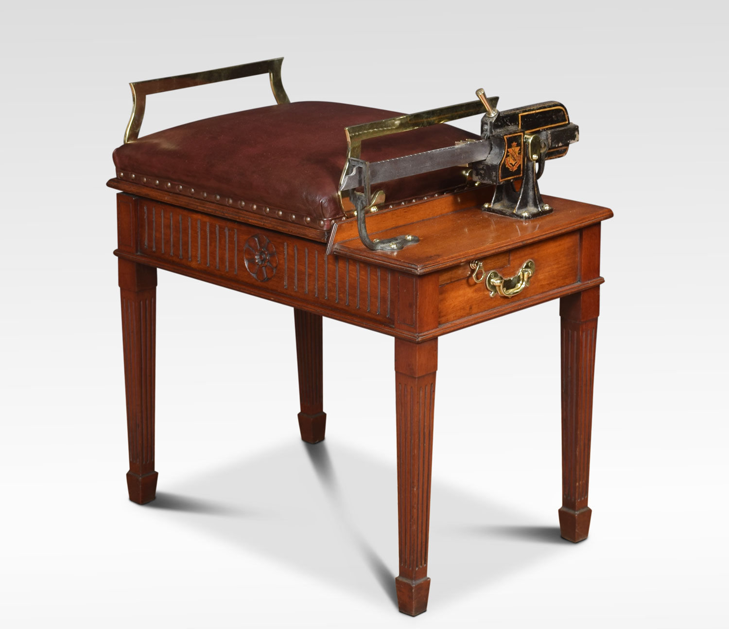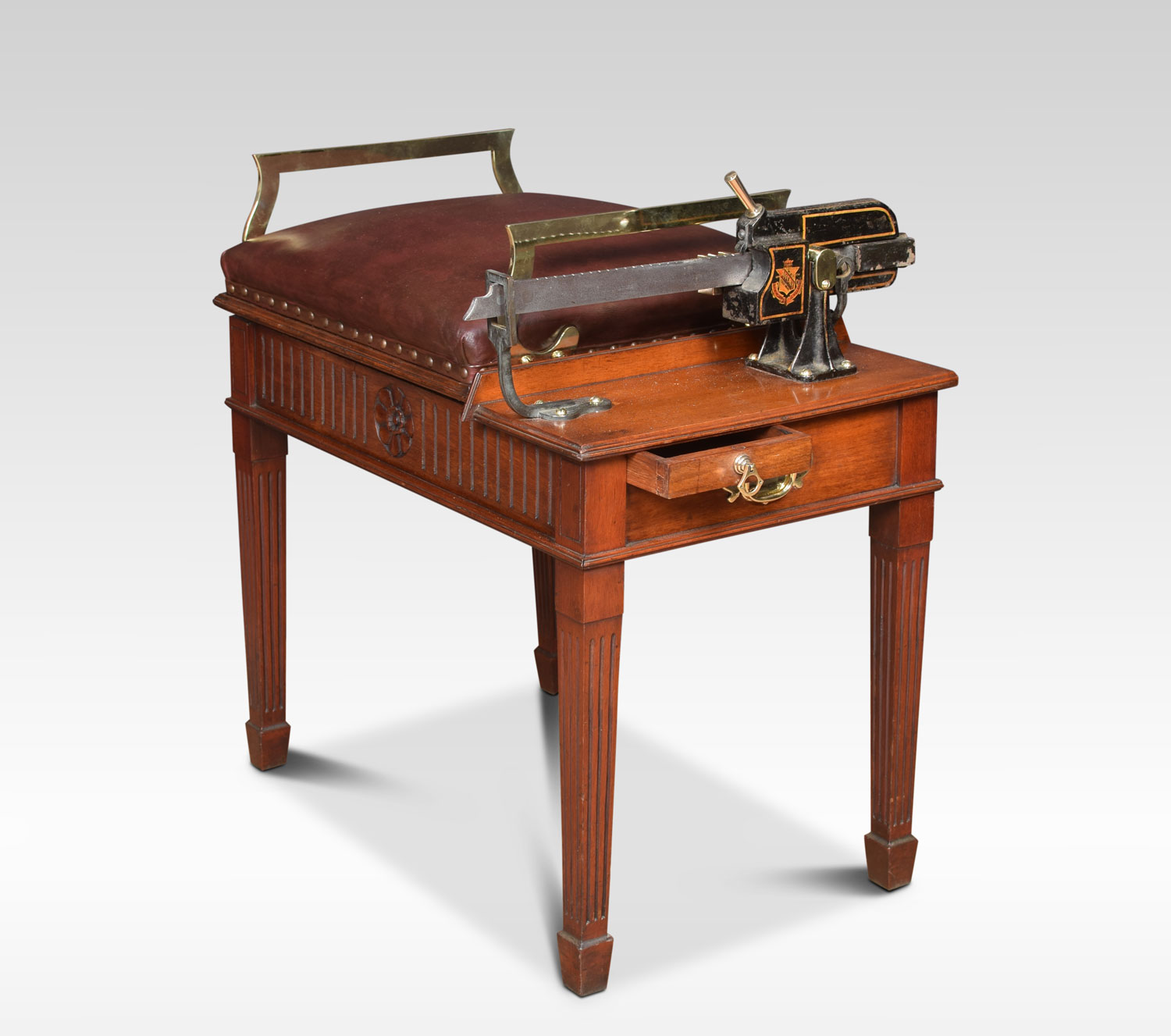 Avery Jockey scales the seat upholstered in leather above the mahogany base with carved frieze raised up on four square tapering fluted legs