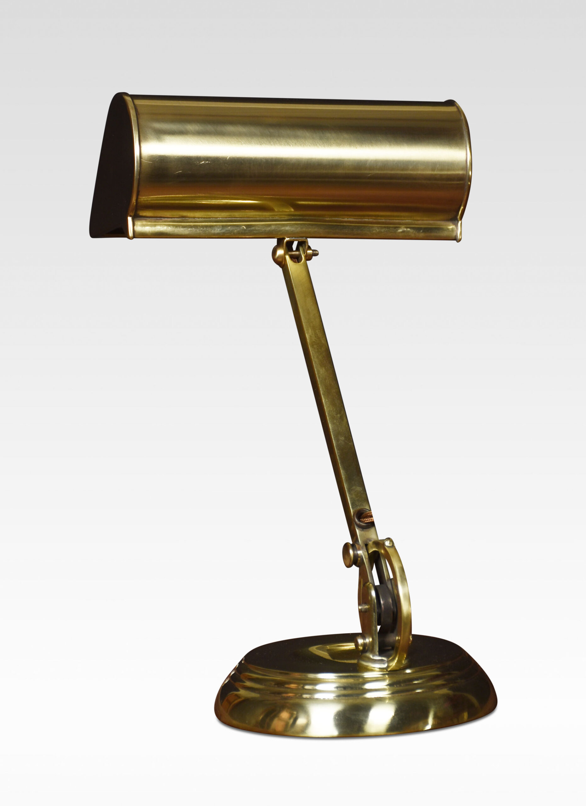 Bankers brass desk lamp, the shaped brass base, and pivoted sweeping arm supporting adjustable lampshade. The lamp has been rewired.