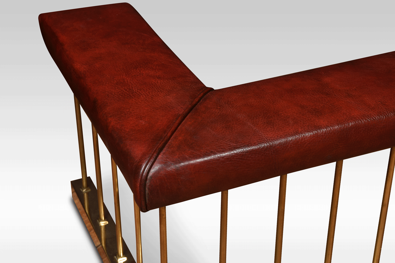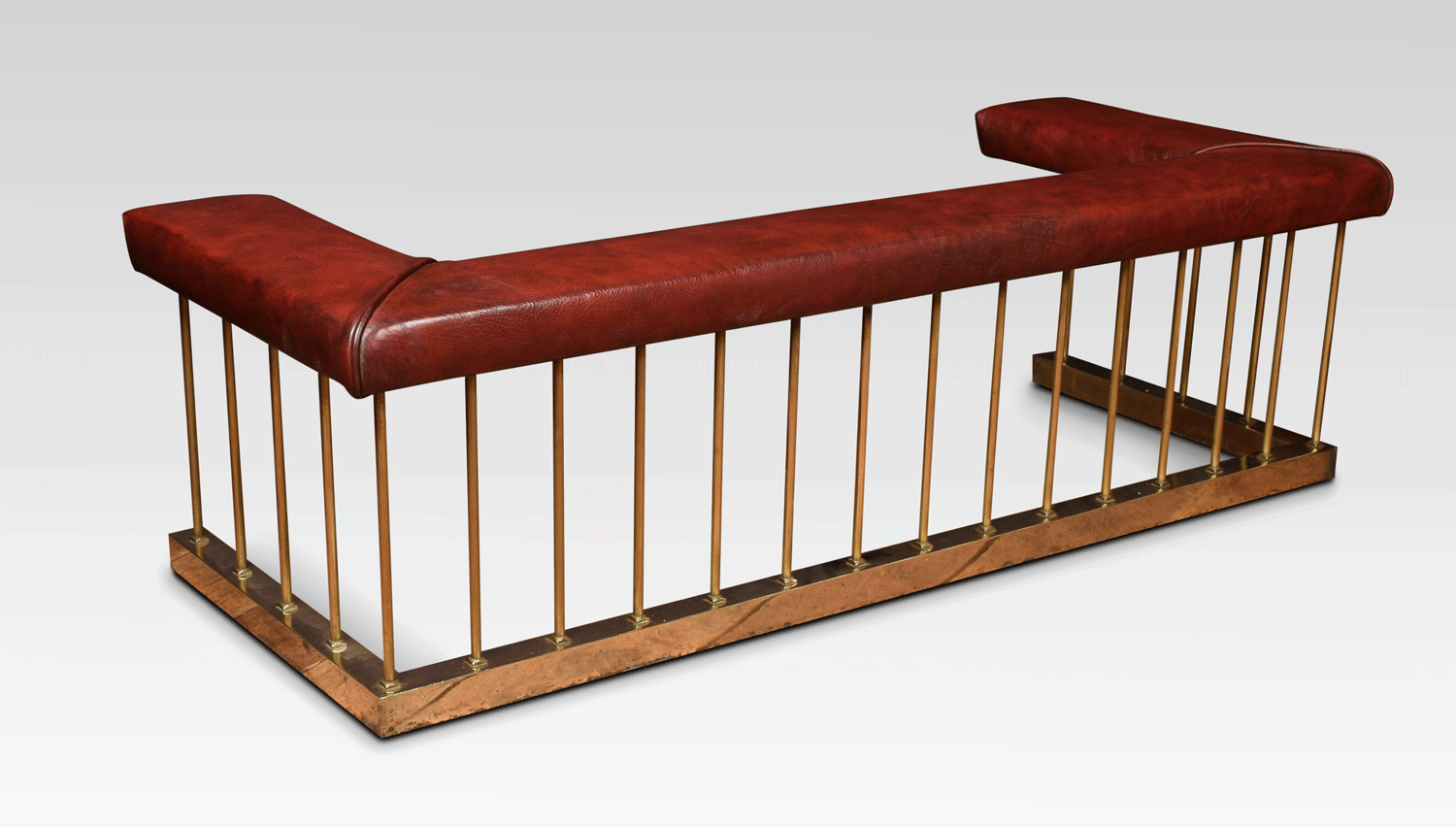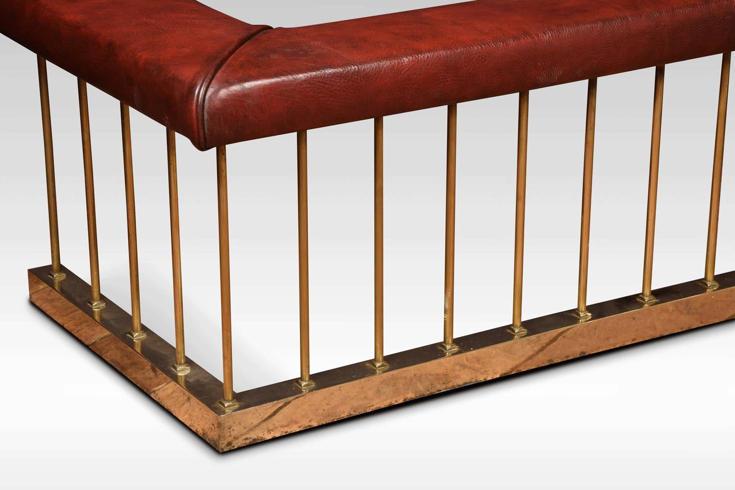 A brass club fender, the leather covered padded top on circular brass supports and raised on moulded plinth.