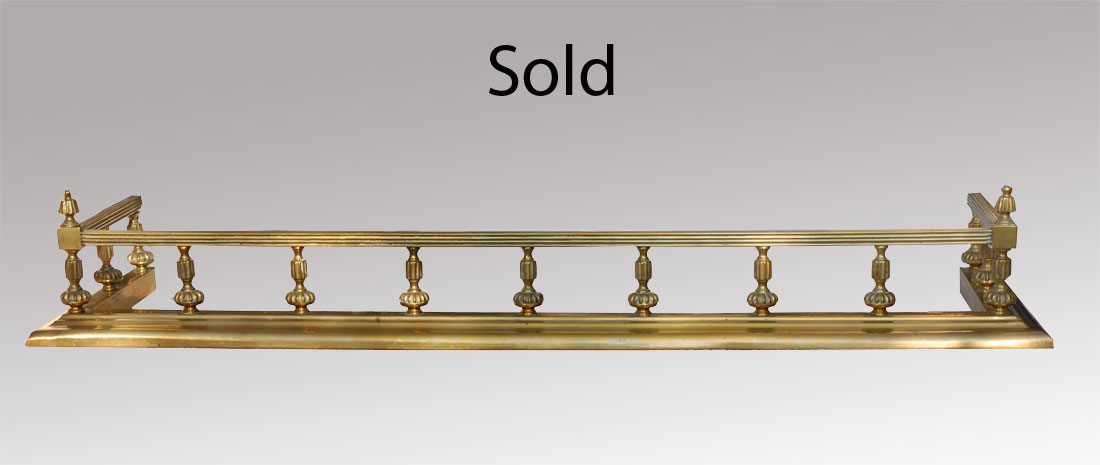 A brass fender, having square corners with finials and spindles, above the stepped base section,