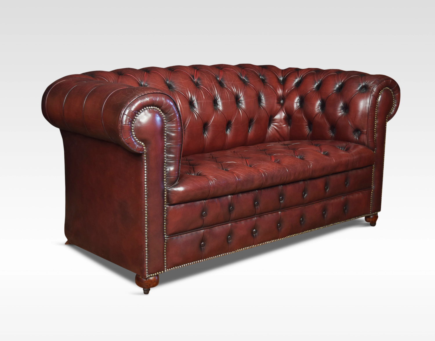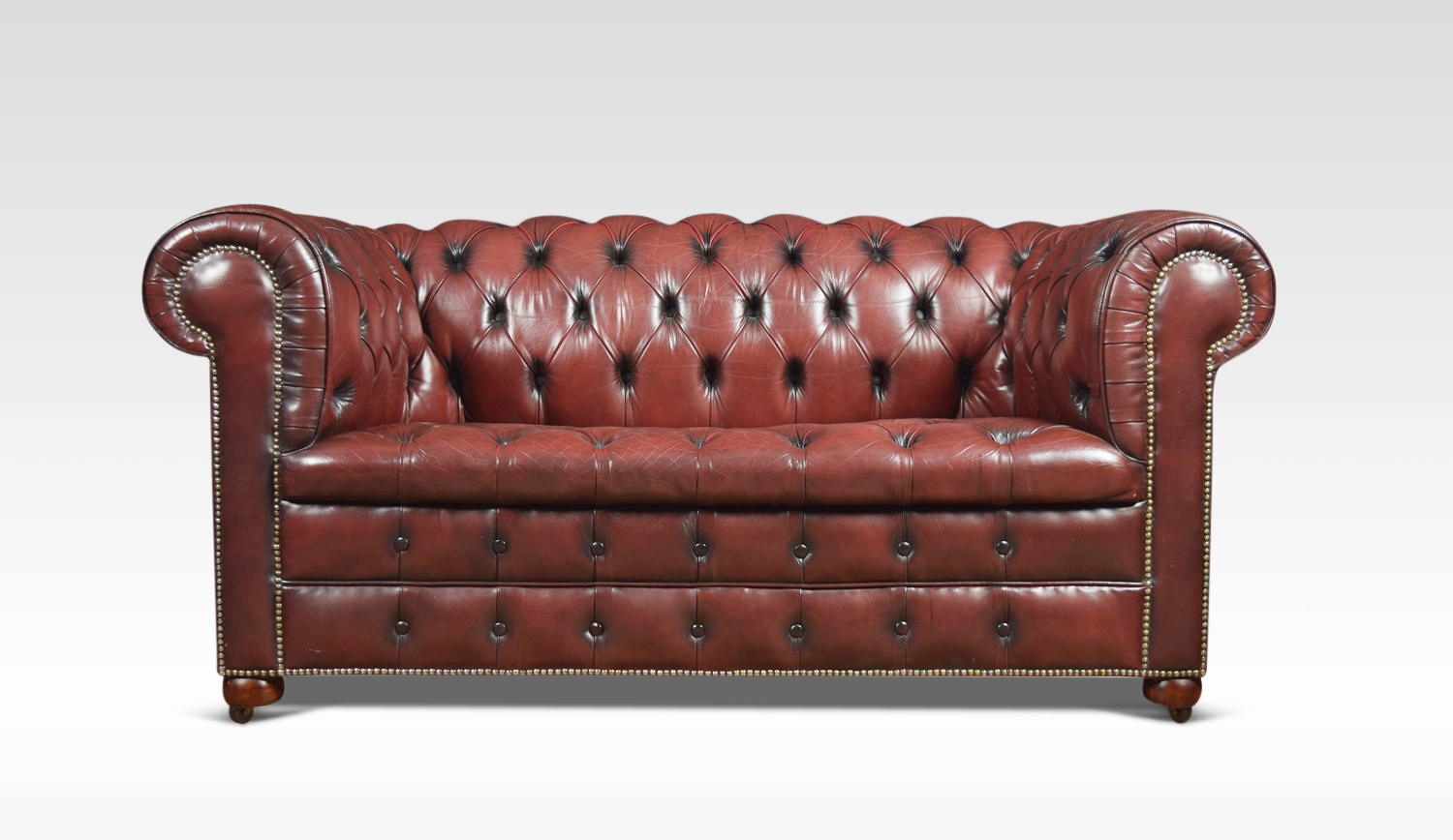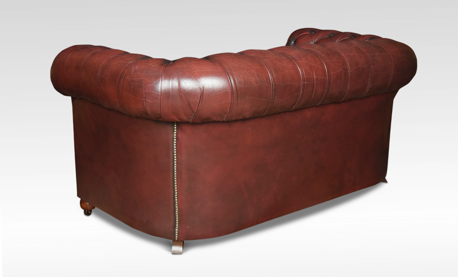 Burgundy Two seater vintage leather Chesterfield sofa on turned front legs with brass ceramic castors, with shaped feet to the back. Good solid condition, the leather is soft, nicely worn in with no rips or tears.