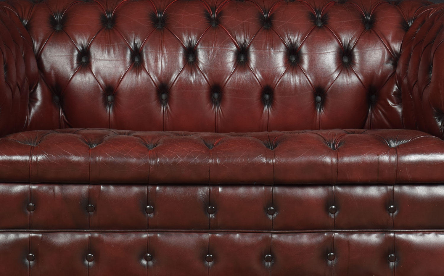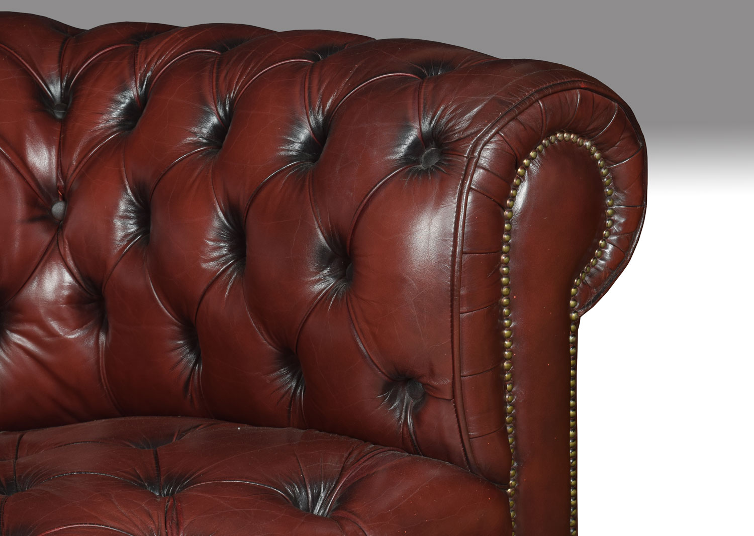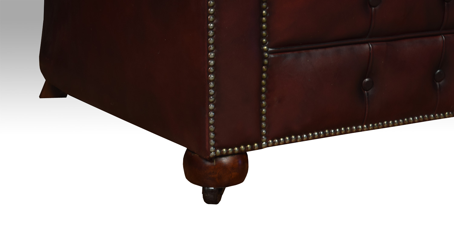 Burgundy Two seater vintage leather Chesterfield sofa on turned front legs with brass ceramic castors, with shaped feet to the back. Good solid condition, the leather is soft, nicely worn in with no rips or tears.