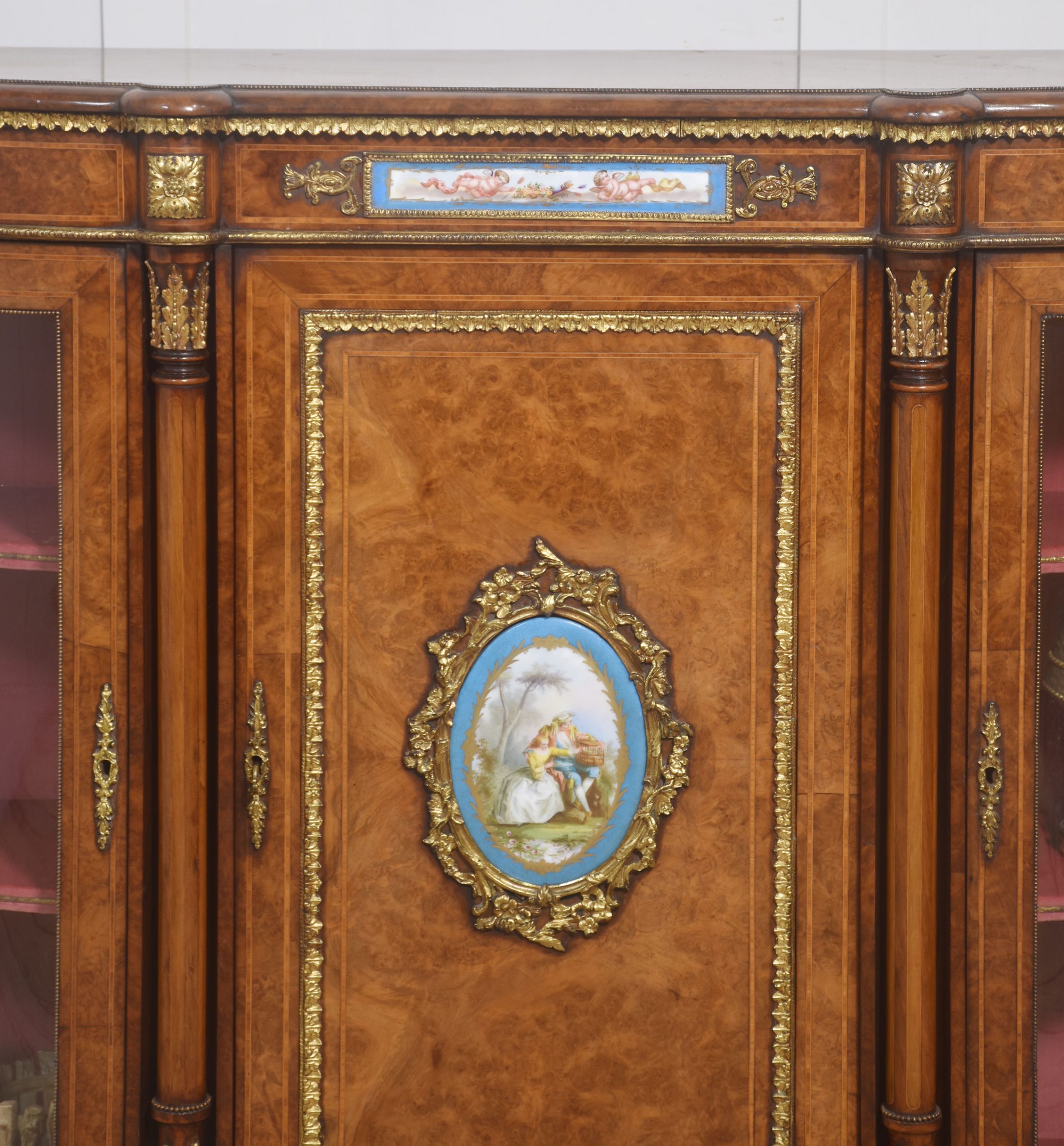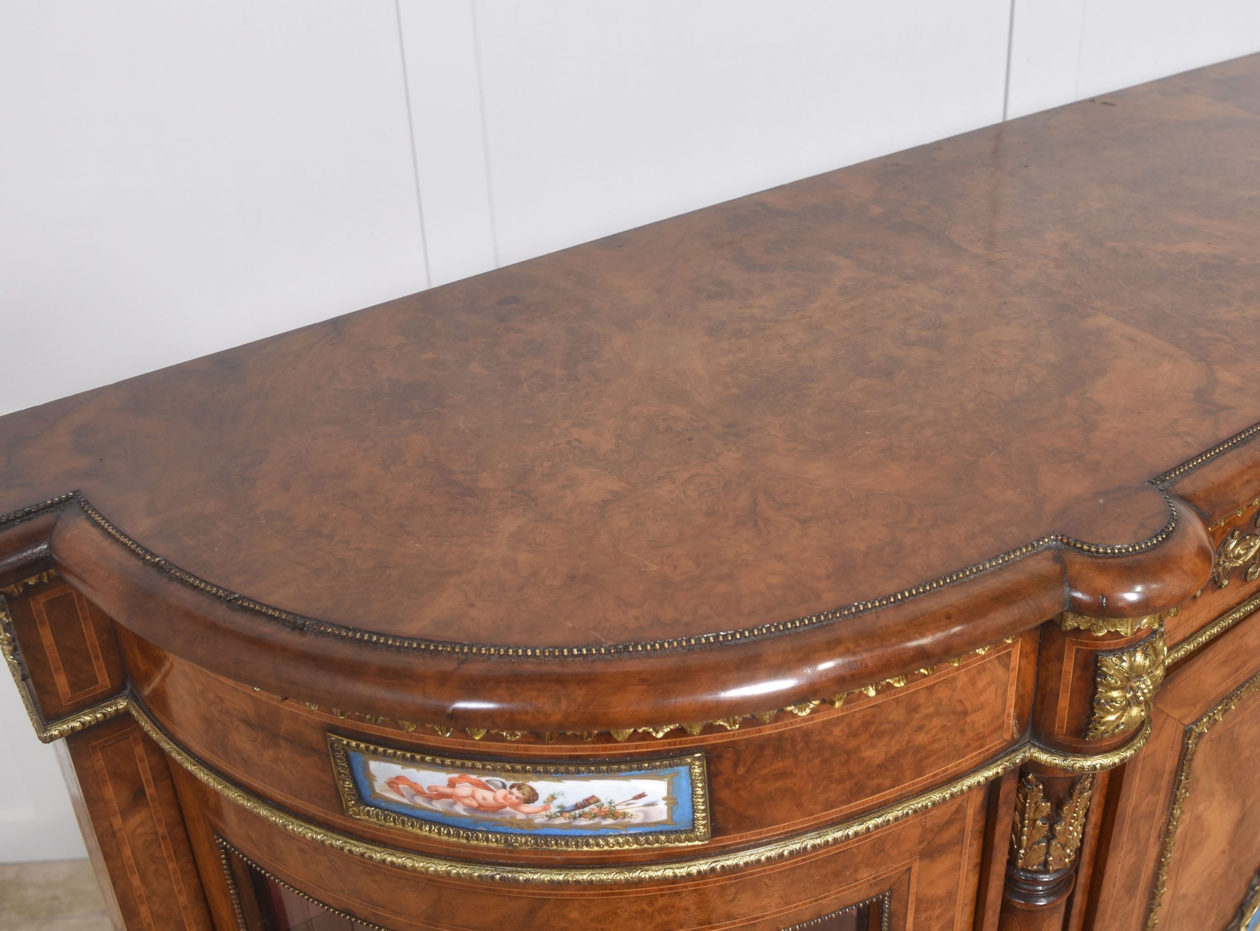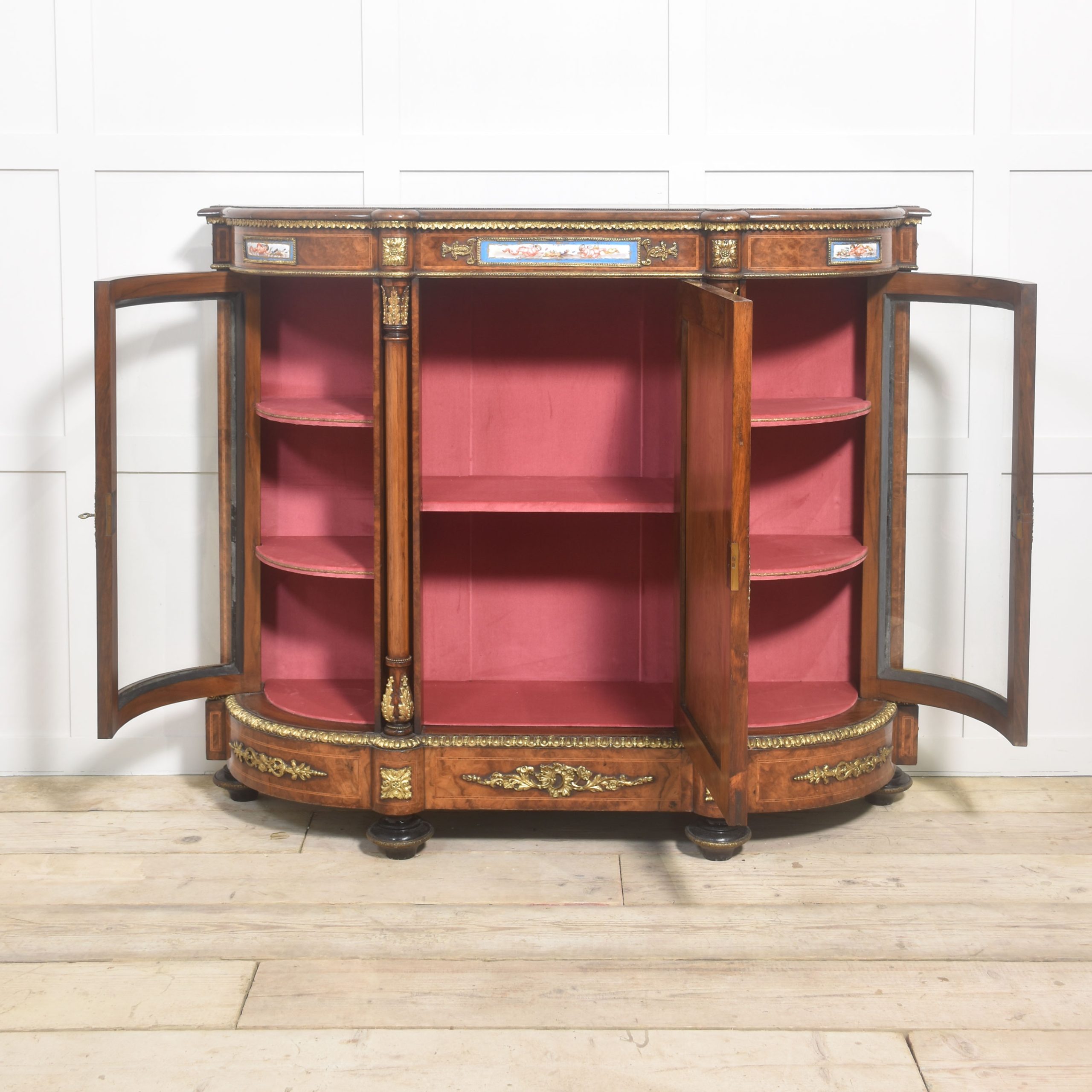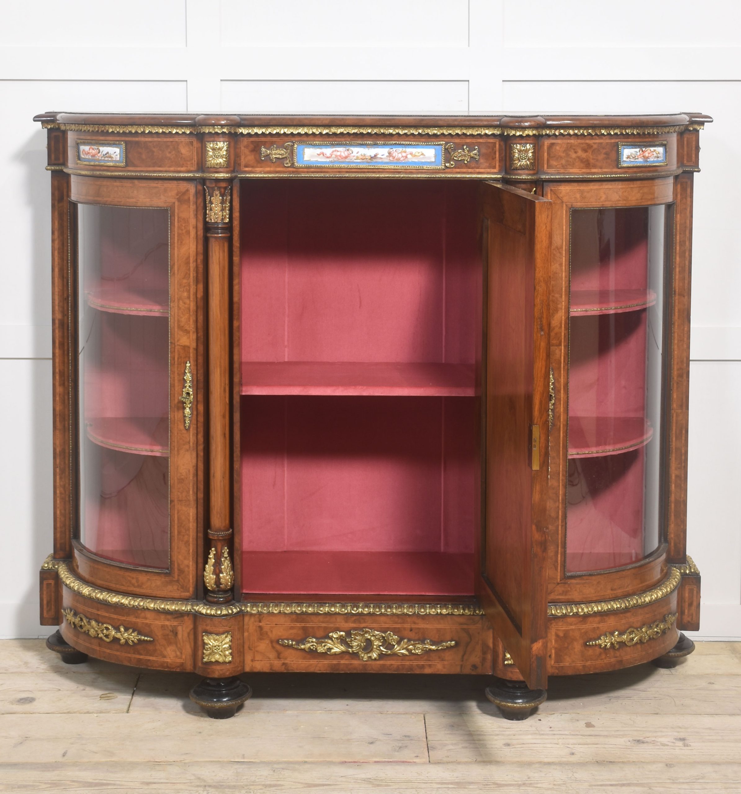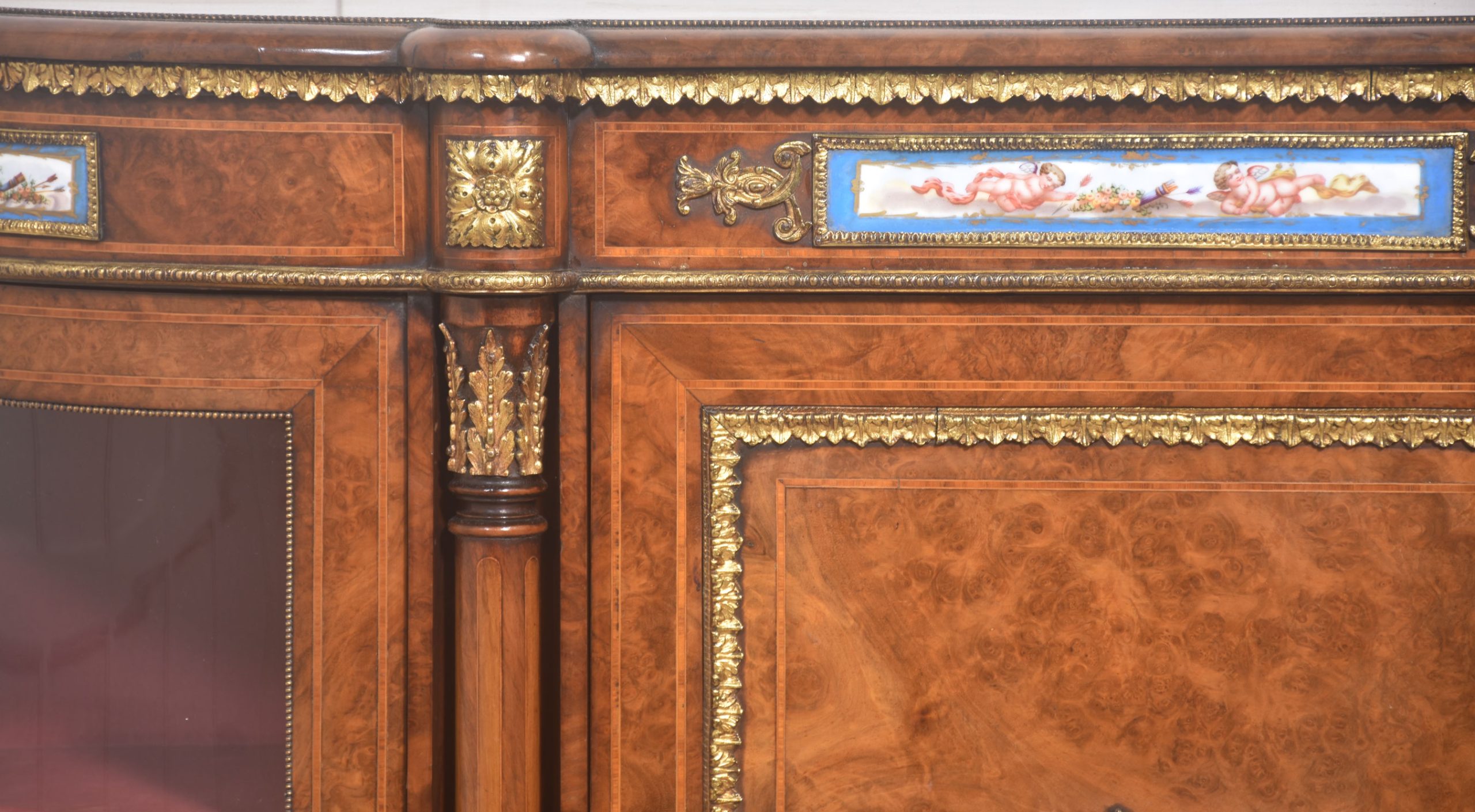 Brass mounted walnut credenza, the well figured top having a moulded edge. Above a central door with Sevres porcelain oval panel flanked by fluted pilasters. The ends fitted with bowed glazed doors enclosing velvet-lined shelves. All raised up on short ebonized bun feet.