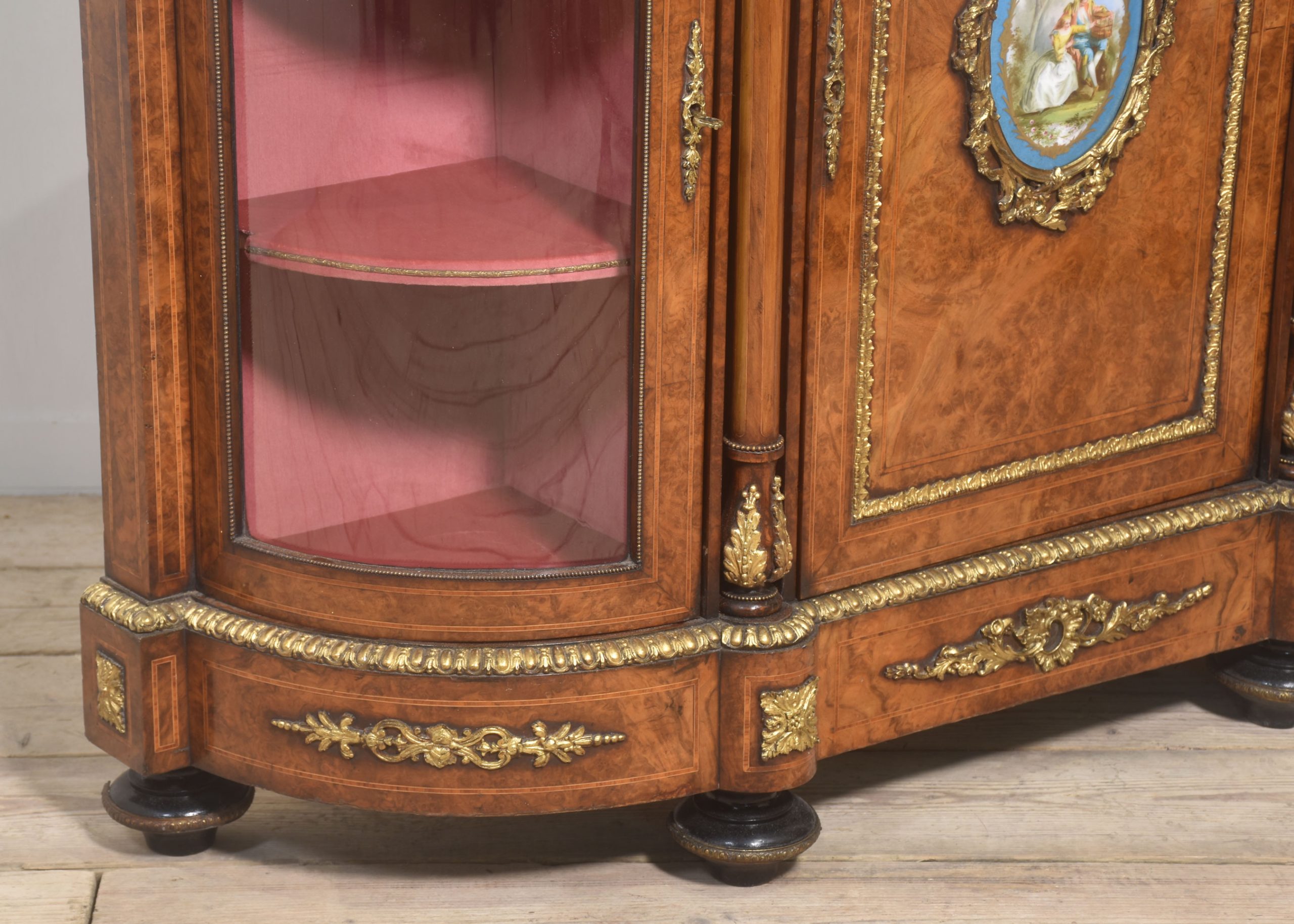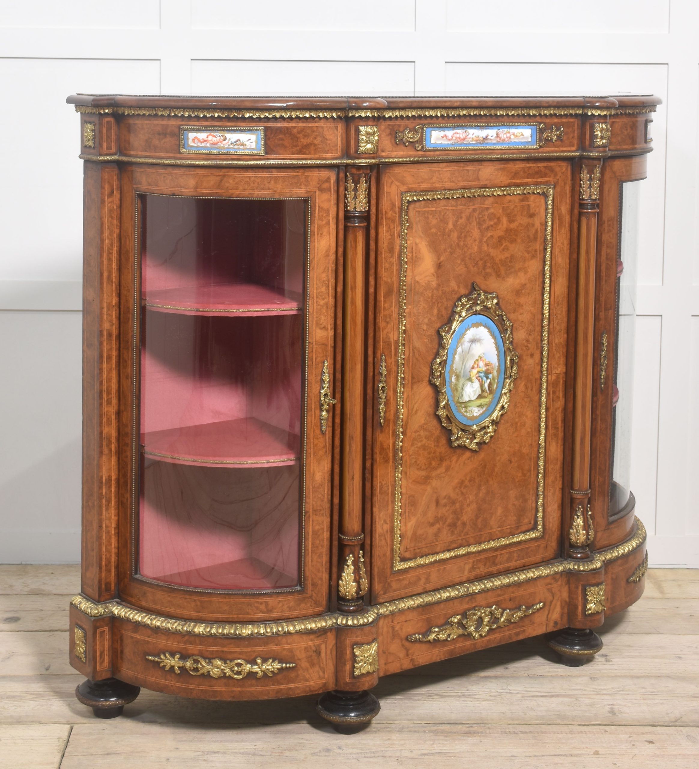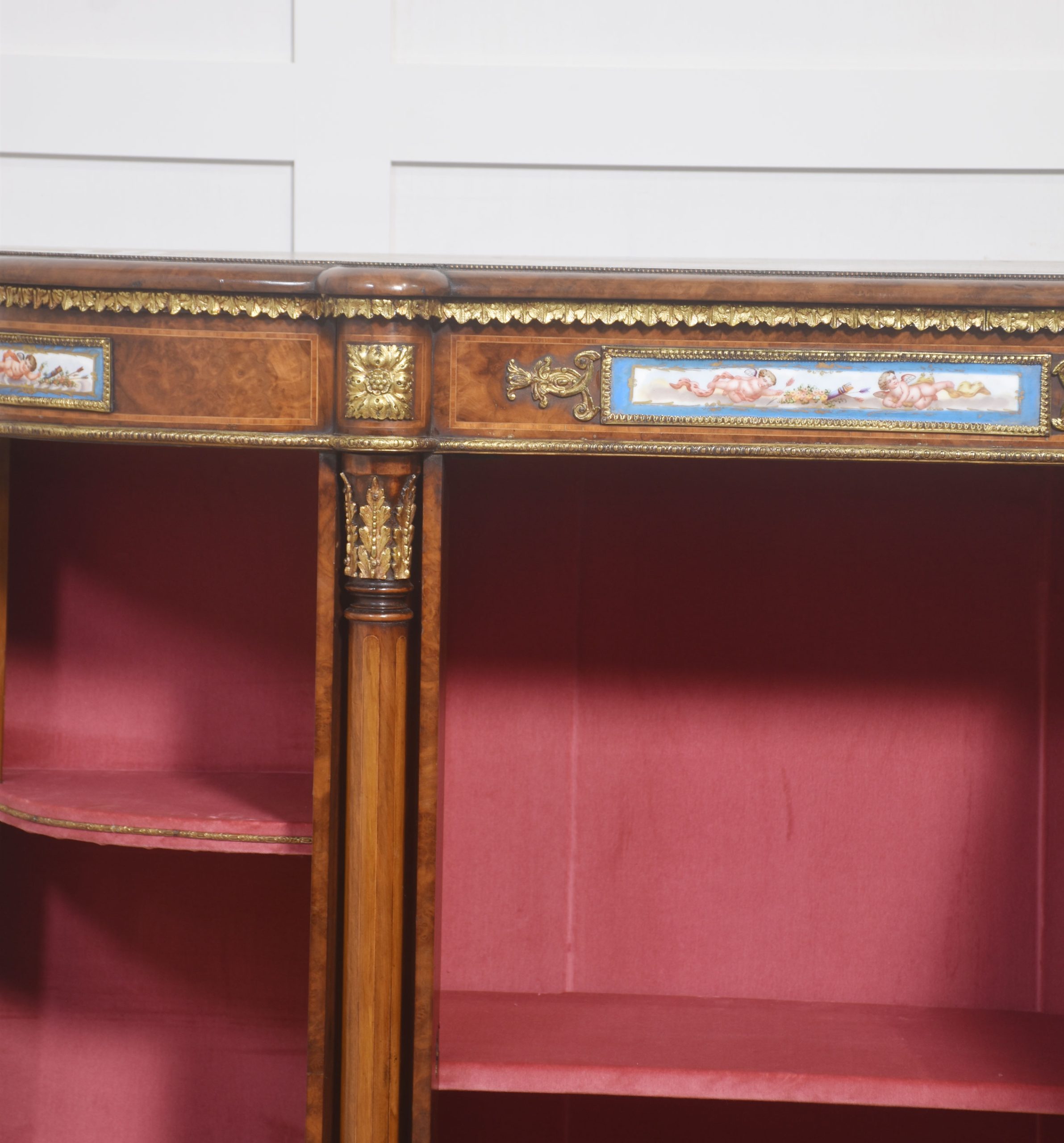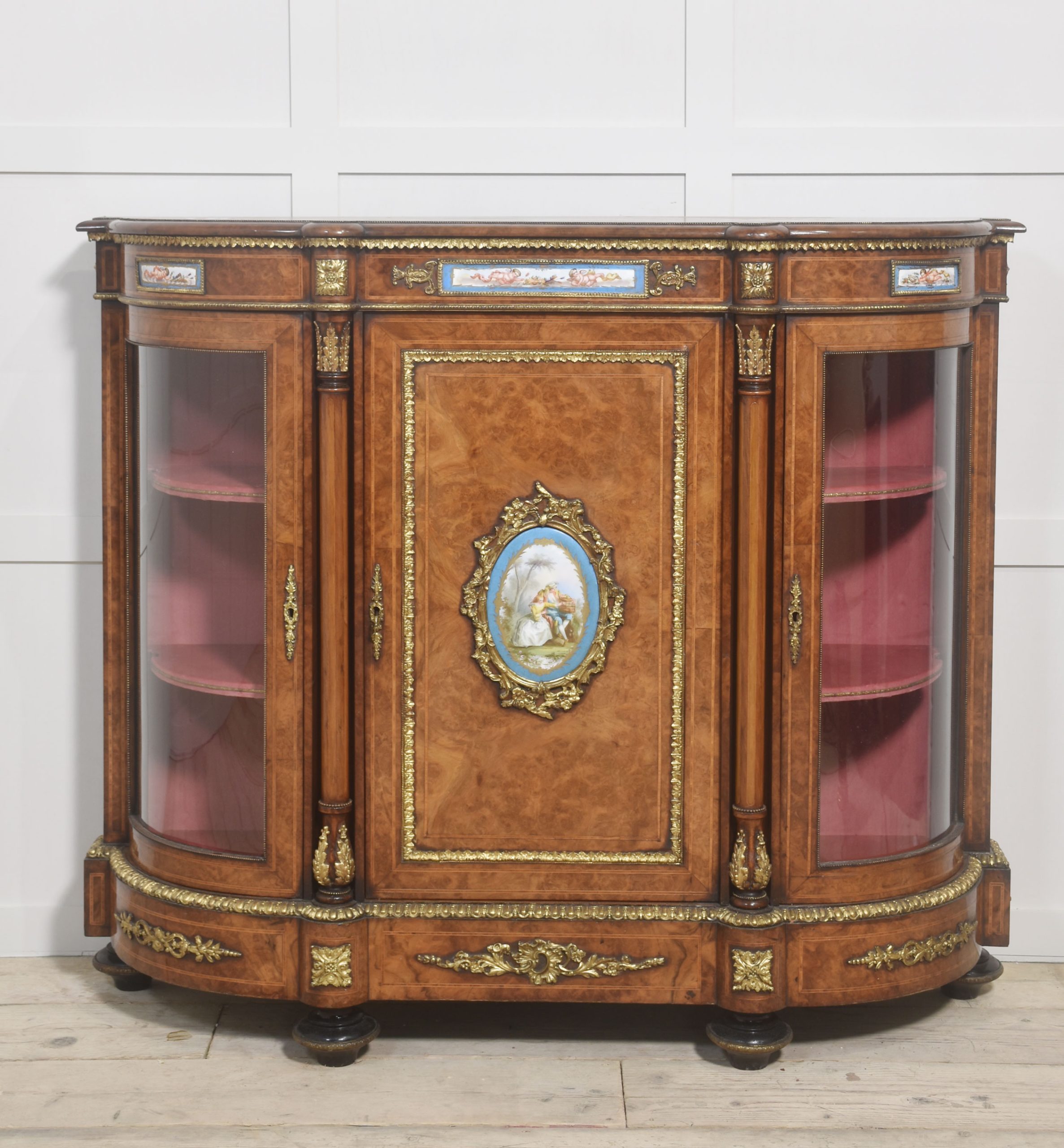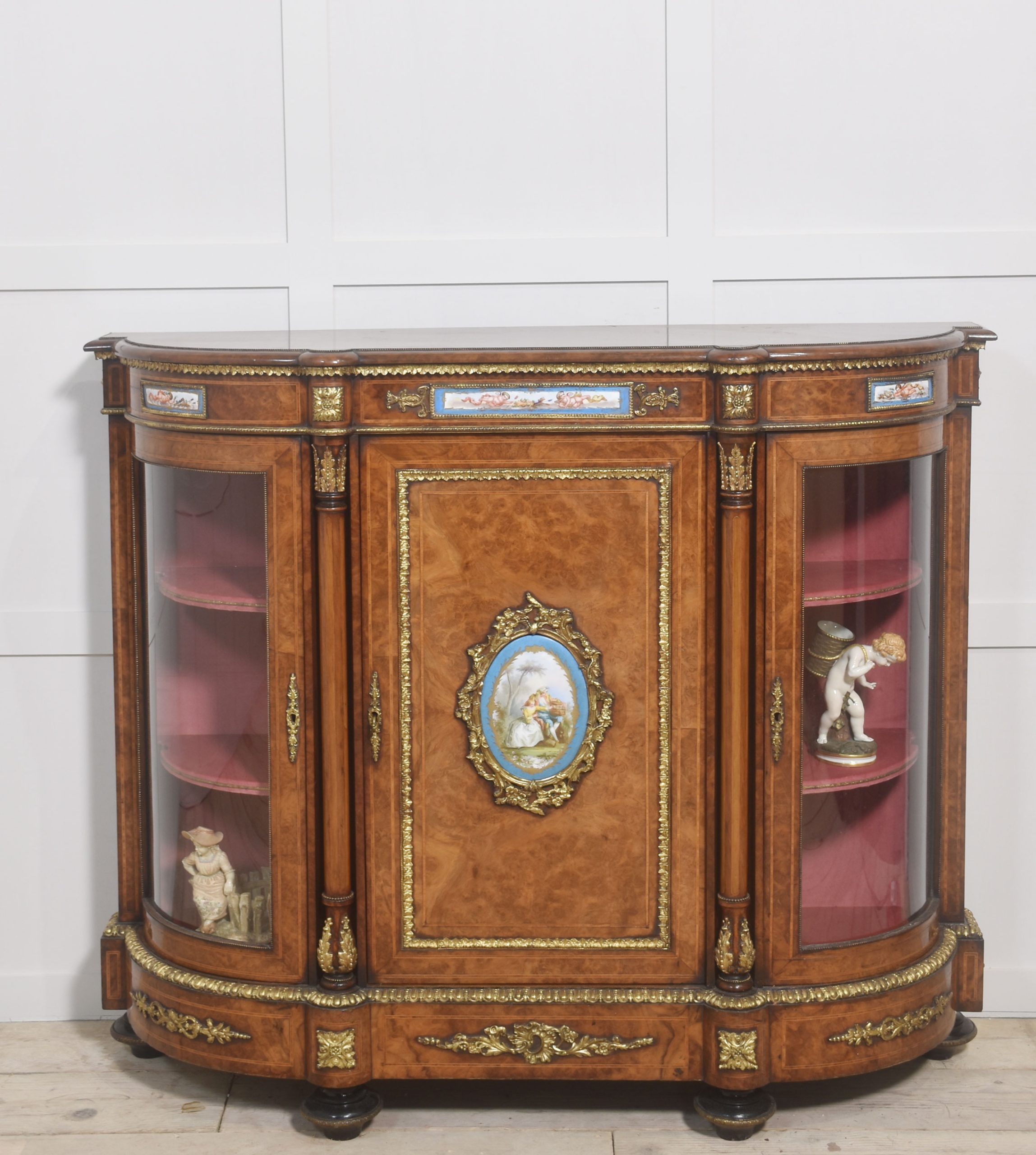 Brass mounted walnut credenza, the well figured top having a moulded edge. Above a central door with Sevres porcelain oval panel flanked by fluted pilasters. The ends fitted with bowed glazed doors enclosing velvet-lined shelves. All raised up on short ebonized bun feet.
