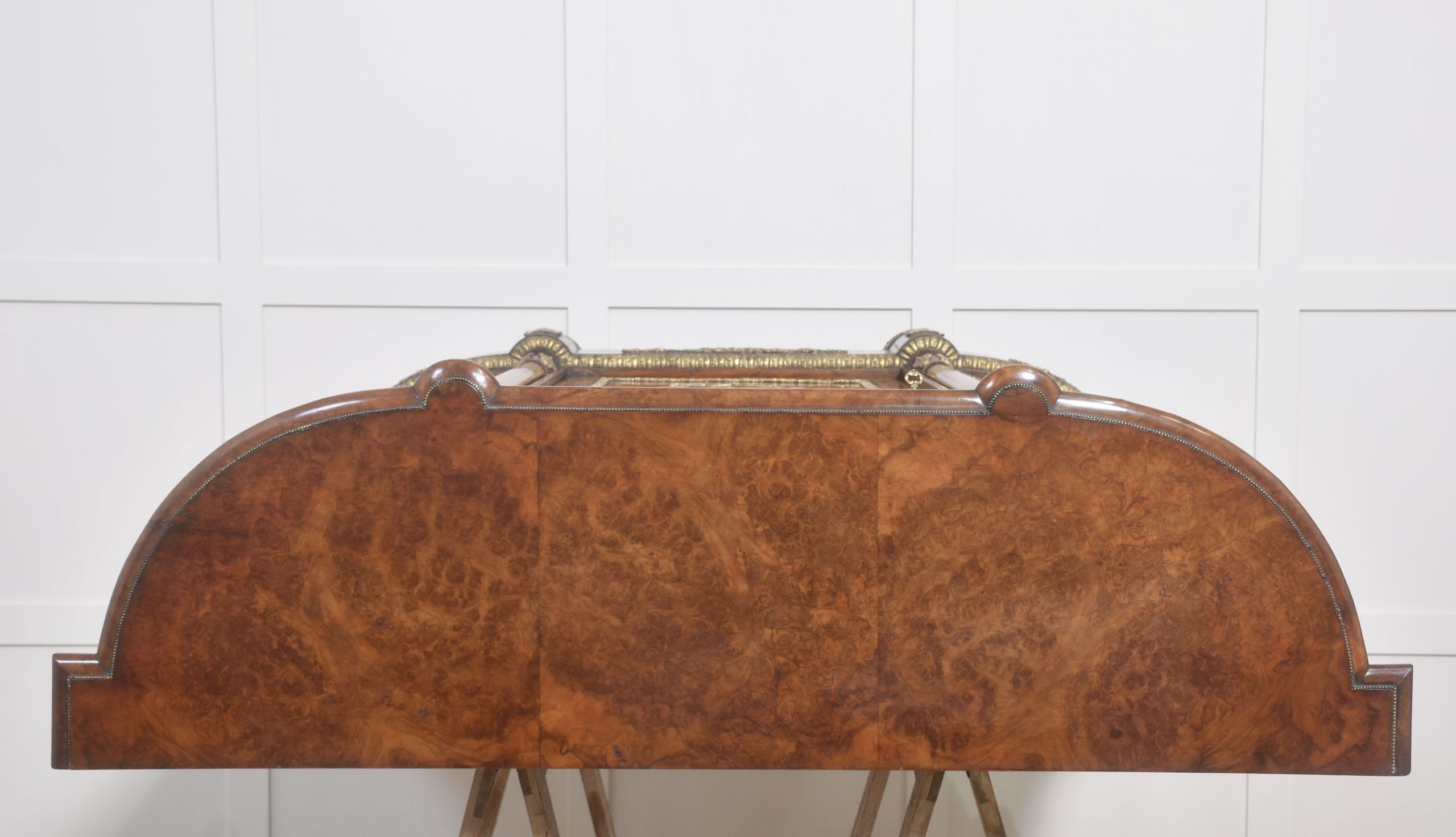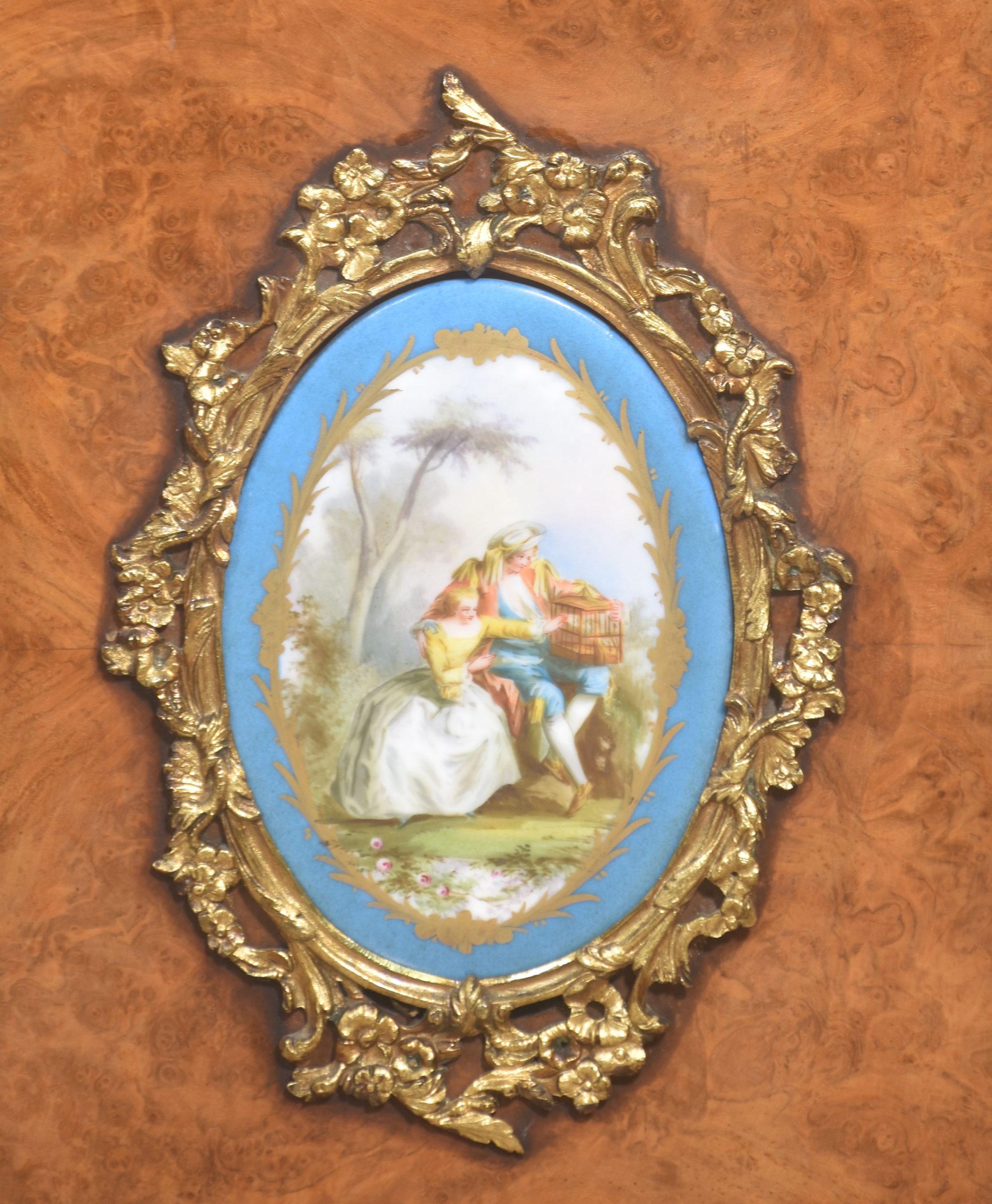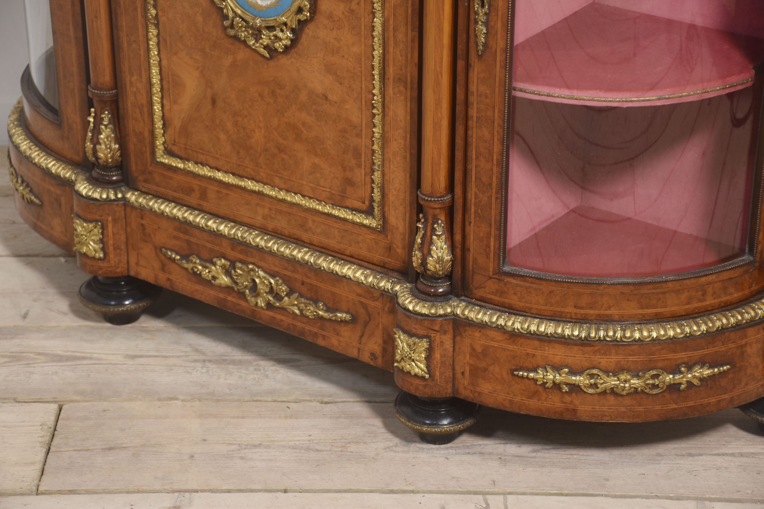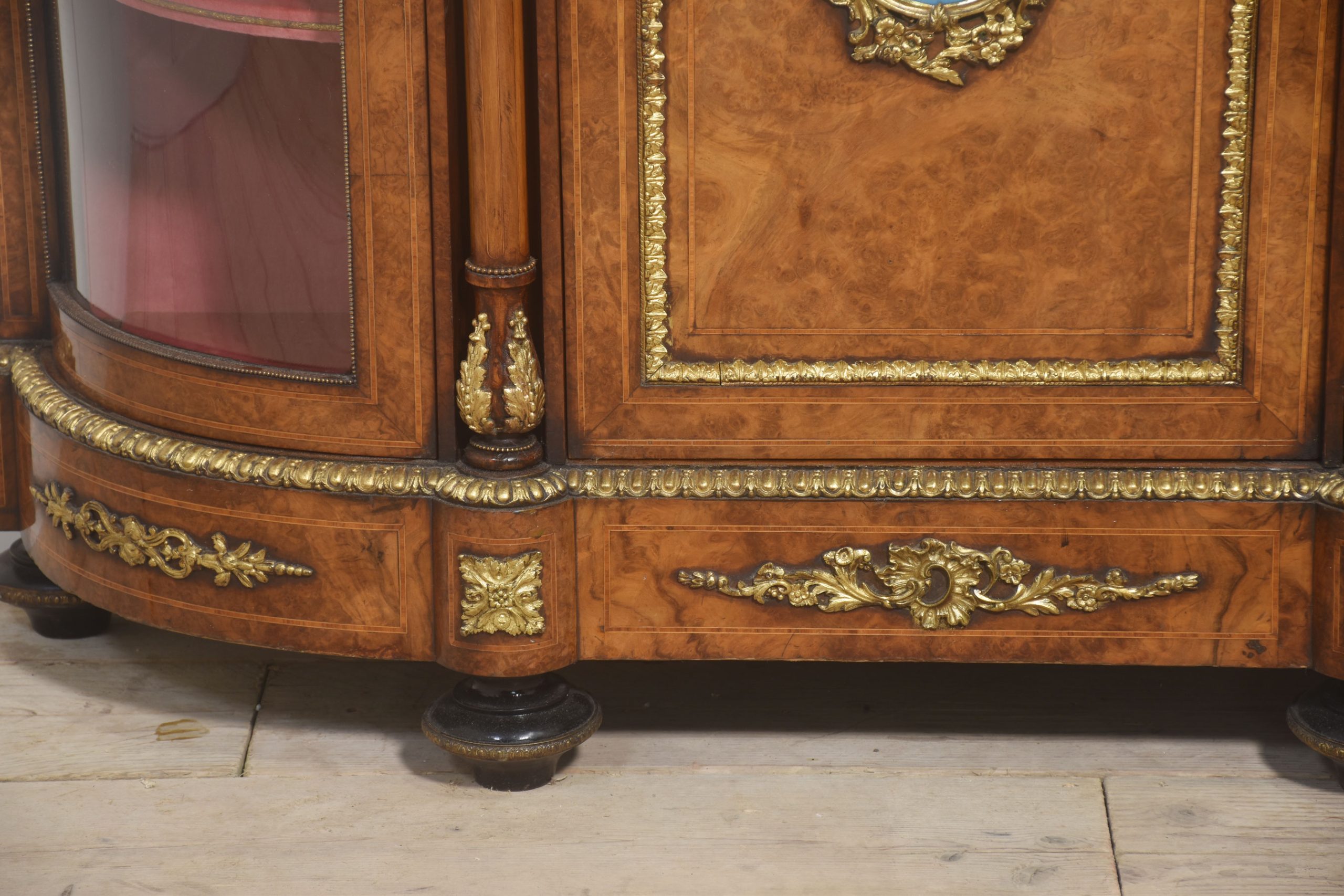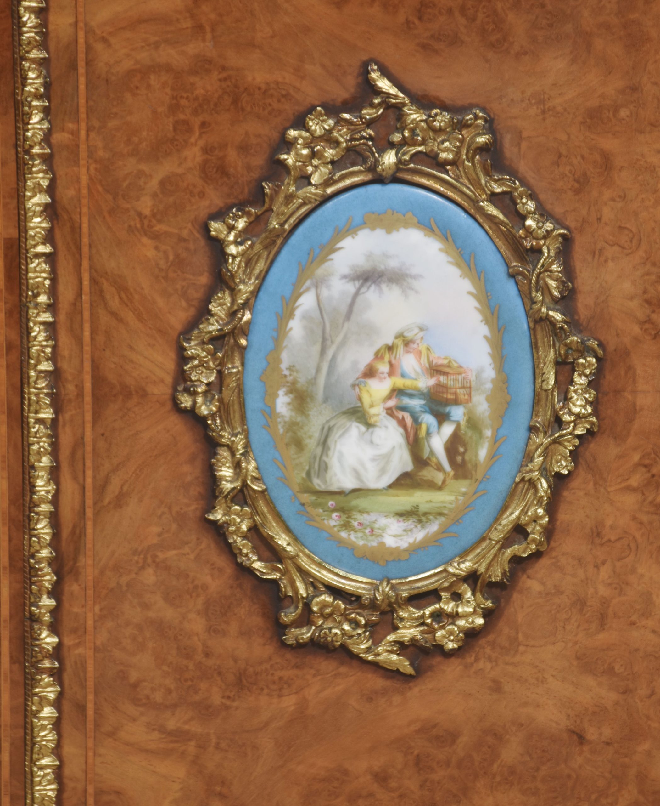 Brass mounted walnut credenza, the well figured top having a moulded edge. Above a central door with Sevres porcelain oval panel flanked by fluted pilasters. The ends fitted with bowed glazed doors enclosing velvet-lined shelves. All raised up on short ebonized bun feet.