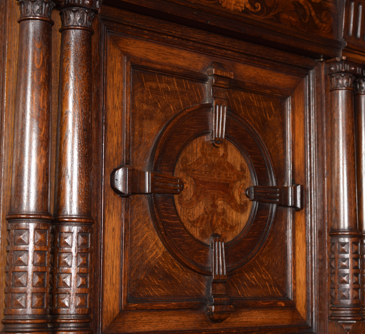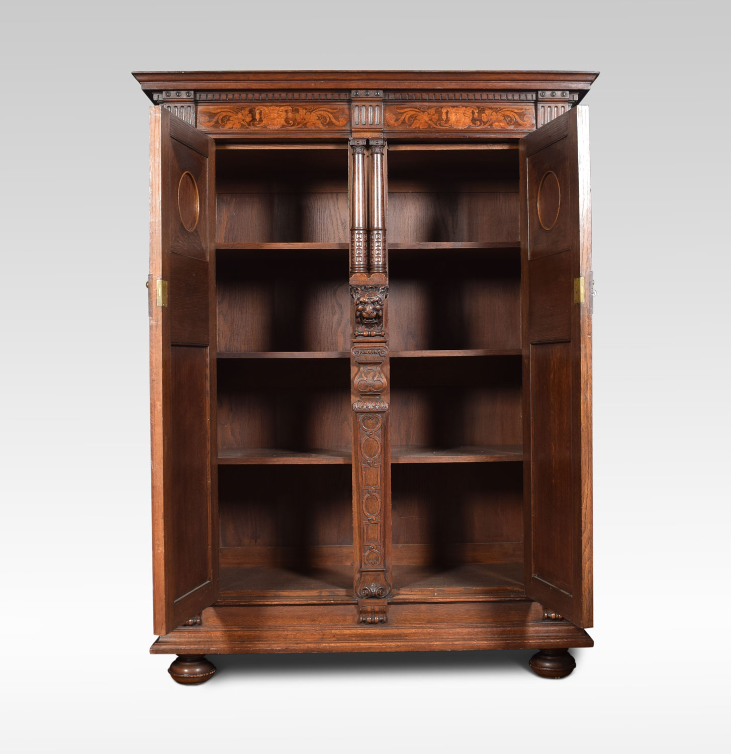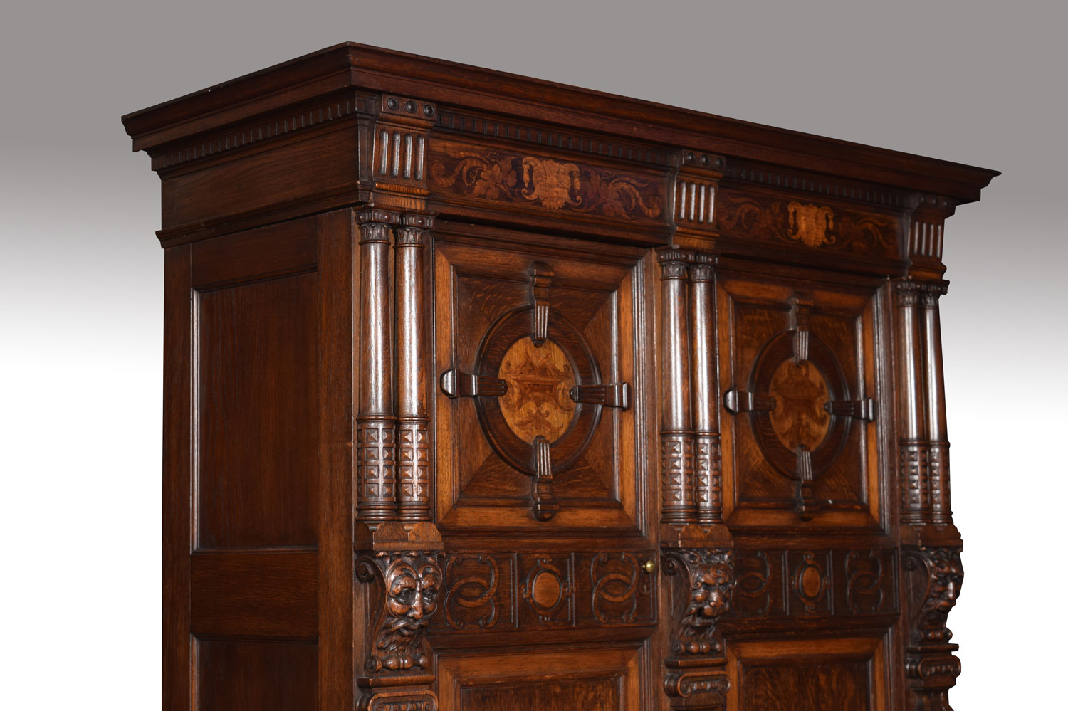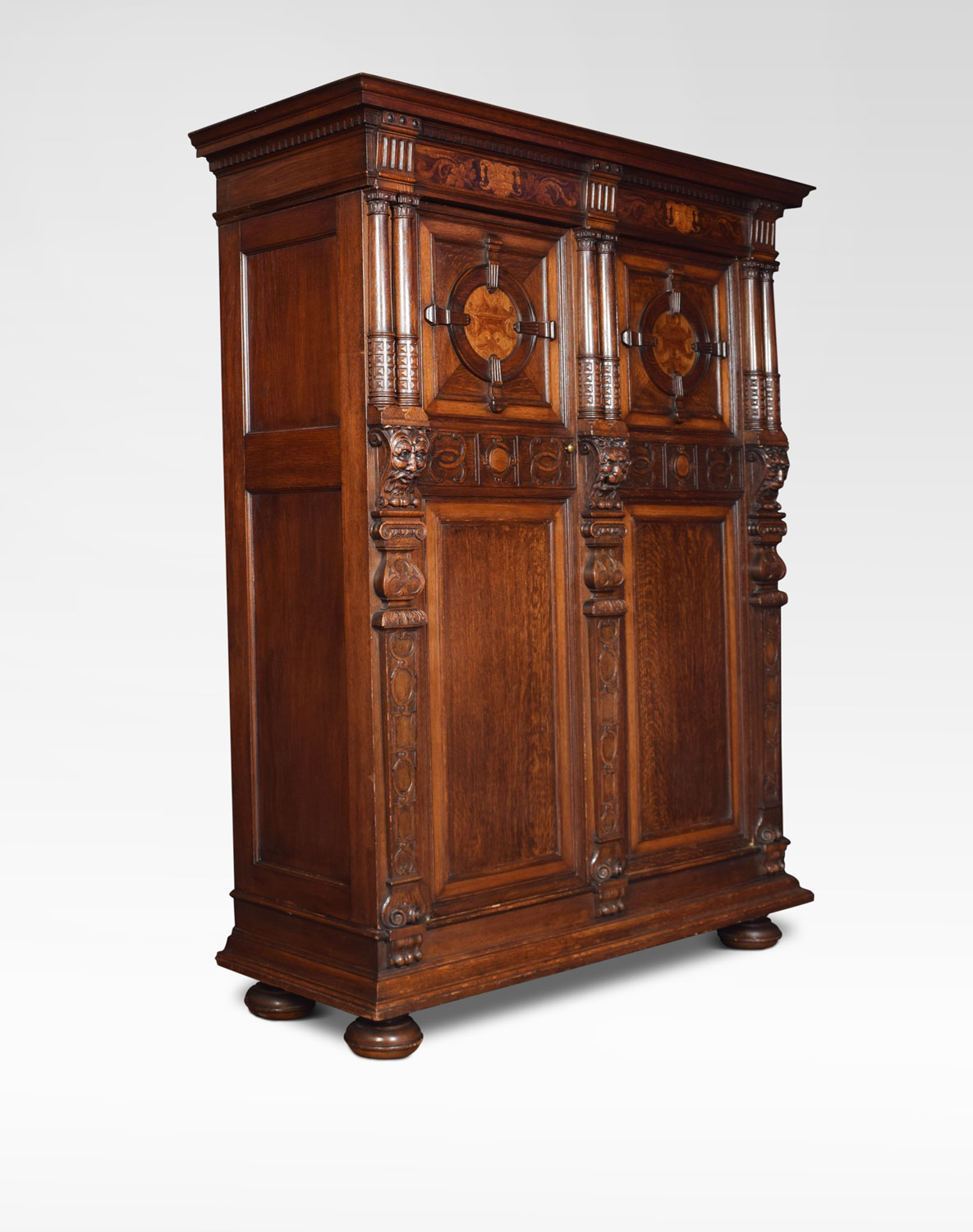Oak cupboard, having dentil moulded cornice above scrolling floral and maquetry inlaid freeze. The two large panelled cupboard doors opening to reveal adjustable shelved interior. Flanked by carved and moulded pilasters and mask mounts. All raised up on bun feet.
