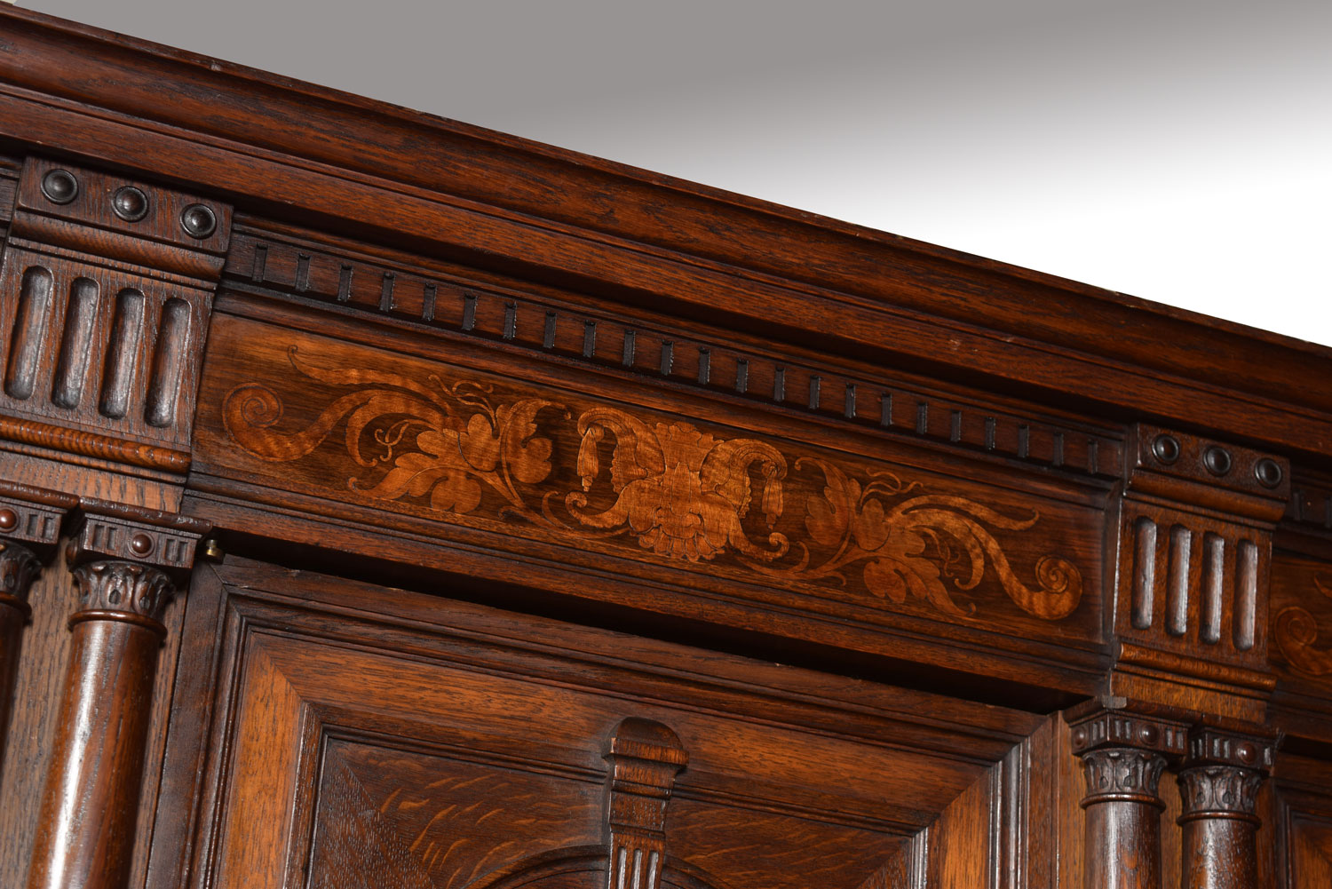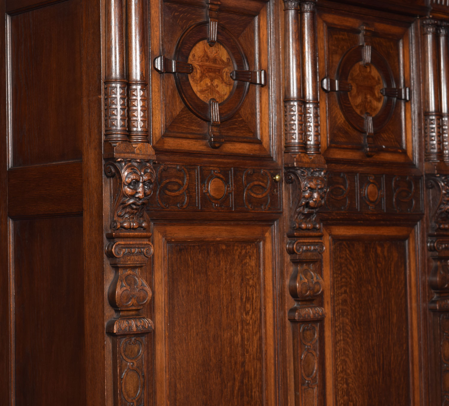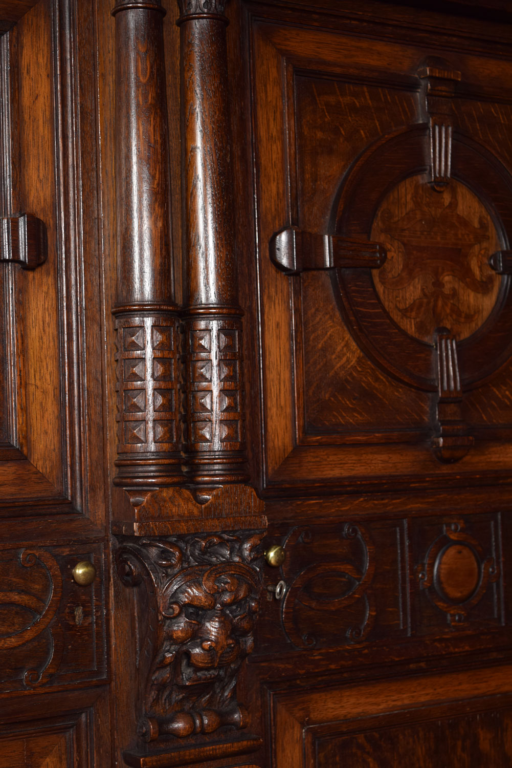 Oak cupboard, having dentil moulded cornice above scrolling floral and maquetry inlaid freeze. The two large panelled cupboard doors opening to reveal adjustable shelved interior. Flanked by carved and moulded pilasters and mask mounts. All raised up on bun feet.