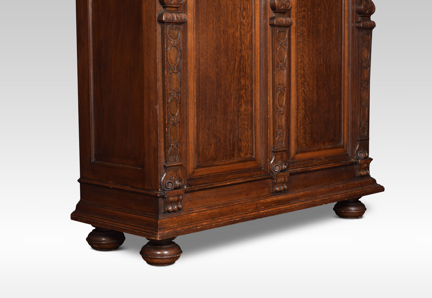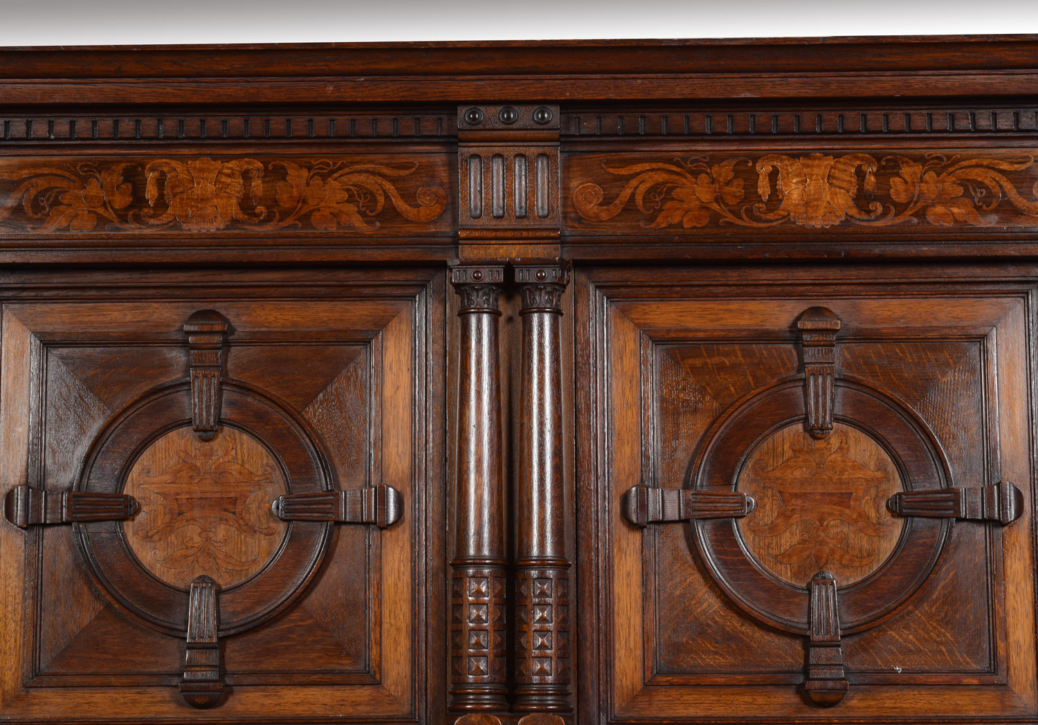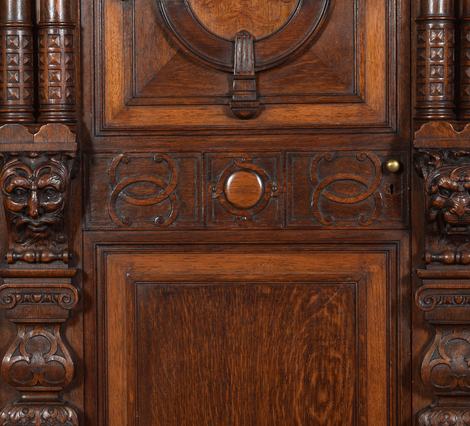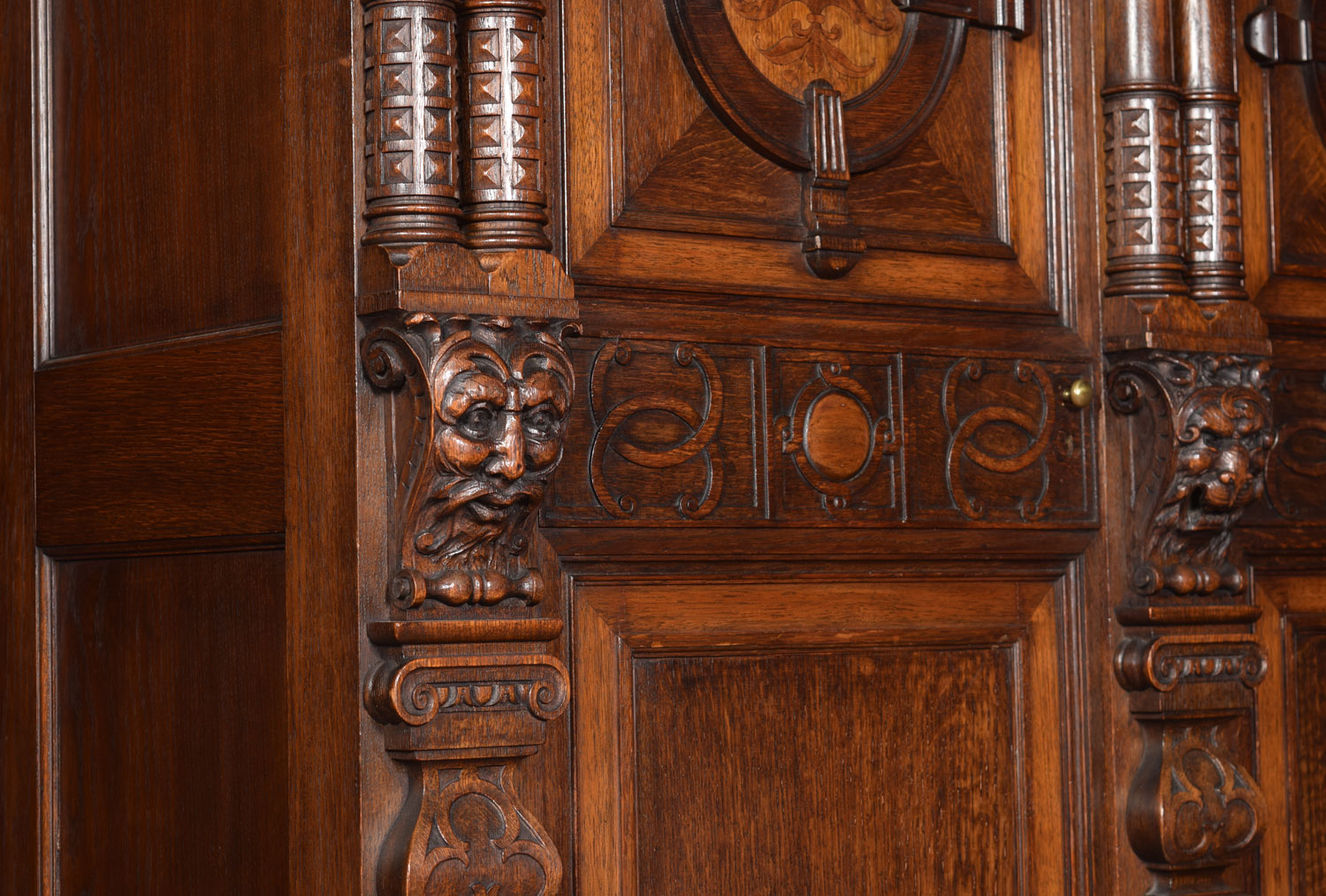 Oak cupboard, having dentil moulded cornice above scrolling floral and maquetry inlaid freeze. The two large panelled cupboard doors opening to reveal adjustable shelved interior. Flanked by carved and moulded pilasters and mask mounts. All raised up on bun feet.