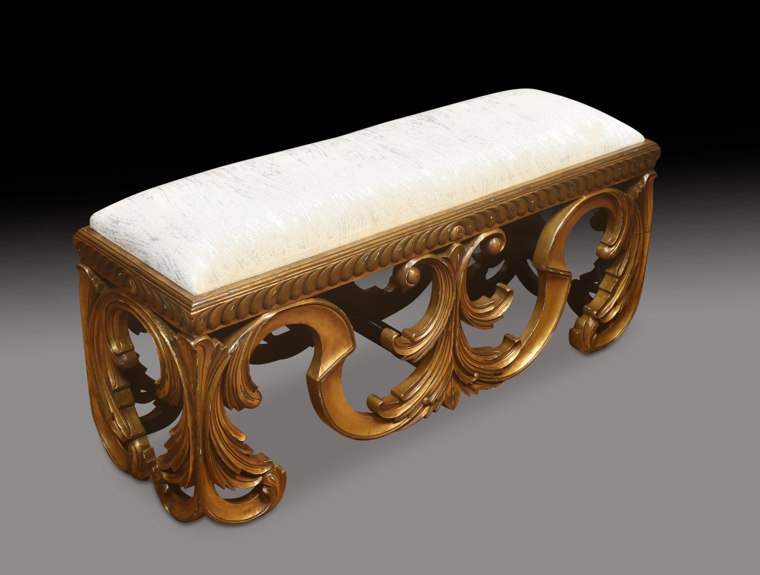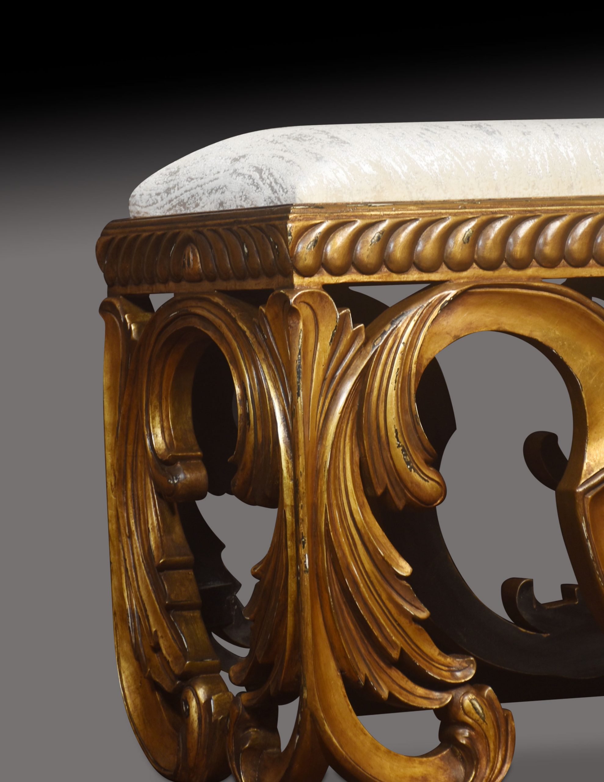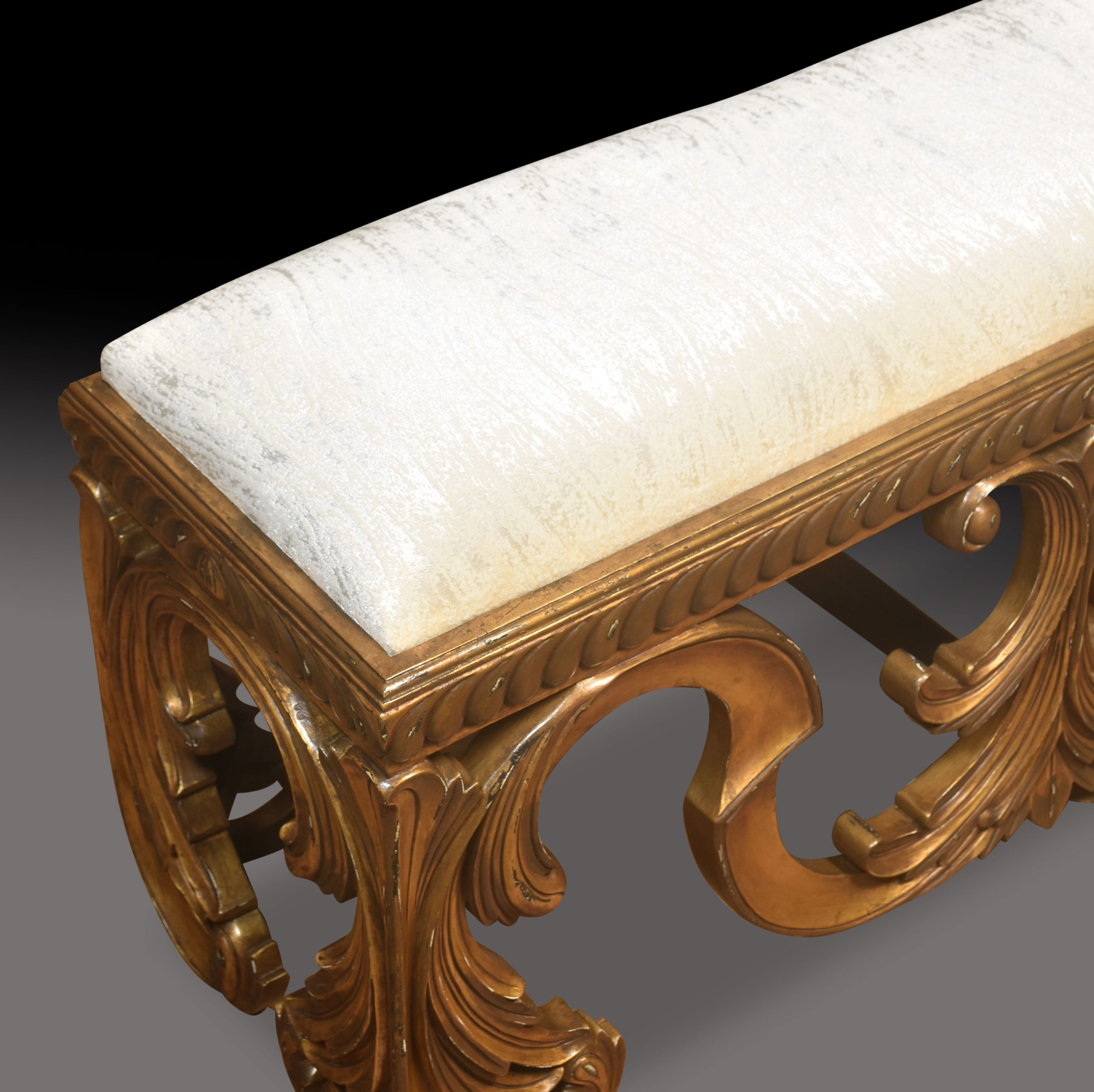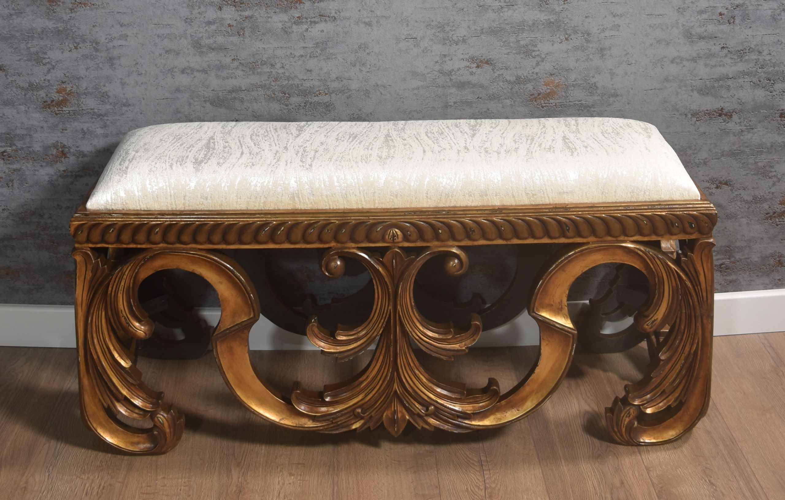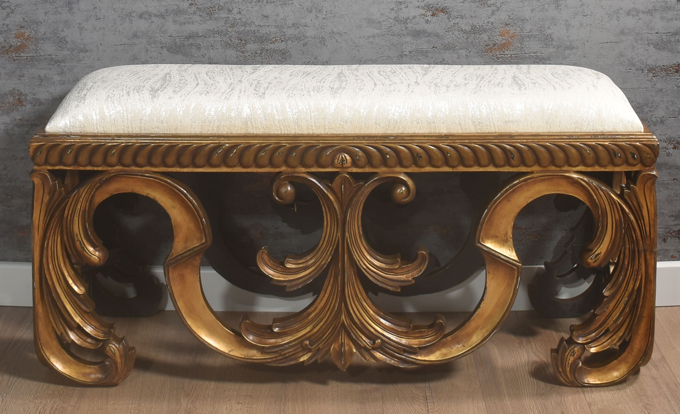 Carved giltwood dressing table stool, the upholstered cushion of rectangular form, to the moulded freeze raised up on scrolling base.