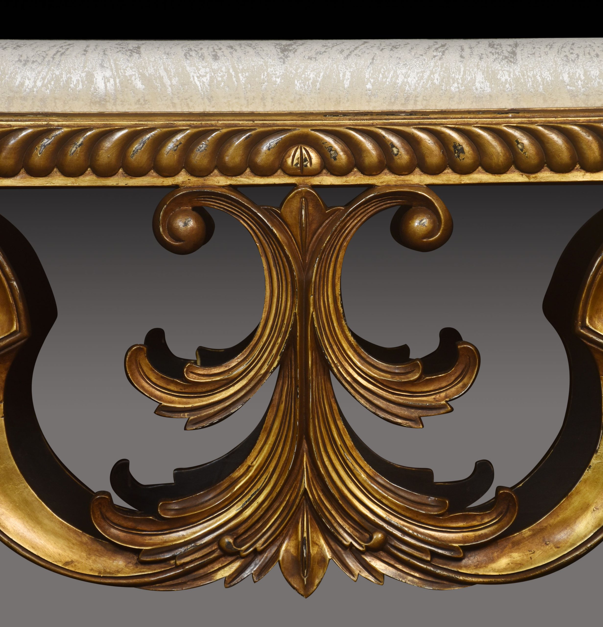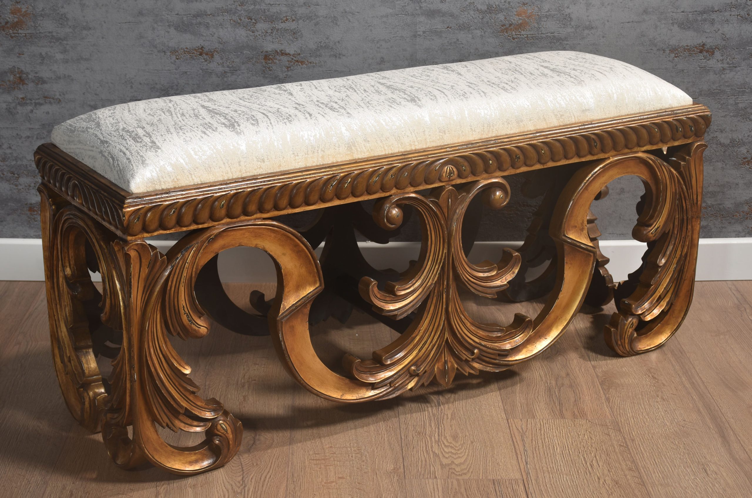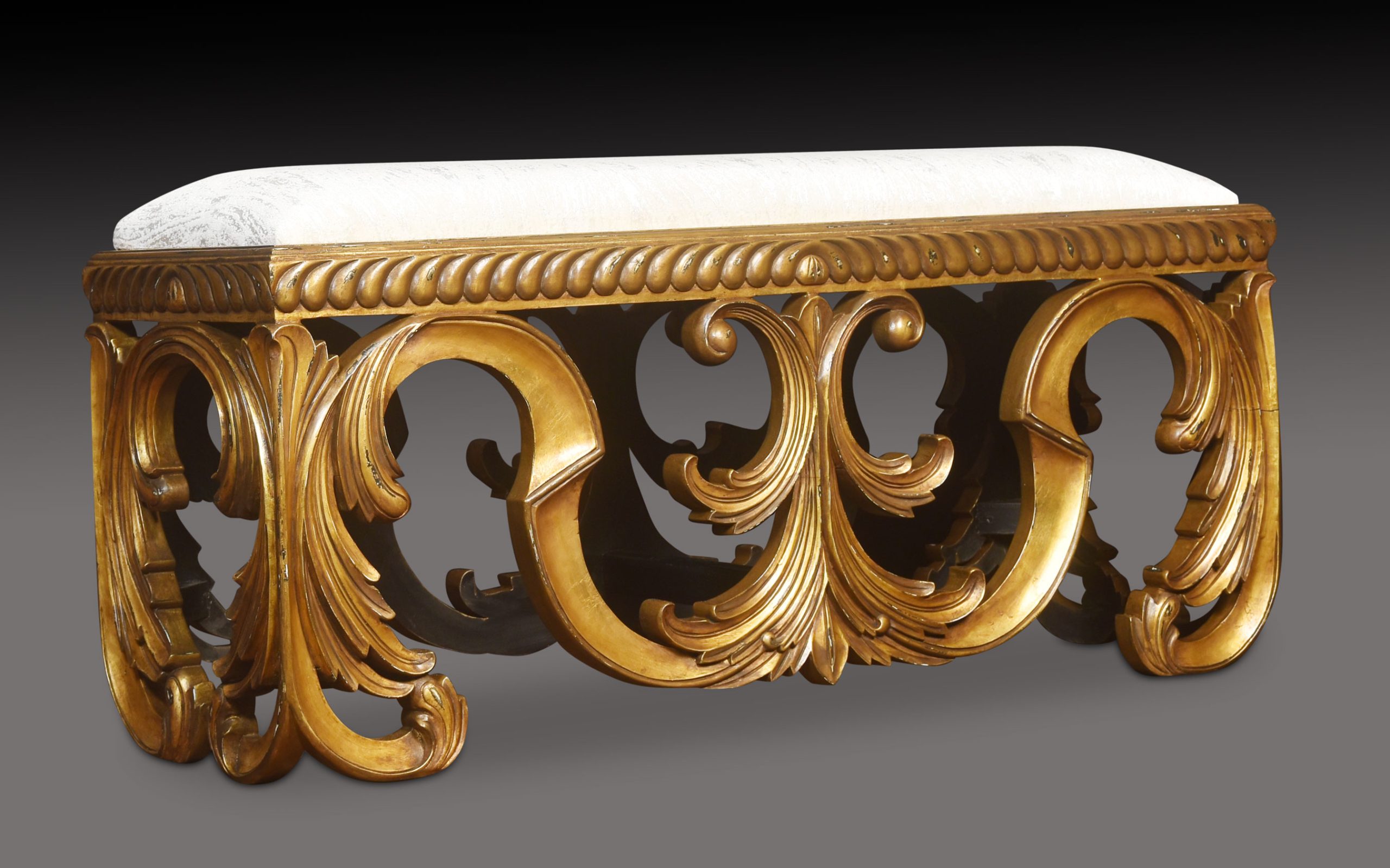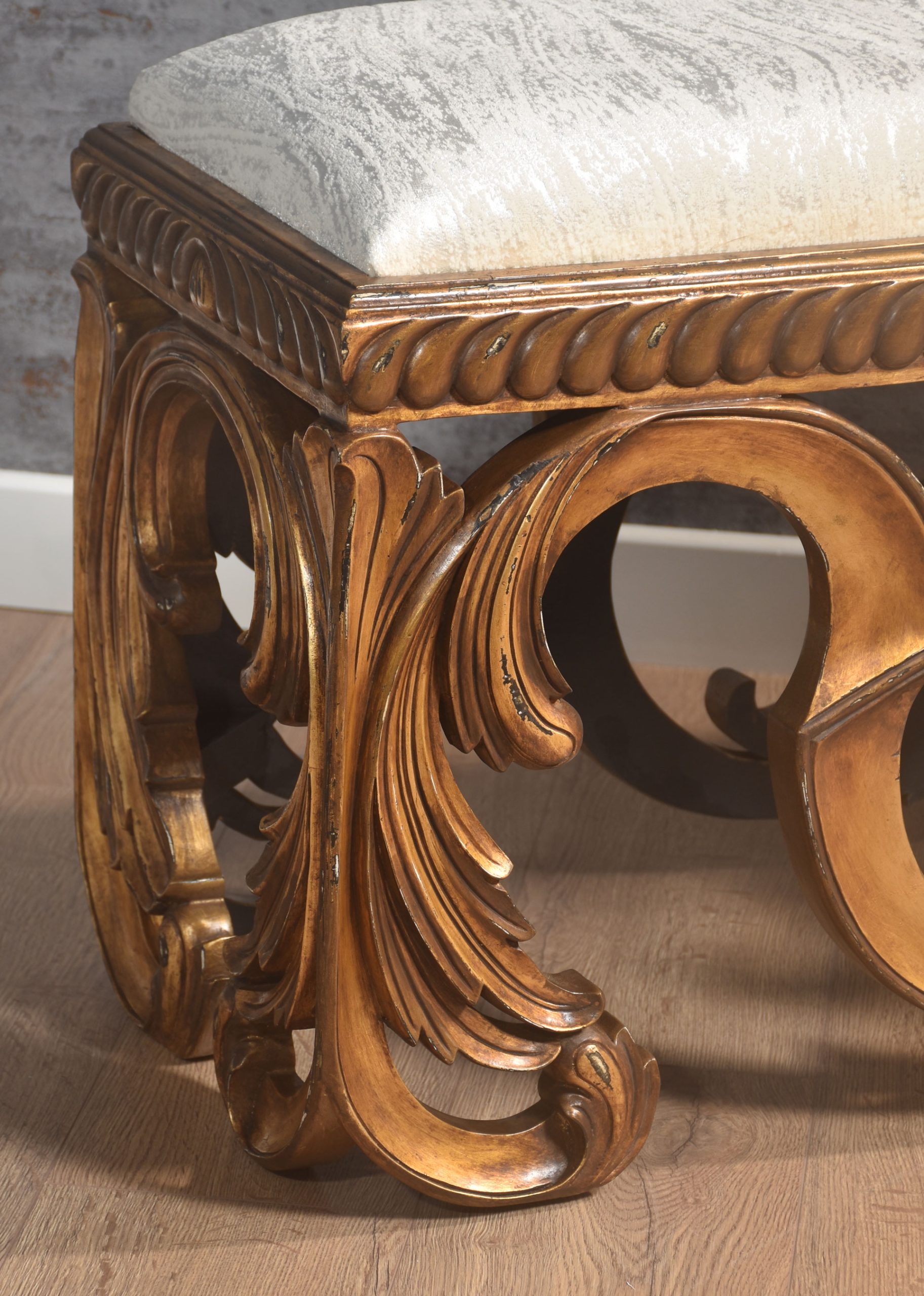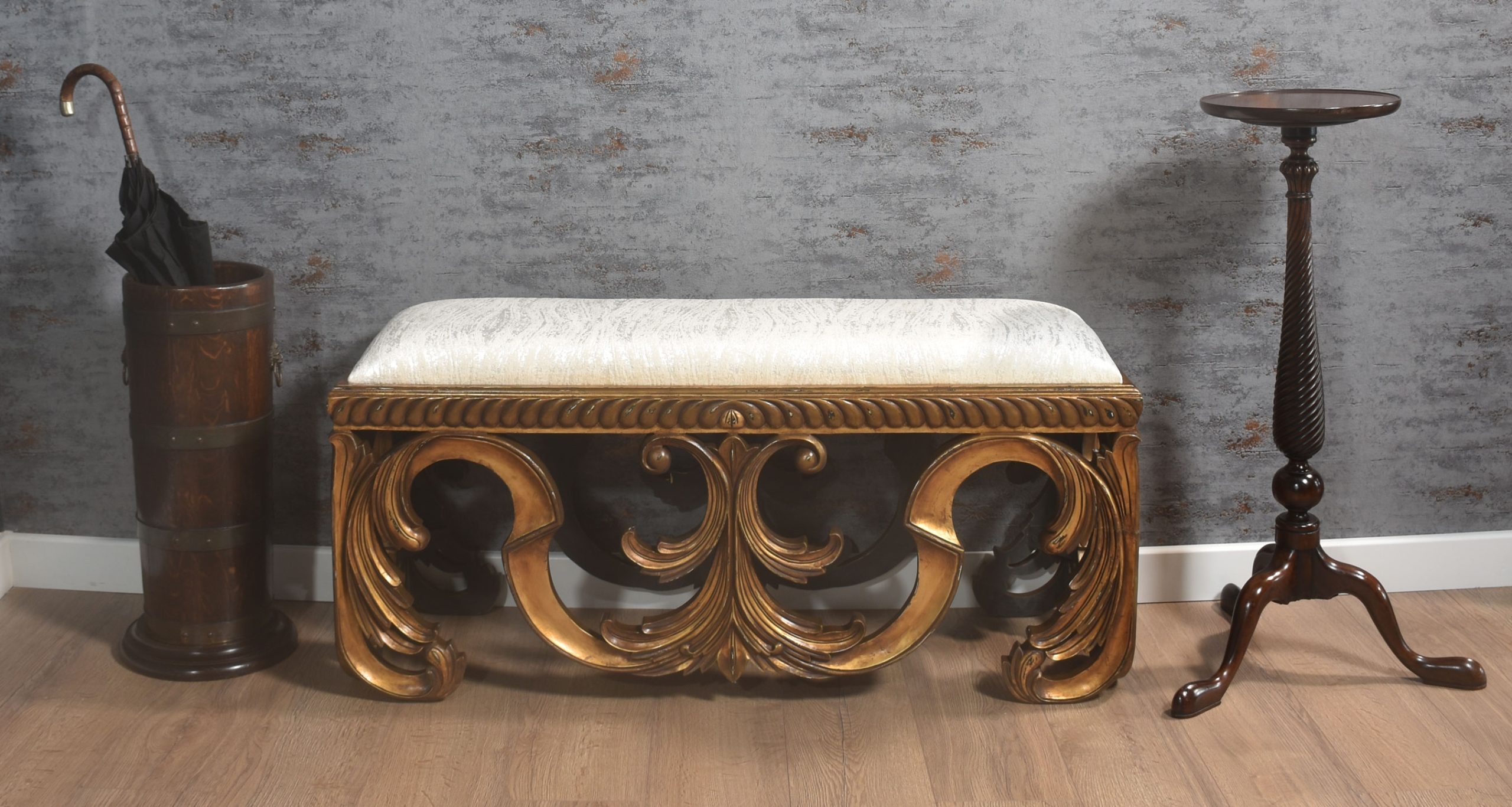 Carved giltwood dressing table stool, the upholstered cushion of rectangular form, to the moulded freeze raised up on scrolling base.
