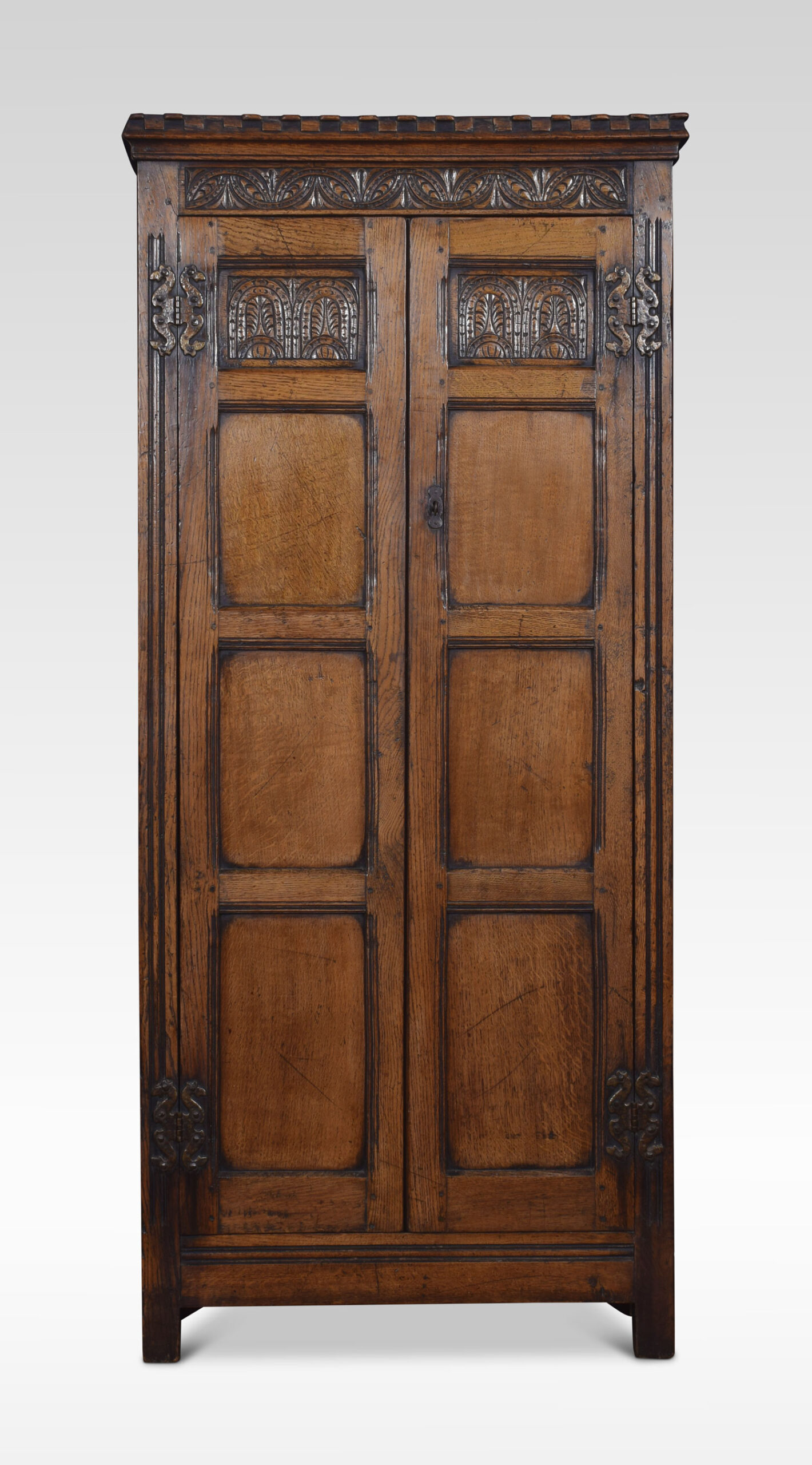 A large solid oak two-door cupboard of narrow proportions the moulded cornice above carved decoration in the Jacobean style. The large panelled doors opening to reveal shelved interior raised up on bracket feet