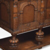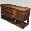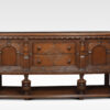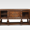 Carved oak sideboard, the large rectangular top above carved freeze, and two central drawers with turned knob handled, flanked by panelled doors opening to reveal large cupboards. supported on bulbous legs united by under tier.