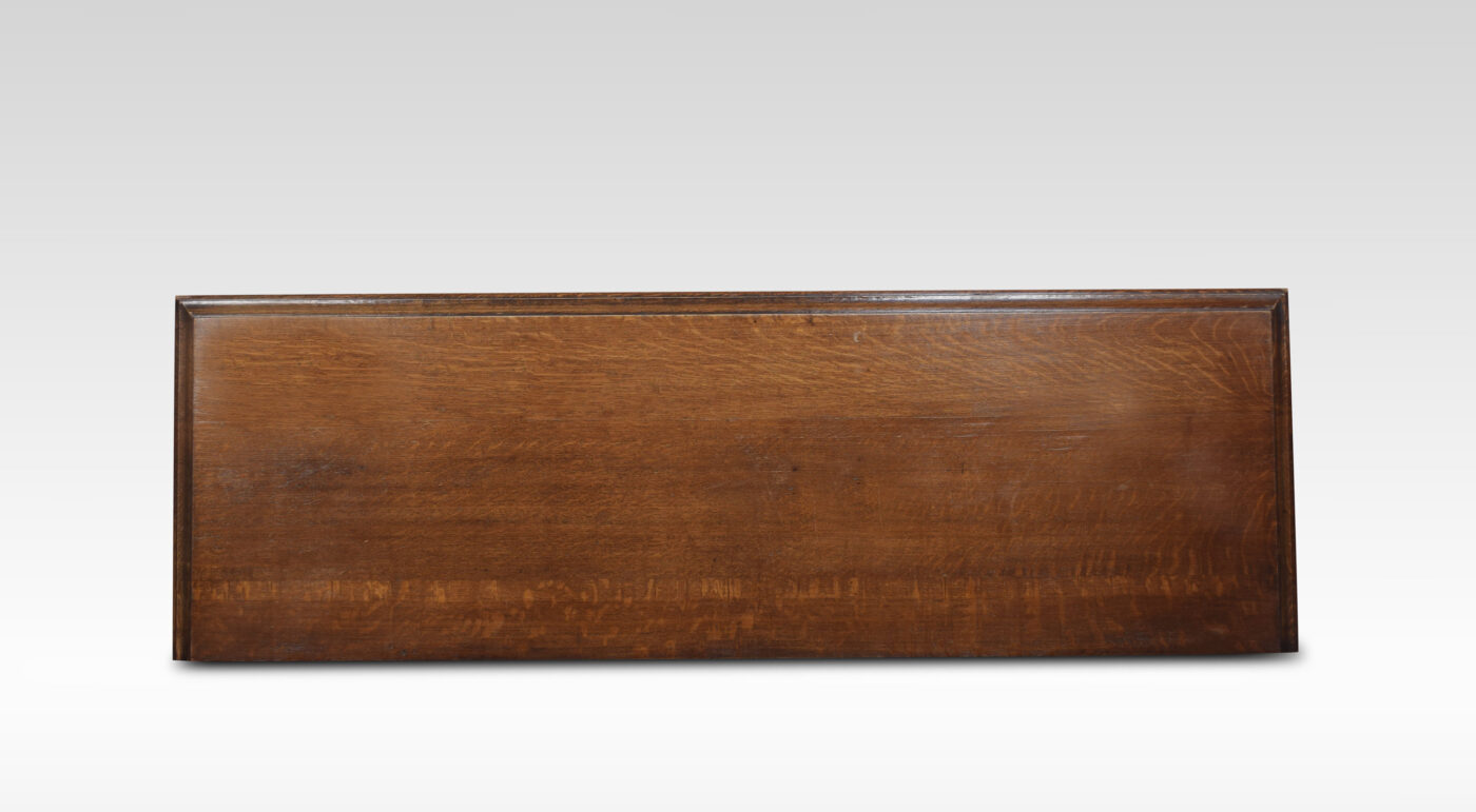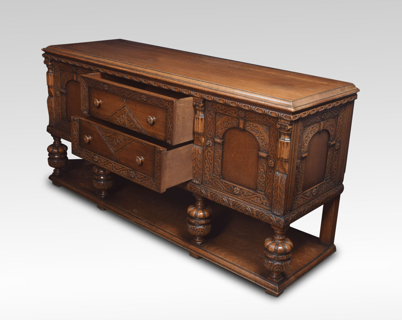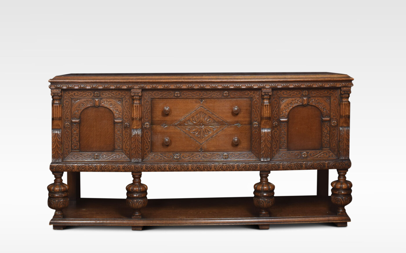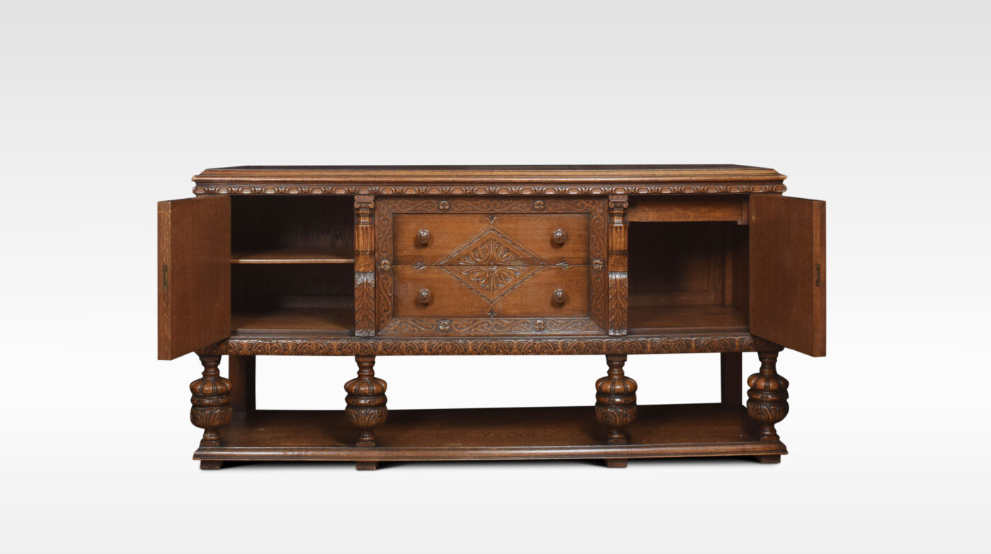 Carved oak sideboard, the large rectangular top above carved freeze, and two central drawers with turned knob handled, flanked by panelled doors opening to reveal large cupboards. supported on bulbous legs united by under tier.