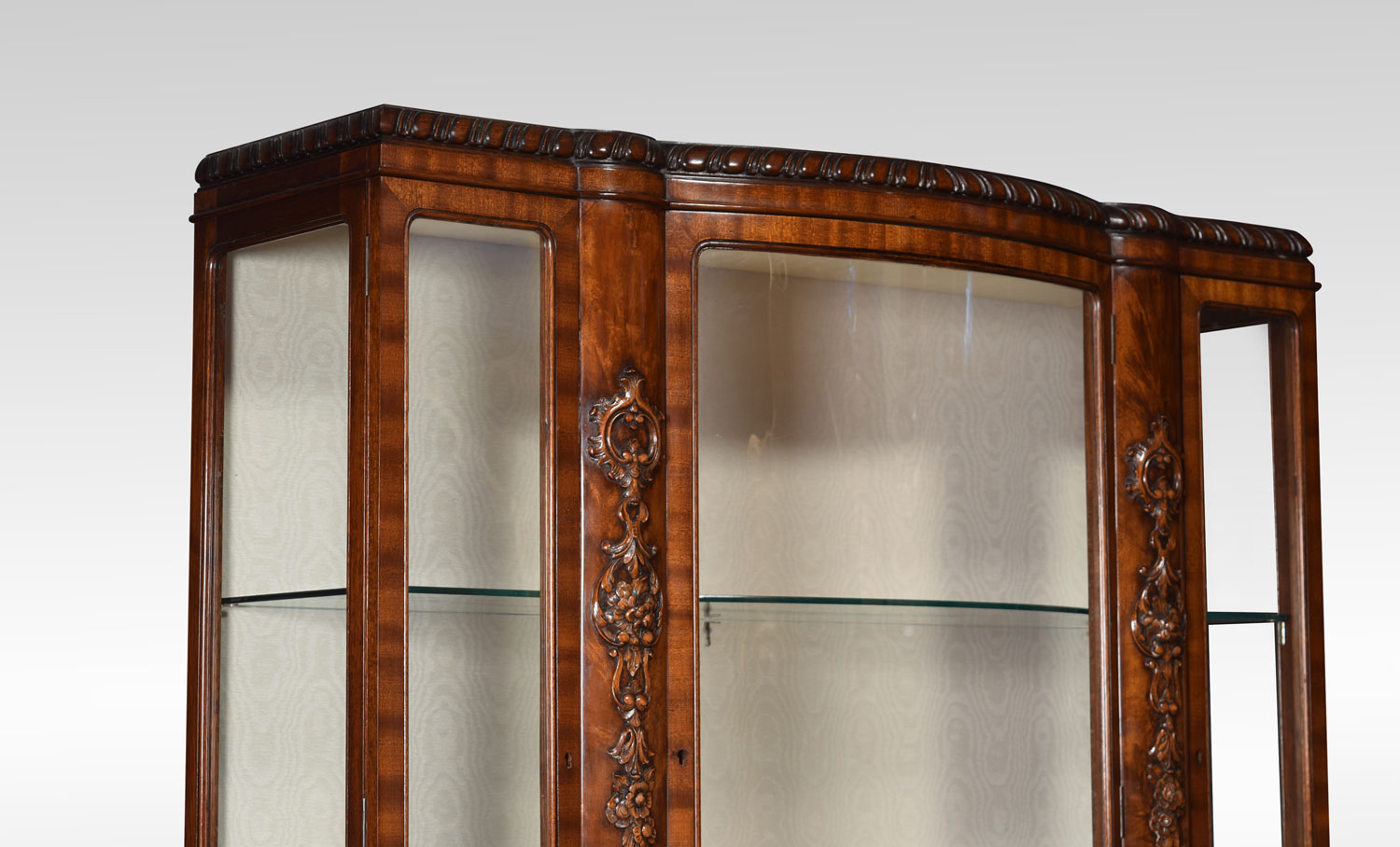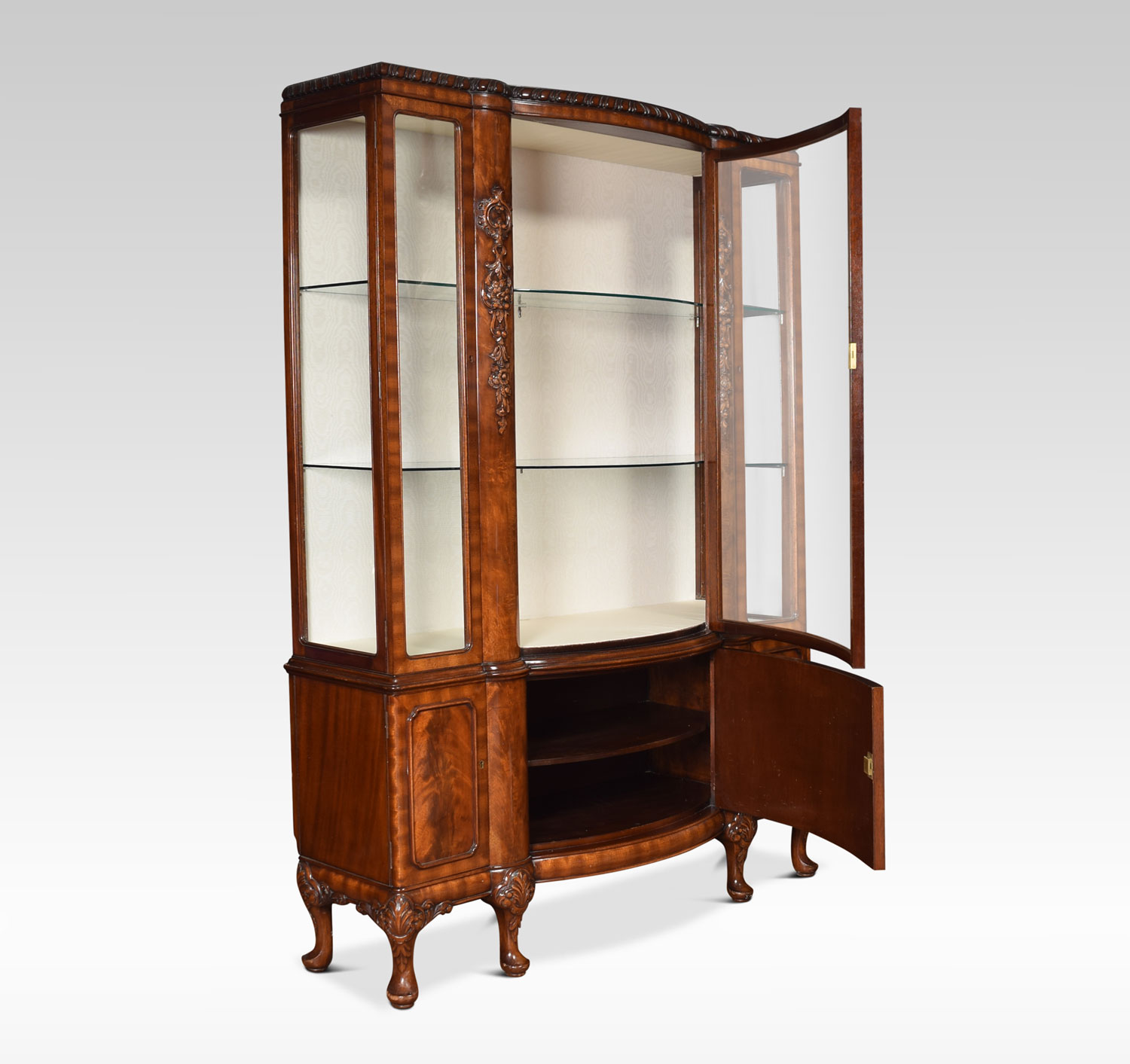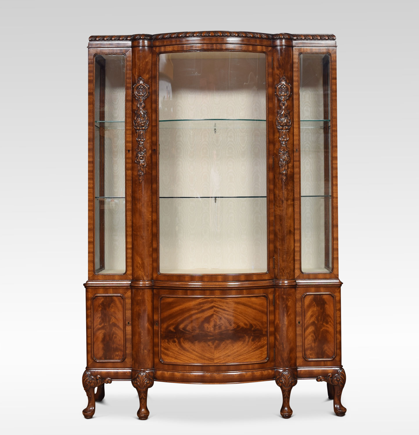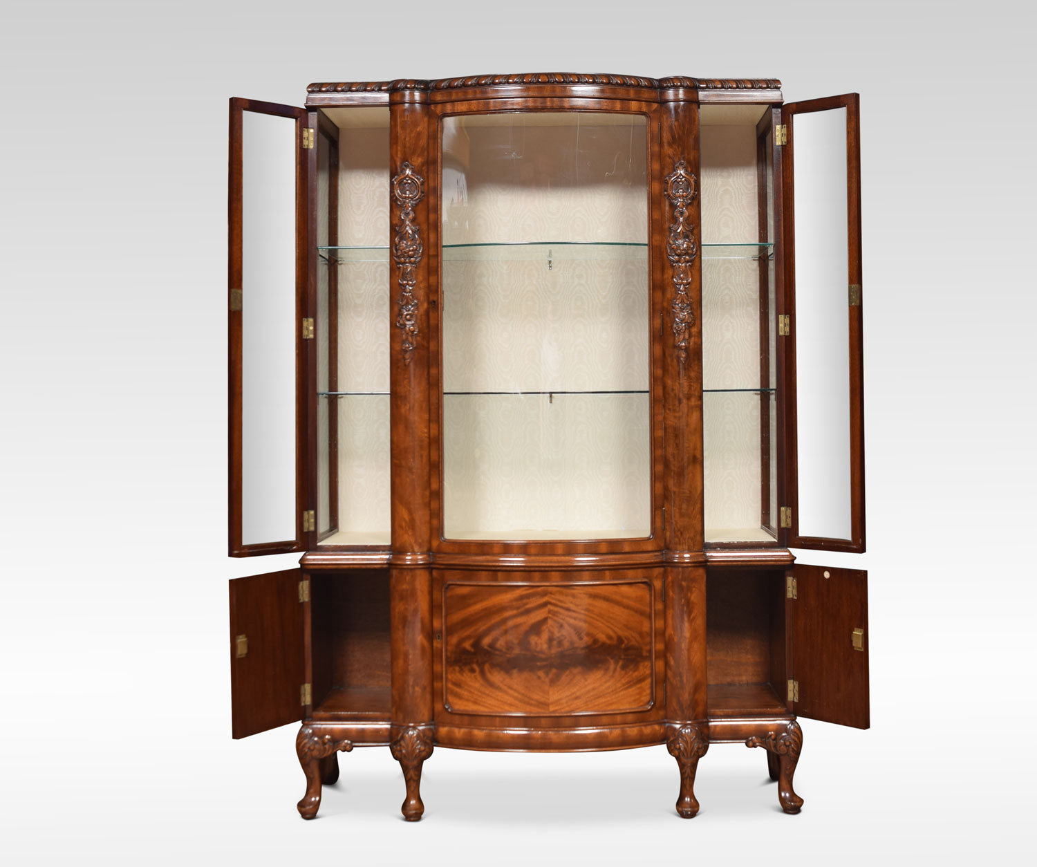 Chippendale revival mahogany bow fronted display cabinet the gradooned top above large central bow fronted door and shorter doors to either side. Flanked by carved scrolls and foliage. The cabinet fitted with two glazed shelves. The base section with three cupboard doors opening to reveal large storage area. All raised up on cabriole legs.