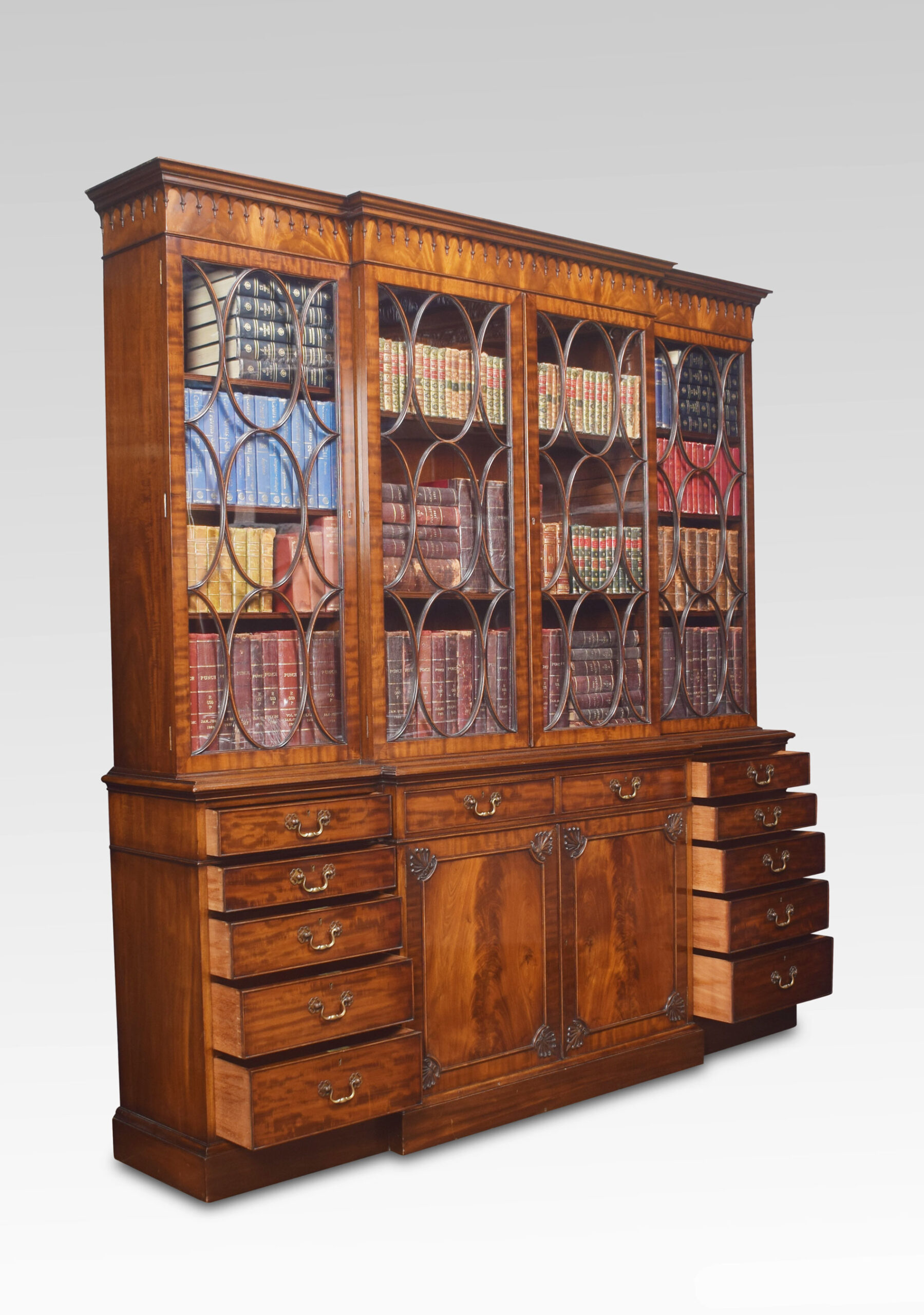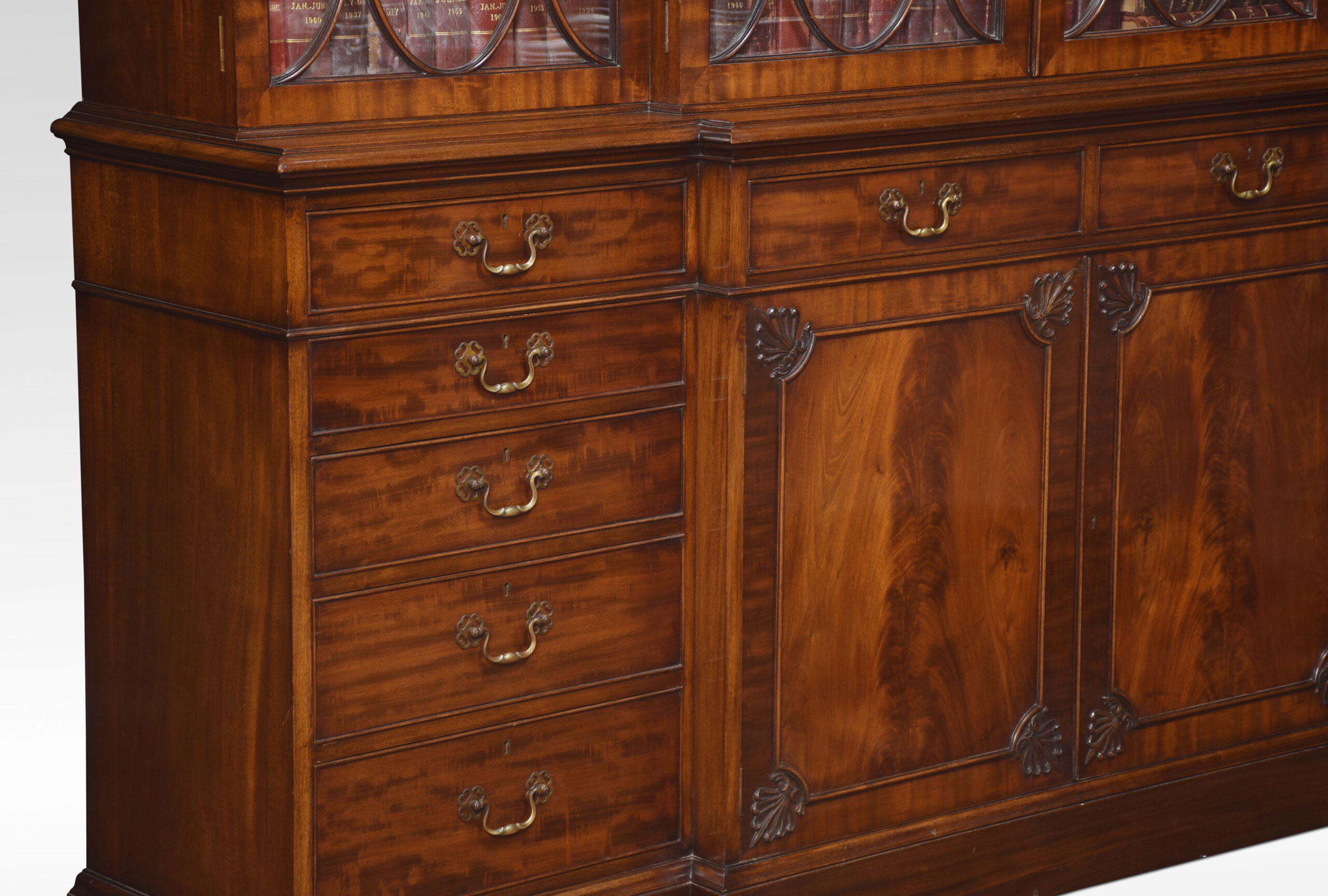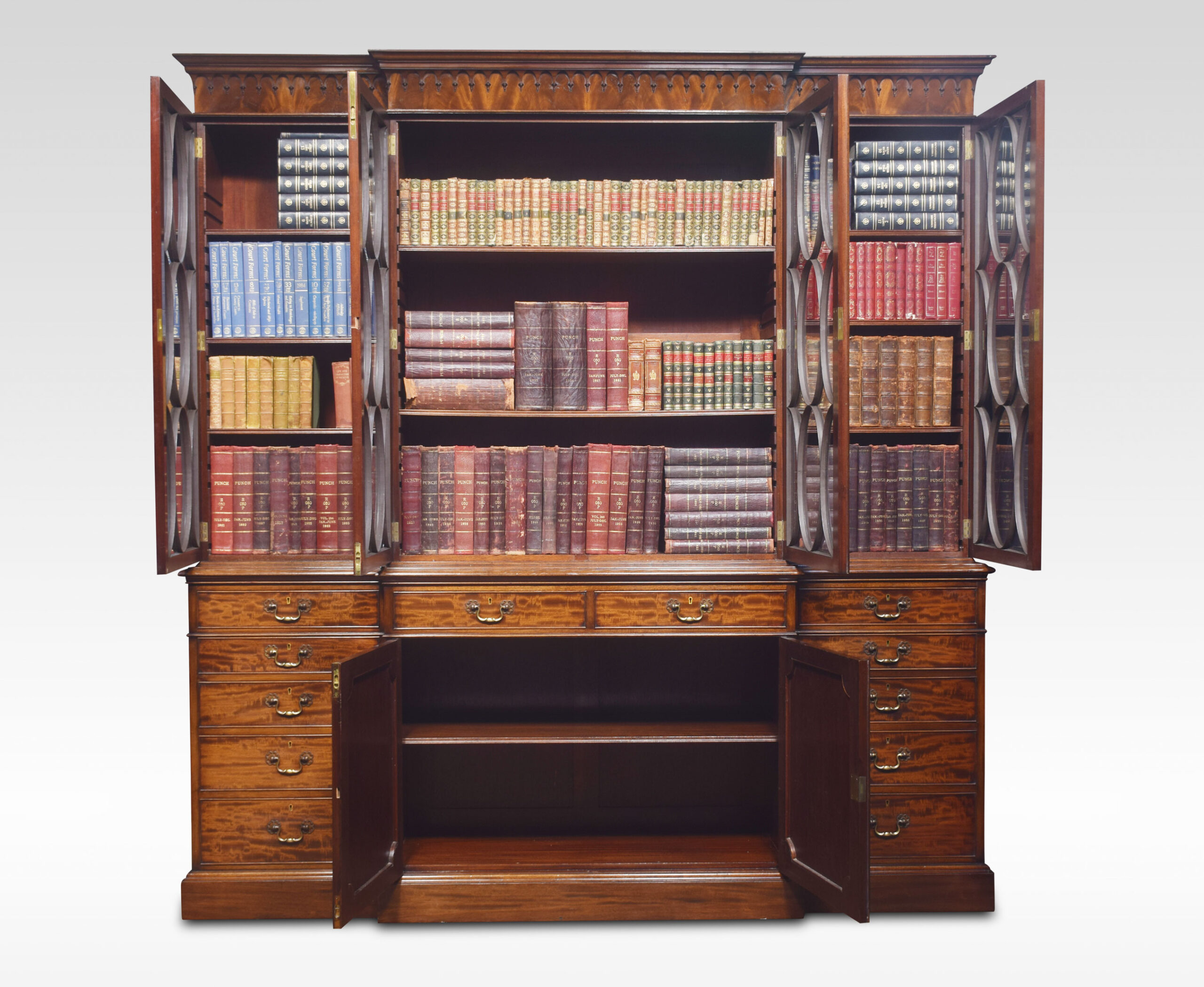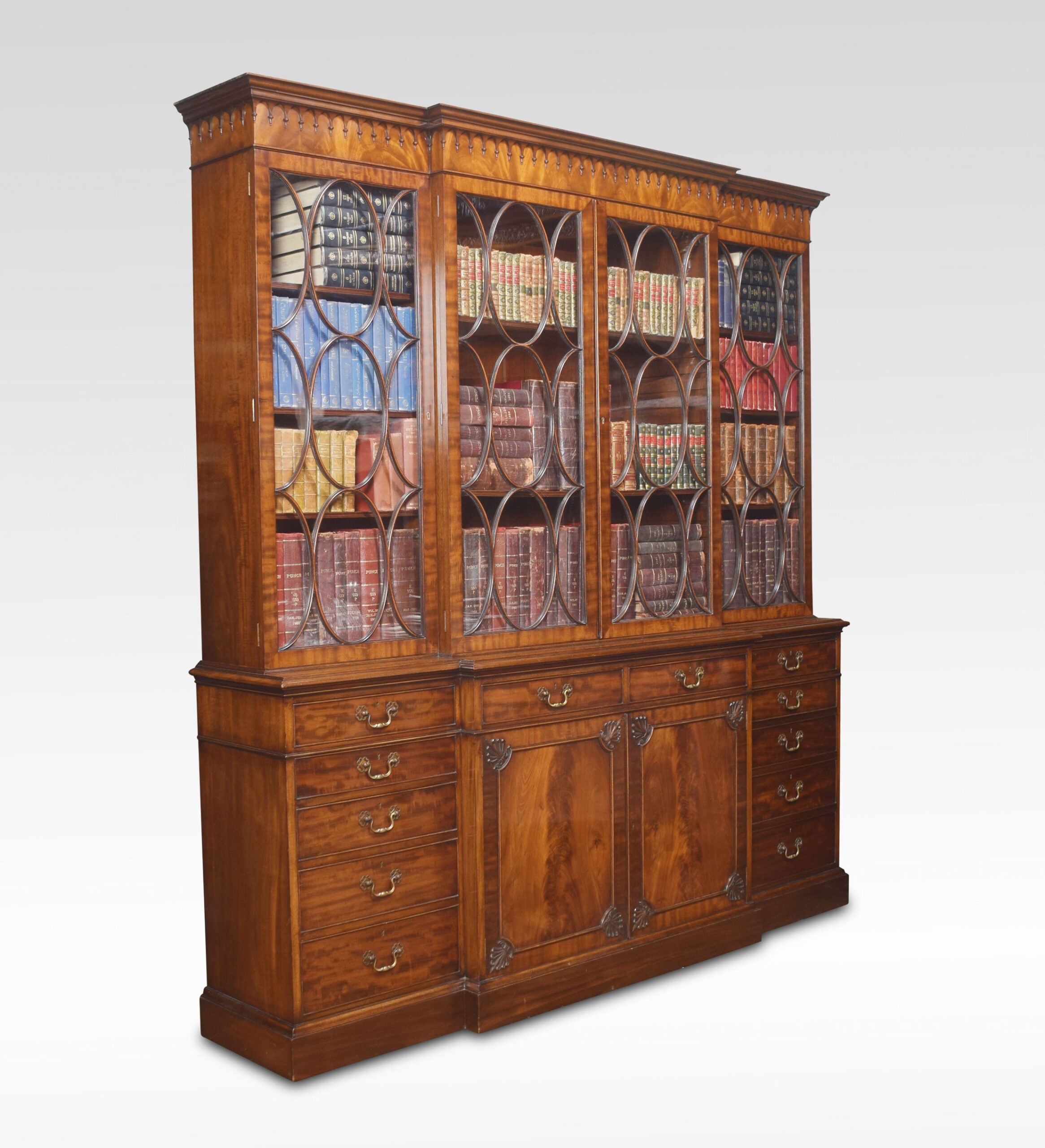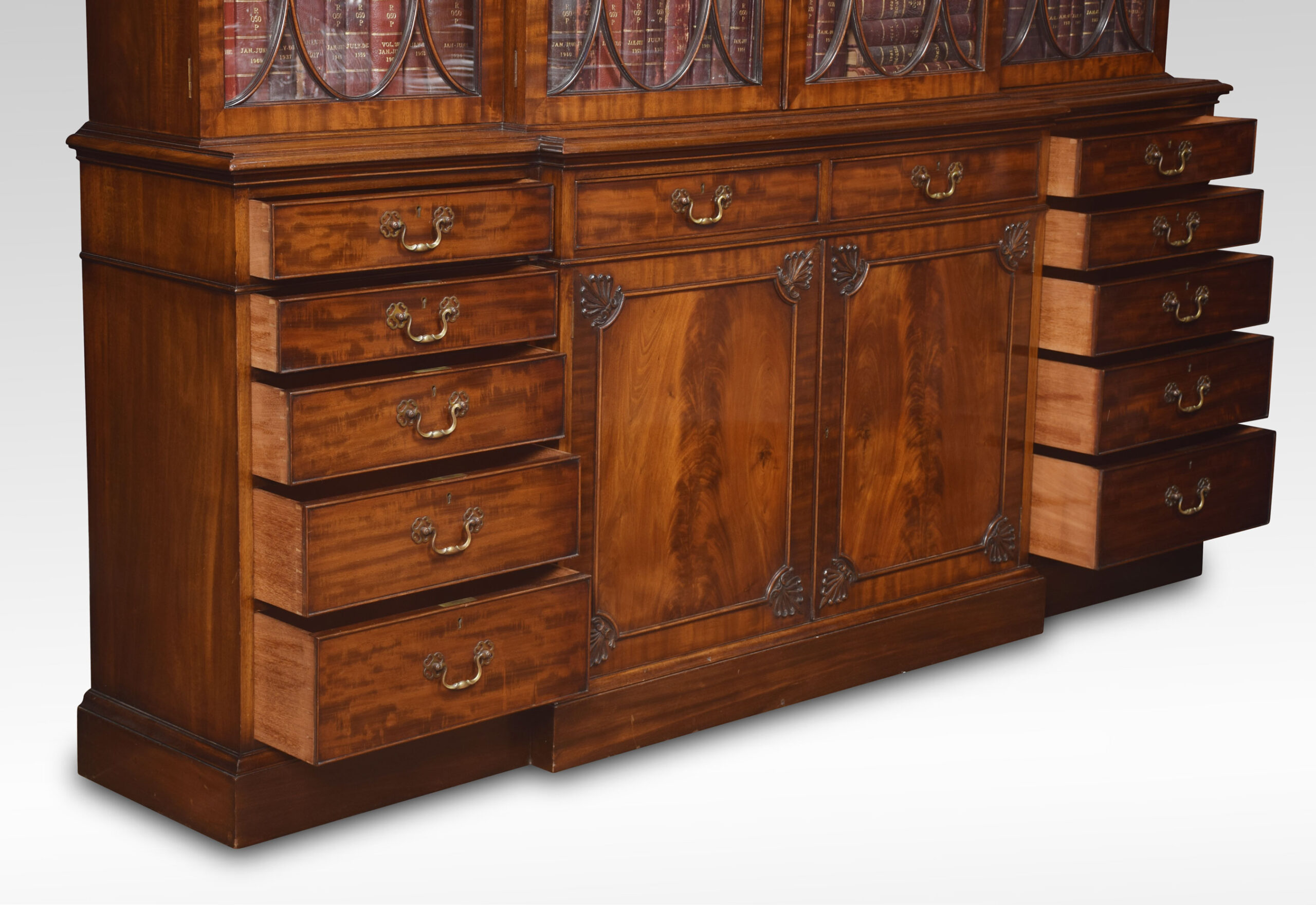 Chippendale Revival bookcase, the projecting breakfront molded cornice. Above four large astragal glazed doors opening to reveal an adjustable shelved interior. To the base section fitted with four frieze drawers with brass swan neck handles, above a pair of paneled doors opening to reveal a shelved interior. Flanked by two banks of drawers, all raised up on plinth base. The drawer stamped Gill & Reigate London