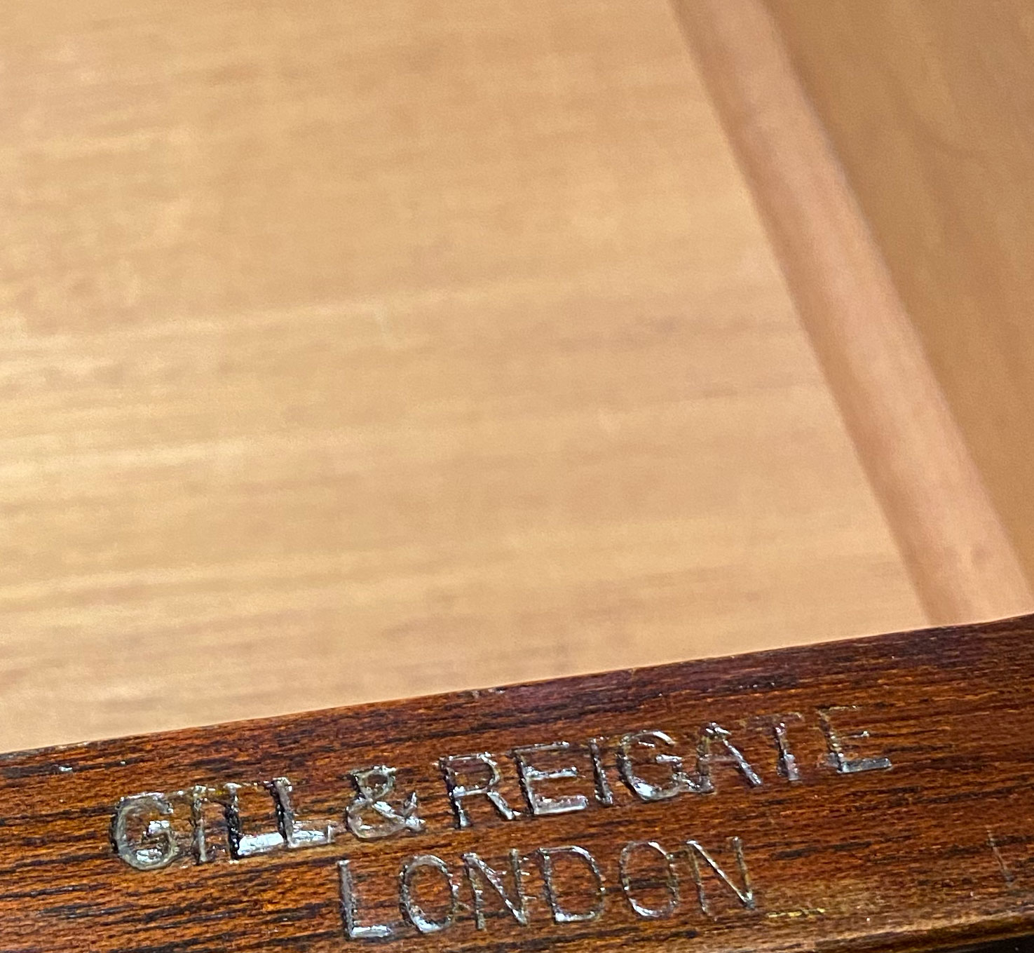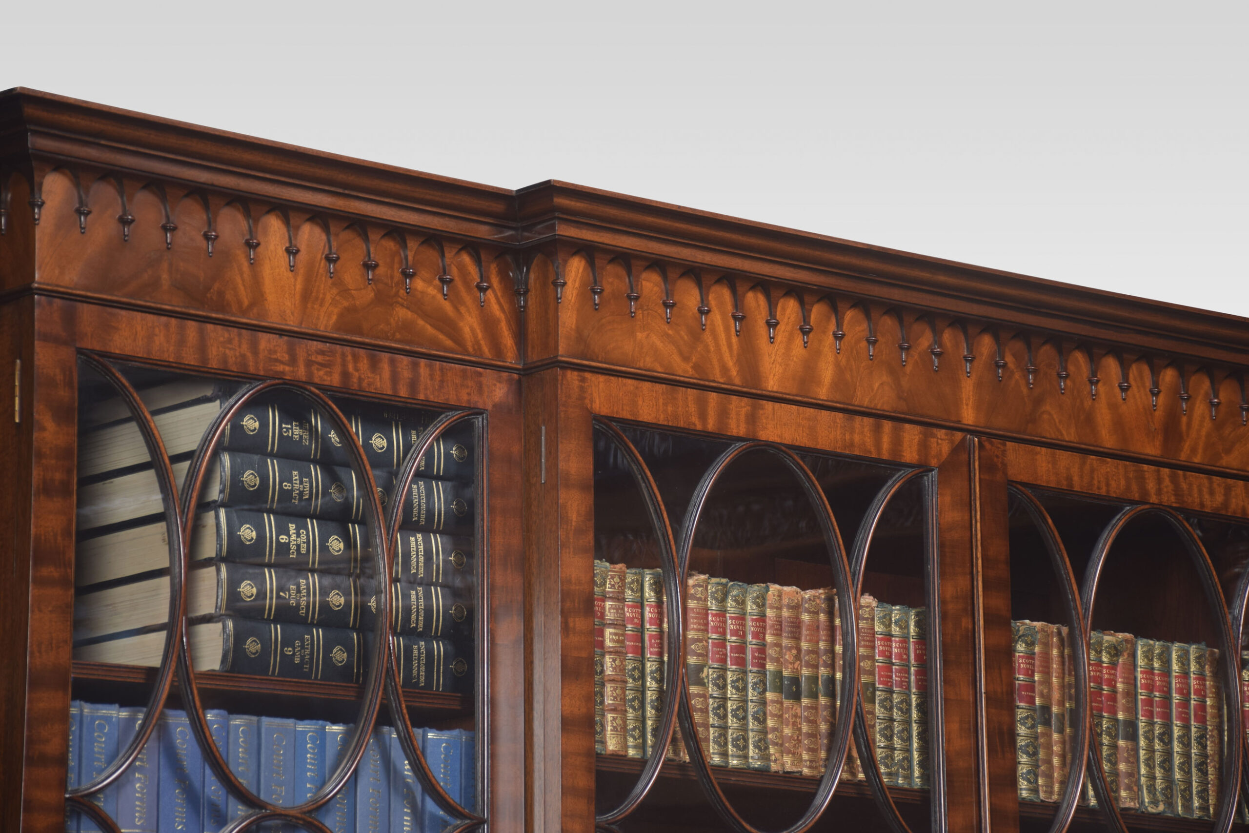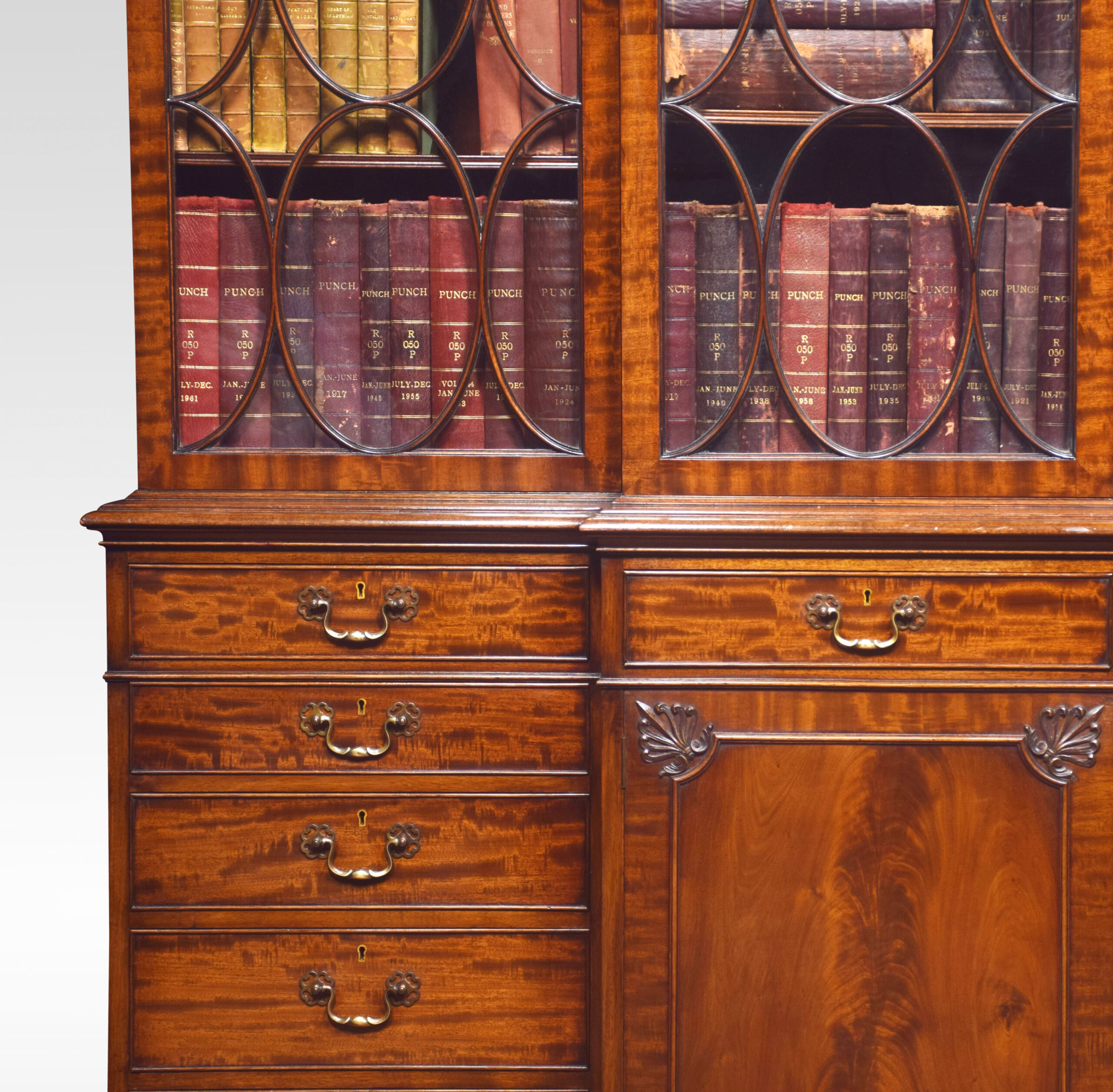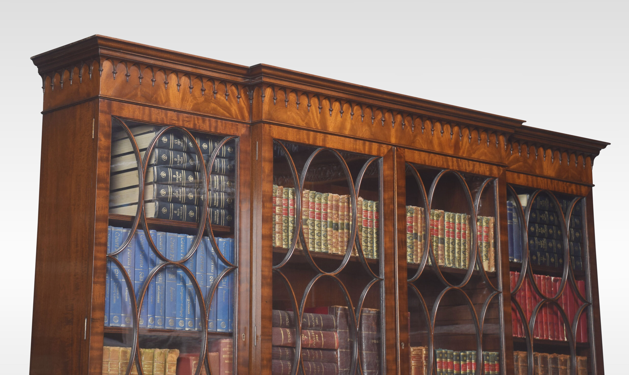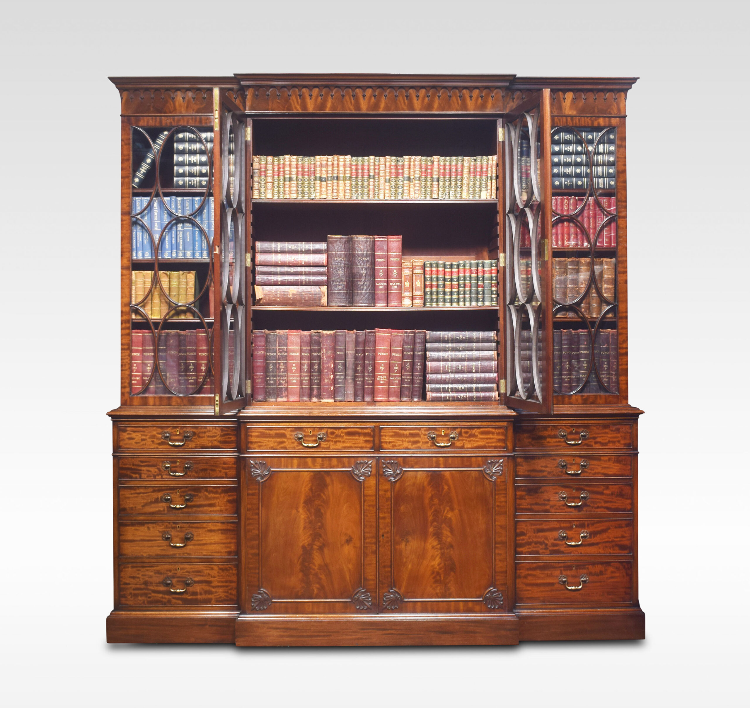 Chippendale Revival bookcase, the projecting breakfront molded cornice. Above four large astragal glazed doors opening to reveal an adjustable shelved interior. To the base section fitted with four frieze drawers with brass swan neck handles, above a pair of paneled doors opening to reveal a shelved interior. Flanked by two banks of drawers, all raised up on plinth base. The drawer stamped Gill & Reigate London