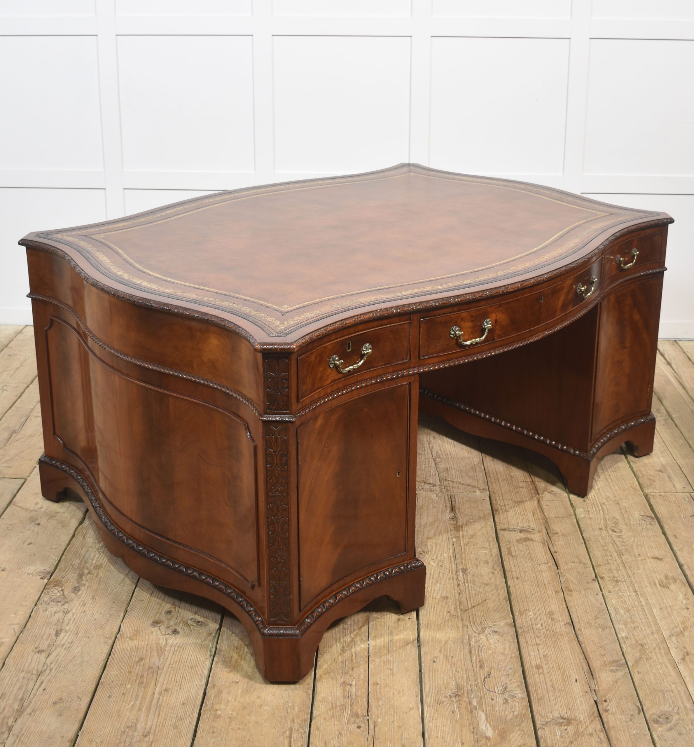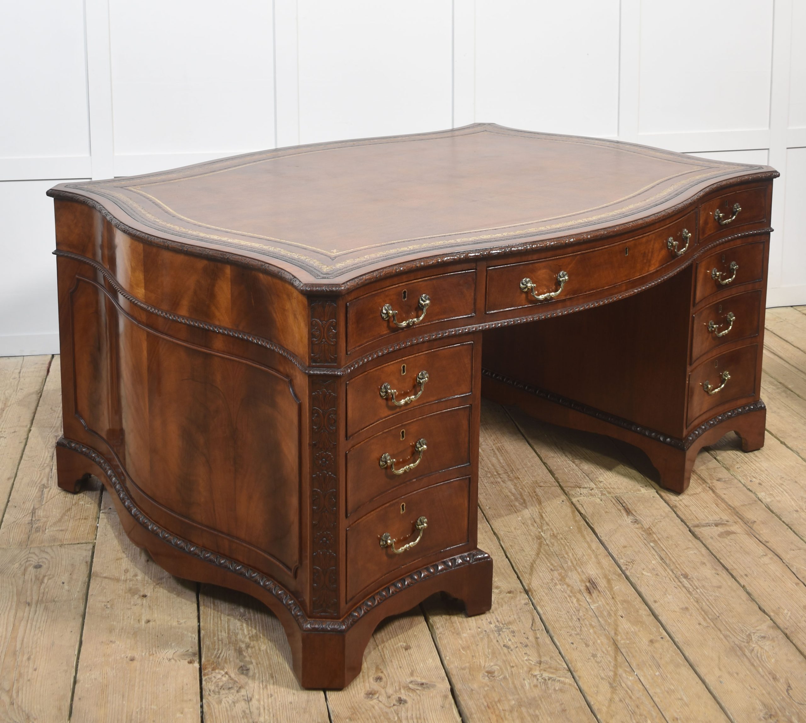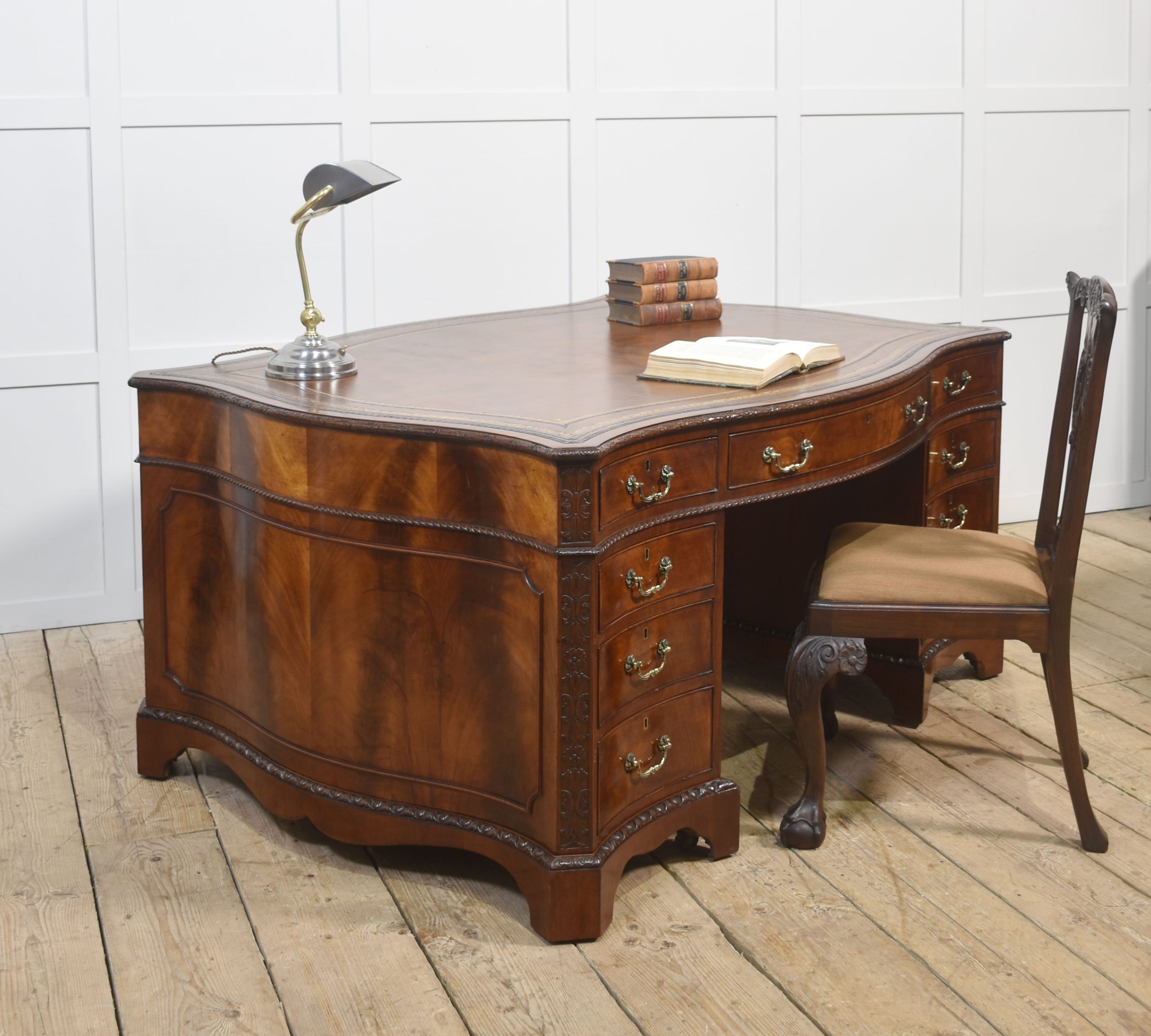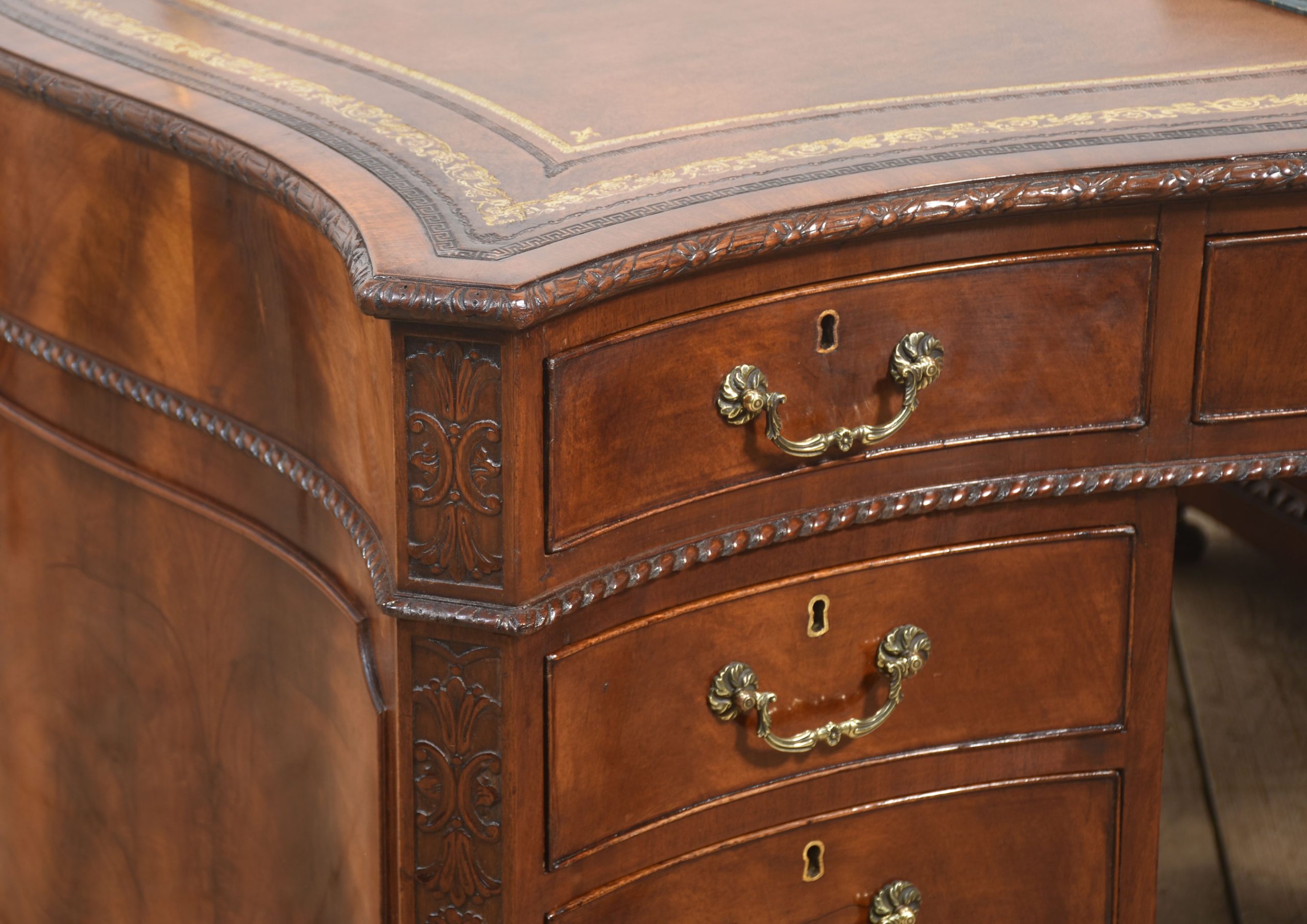A finely crafted Chippendale Revival partner’s desk in rich mahogany, distinguished by its serpentine outline and elaborate carved ornamentation. The moulded edge encloses a gilt-tooled leather writing surface, the warm tones of which harmonise beautifully with the figured mahogany veneers.
