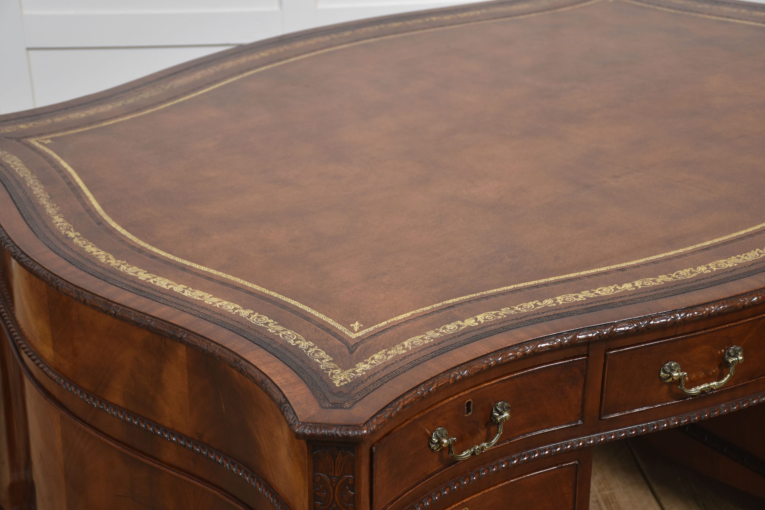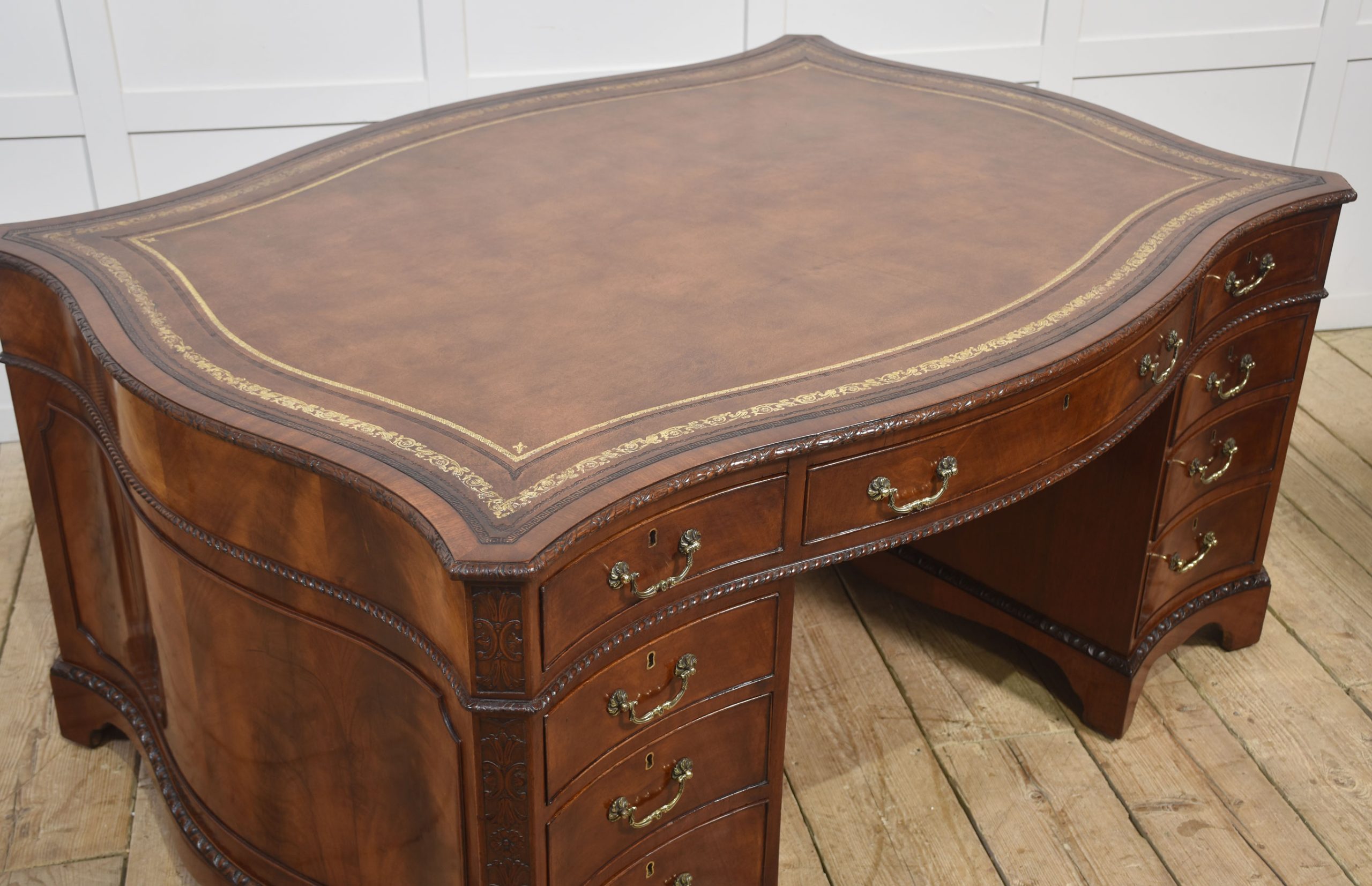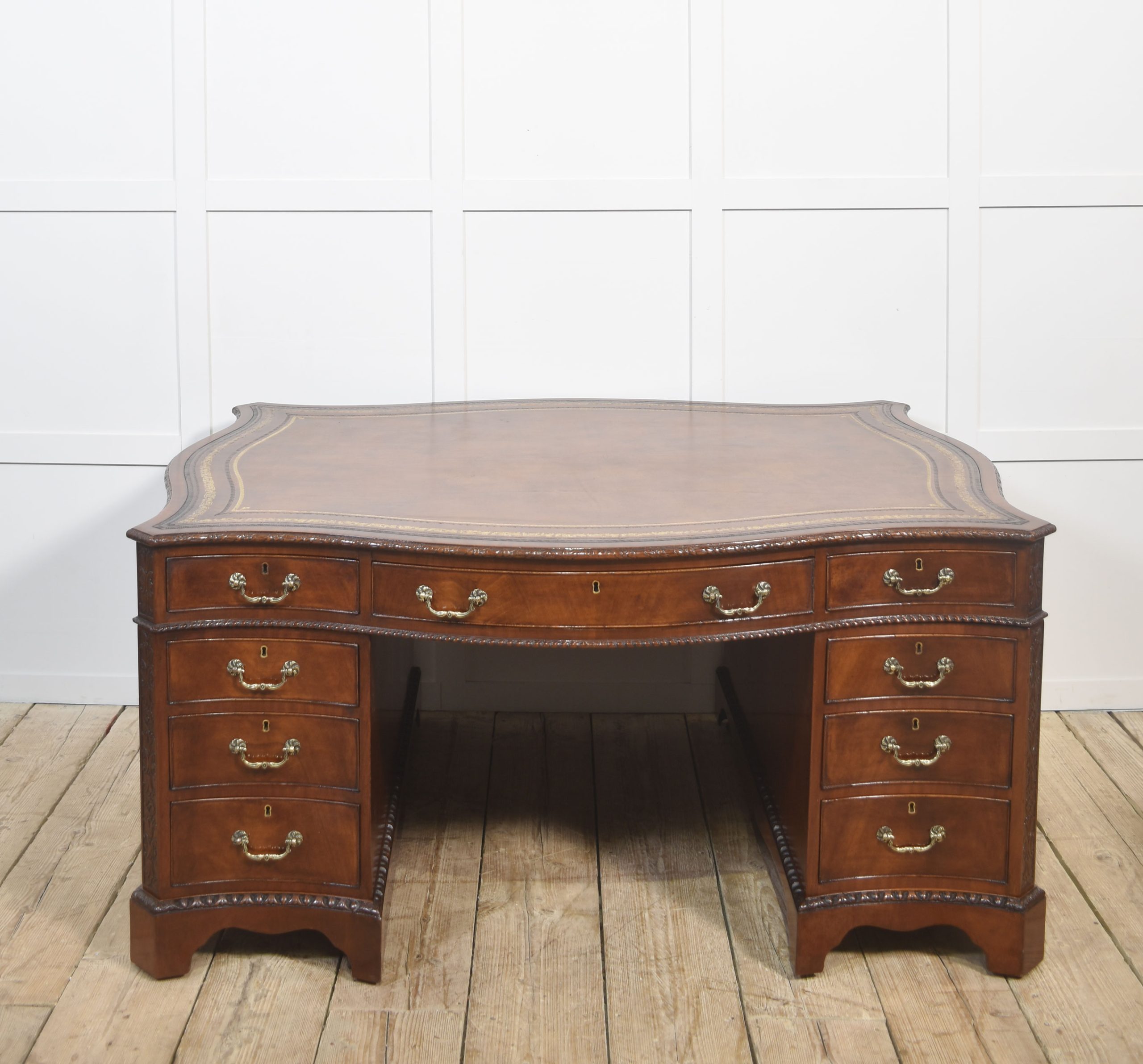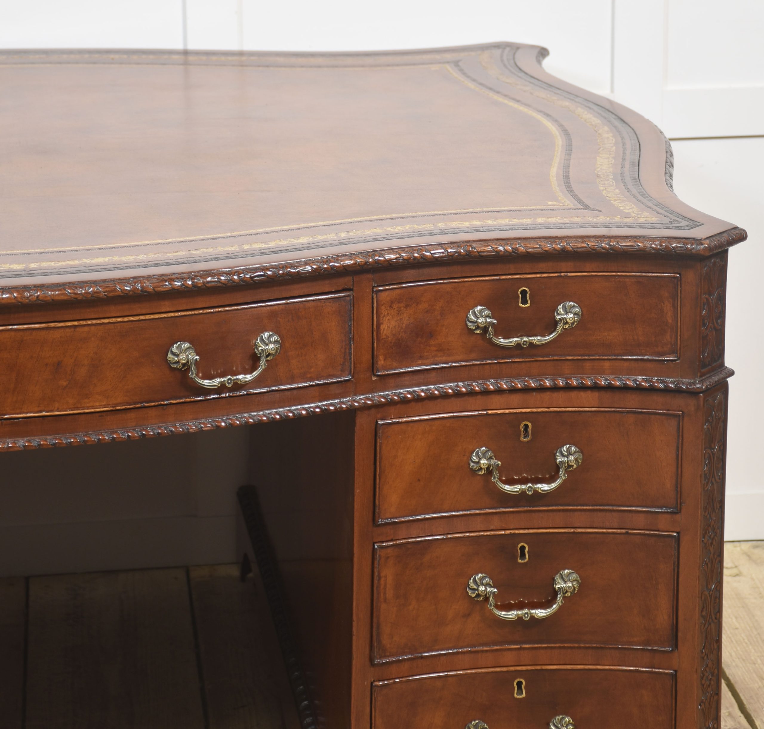 A finely crafted Chippendale Revival partner’s desk in rich mahogany, distinguished by its serpentine outline and elaborate carved ornamentation. The moulded edge encloses a gilt-tooled leather writing surface, the warm tones of which harmonise beautifully with the figured mahogany veneers.