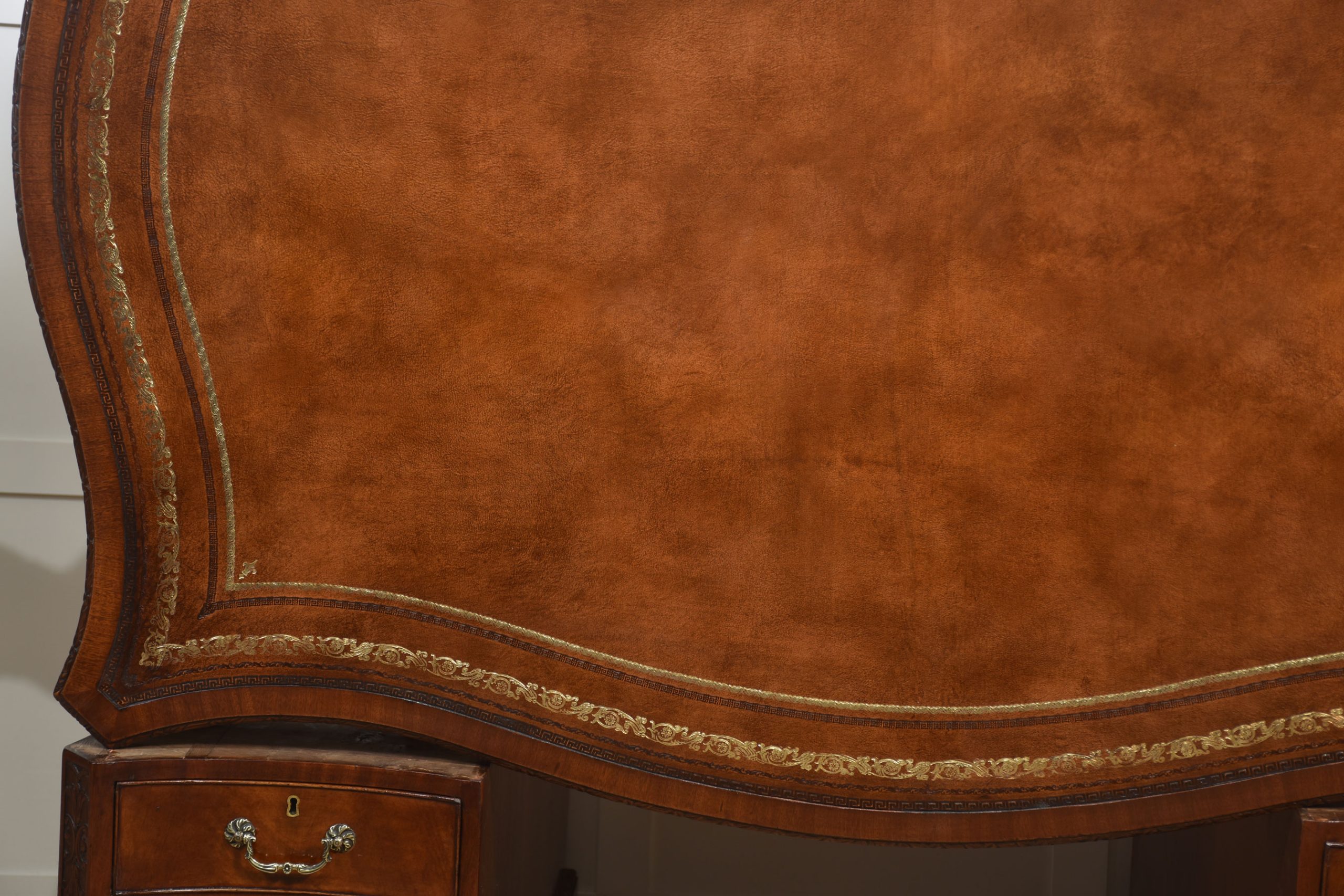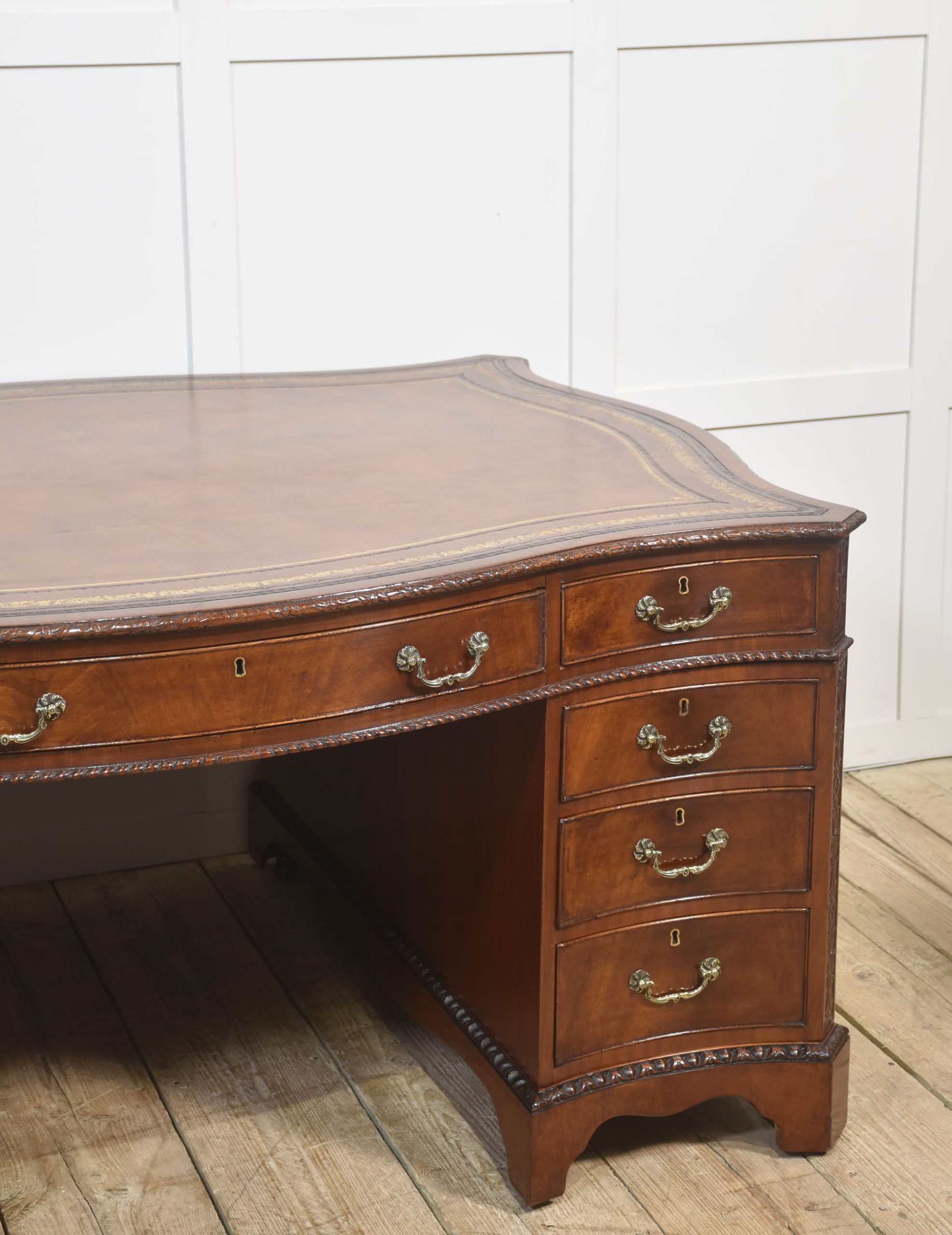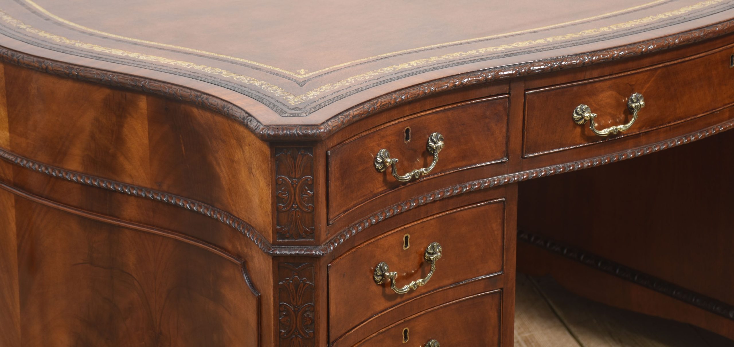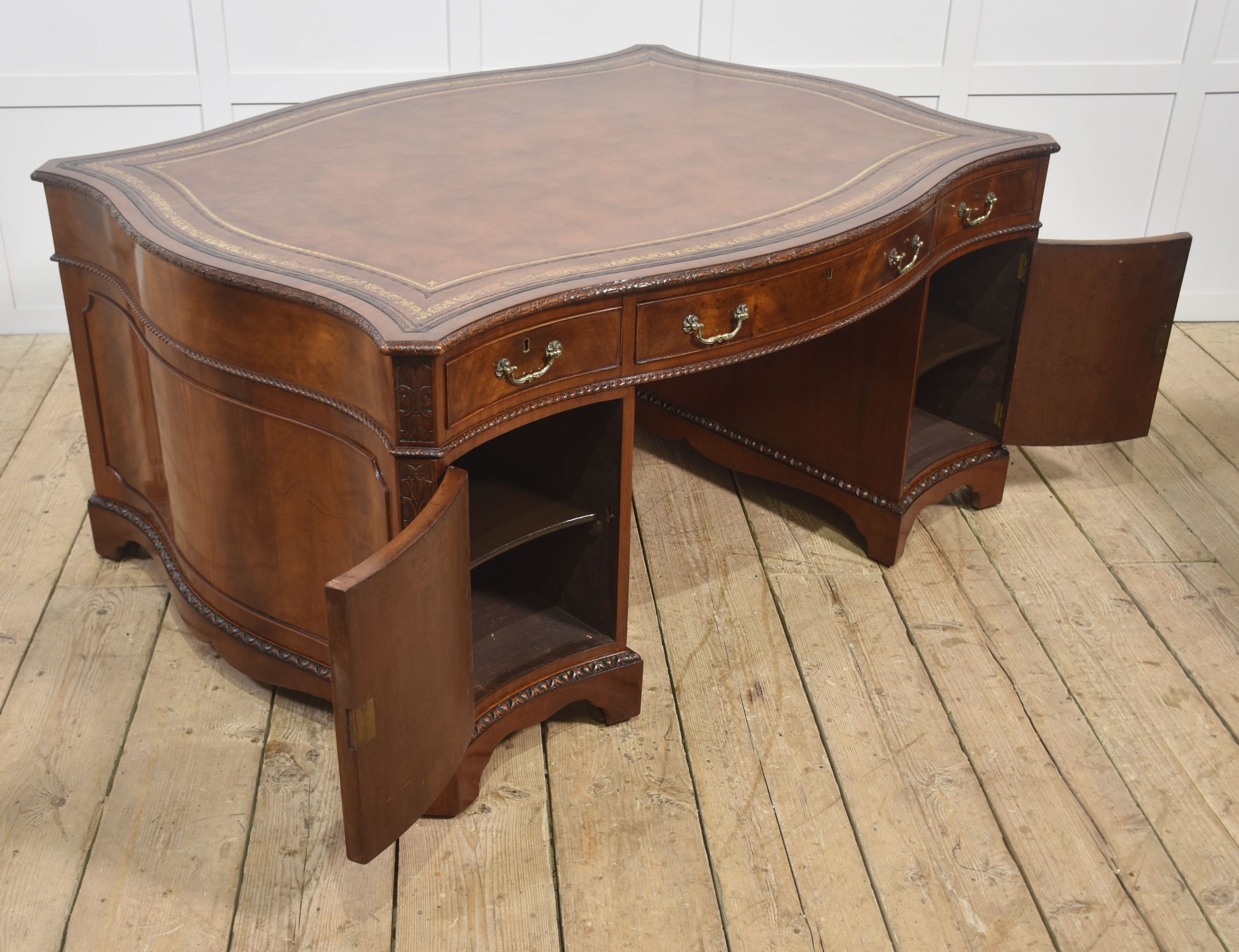 A finely crafted Chippendale Revival partner’s desk in rich mahogany, distinguished by its serpentine outline and elaborate carved ornamentation. The moulded edge encloses a gilt-tooled leather writing surface, the warm tones of which harmonise beautifully with the figured mahogany veneers.