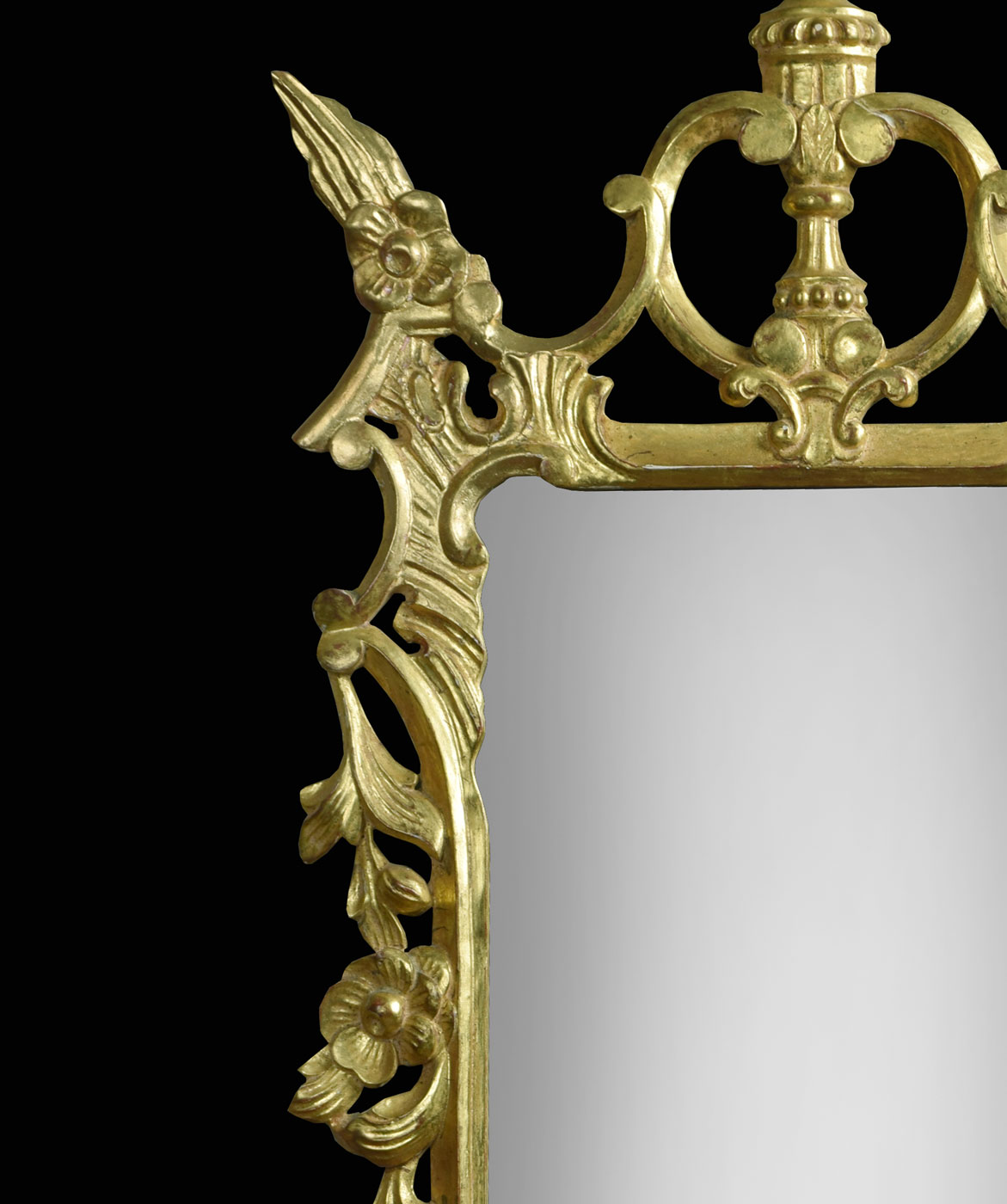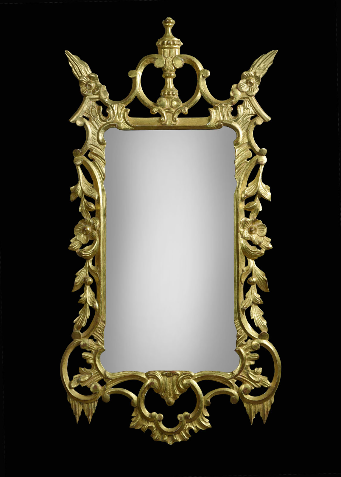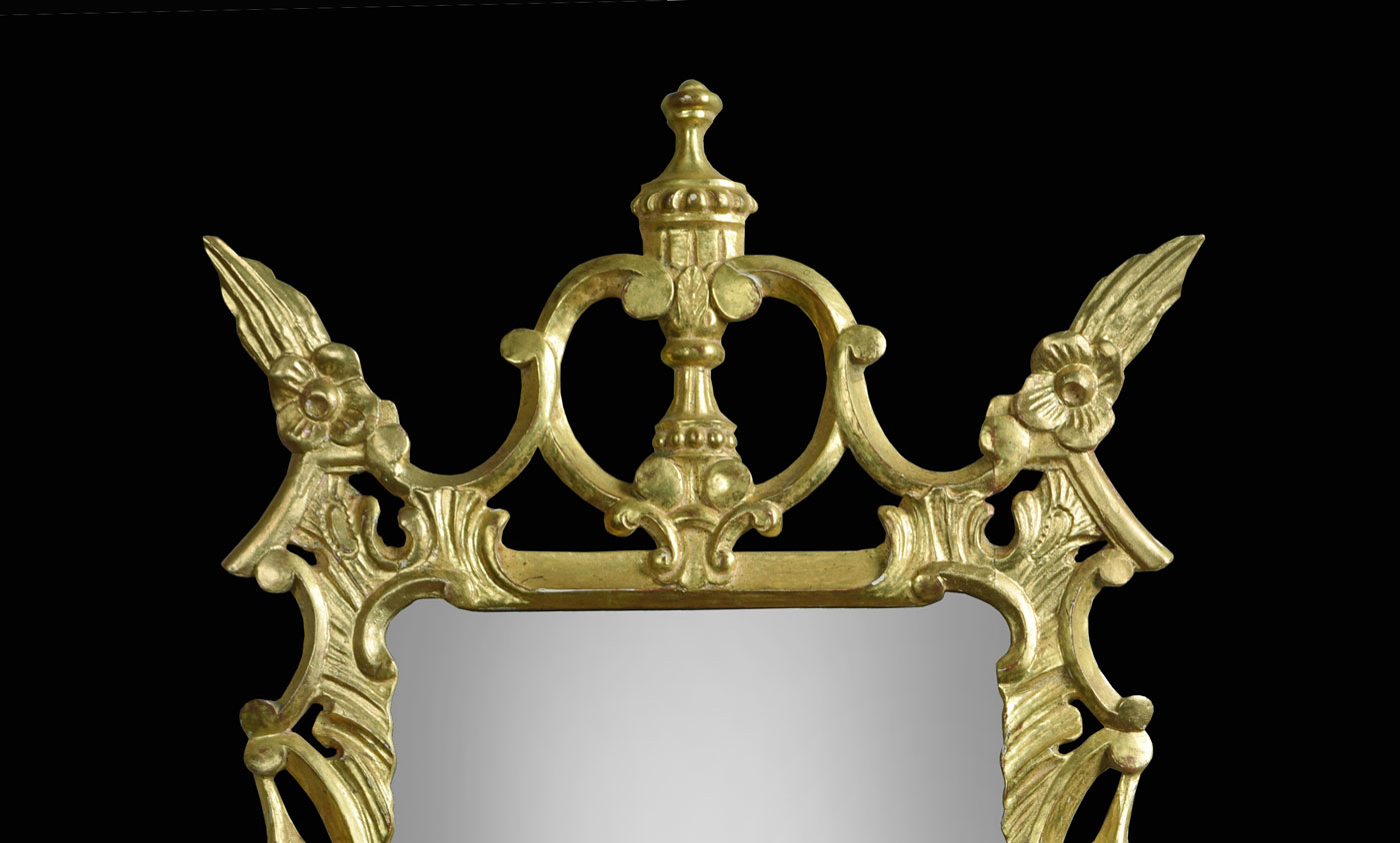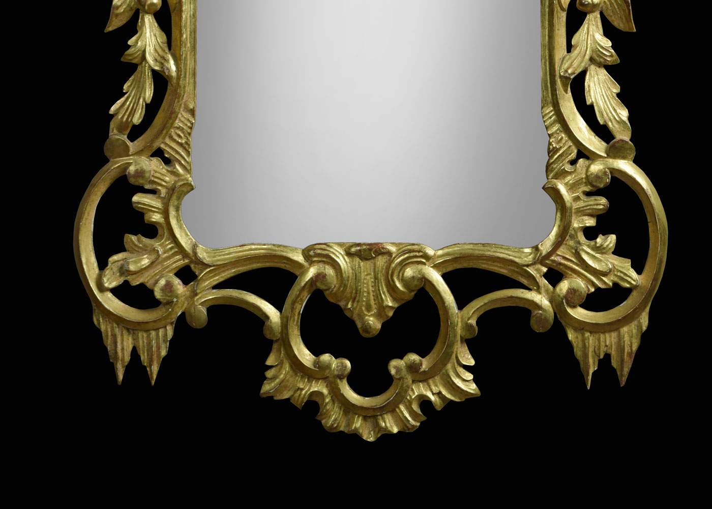 Carved giltwood Chippendale style wall mirror, the original rectangular mirror plate under a C scroll pierced pediment in an architectural and leaf carved frame.