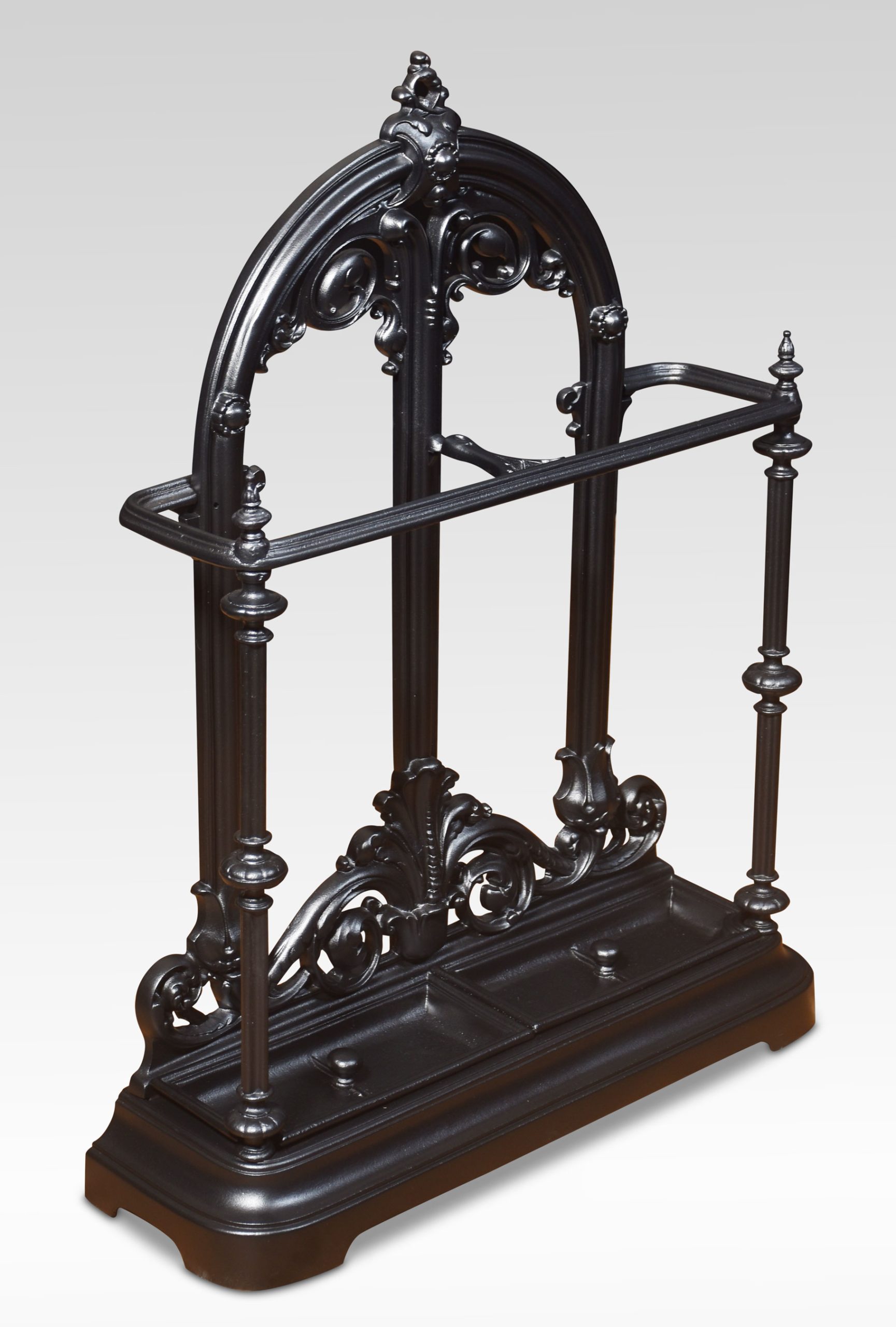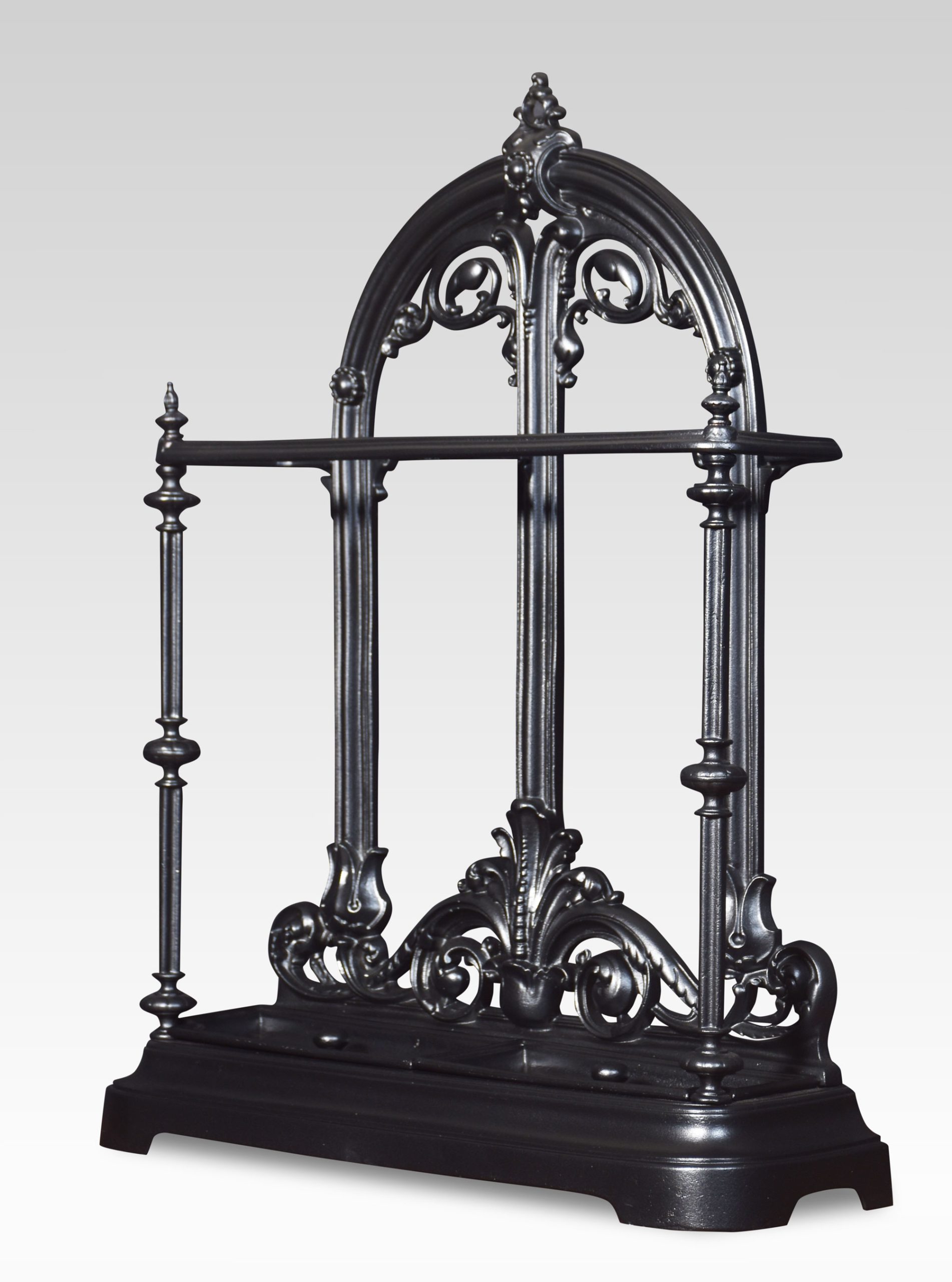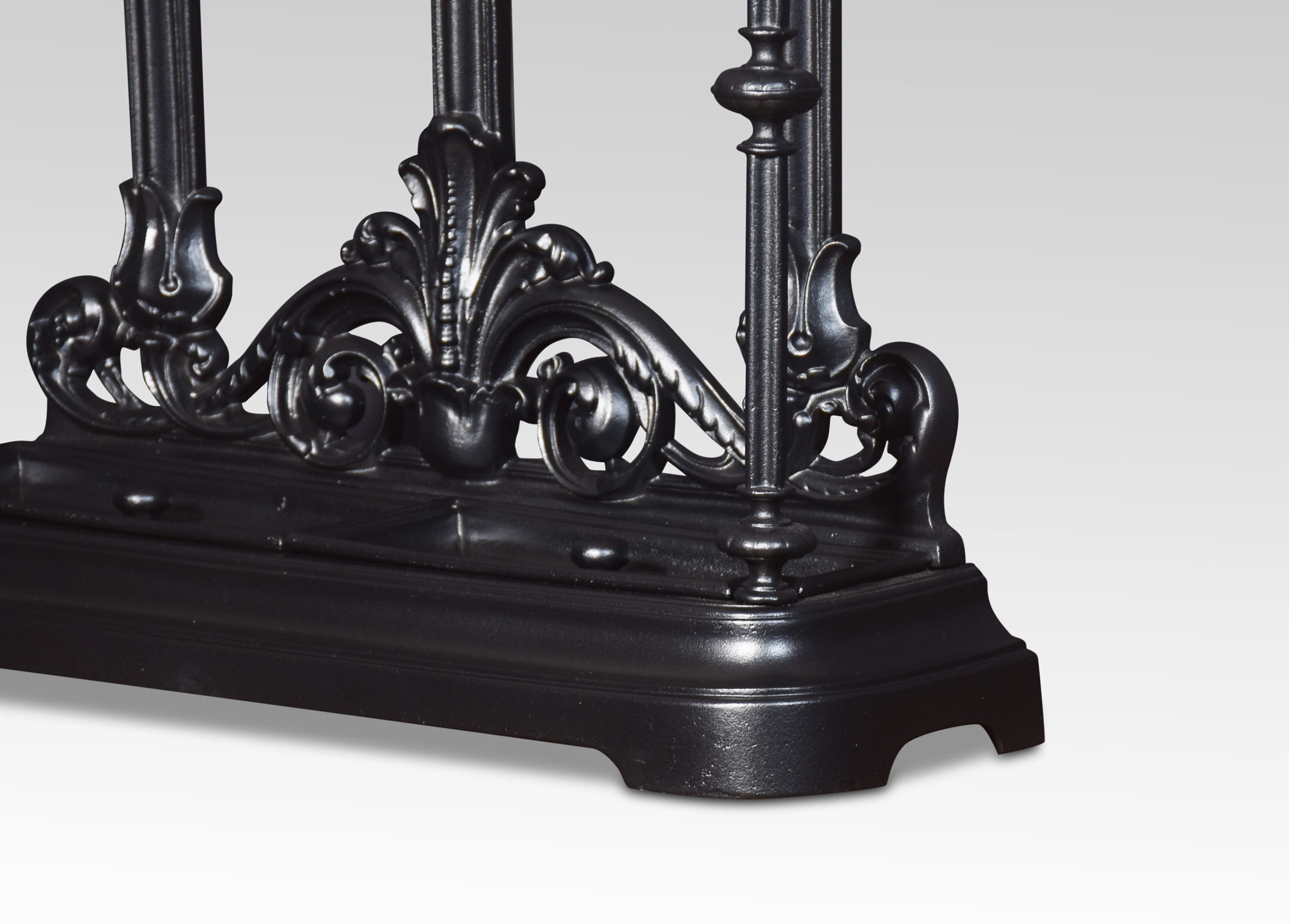 Cast Iron stick stand, the shaped top with foliating motif above the shaped bar to receive sticks and umbrellas, the base with original drip trays and raised on a shaped platform.