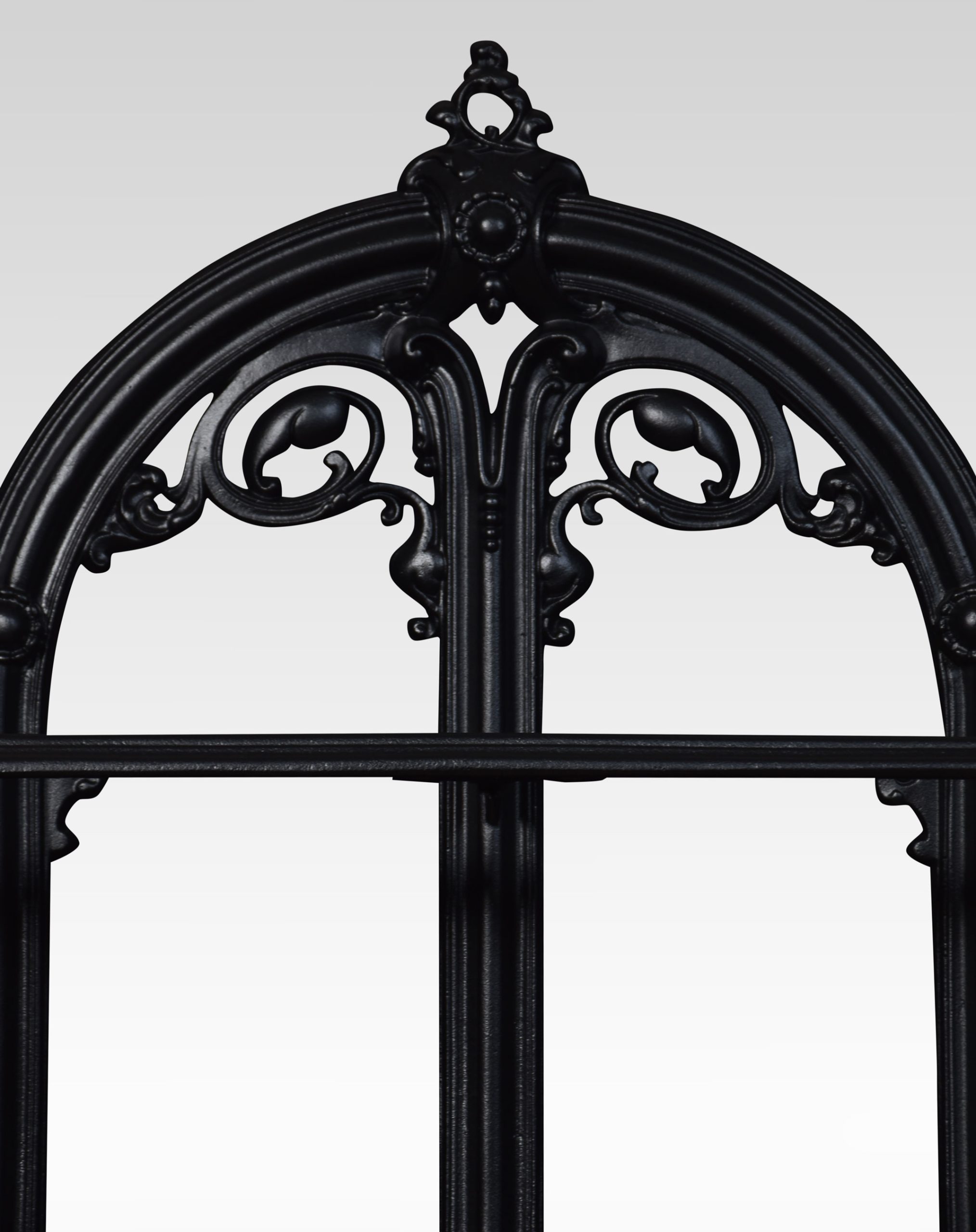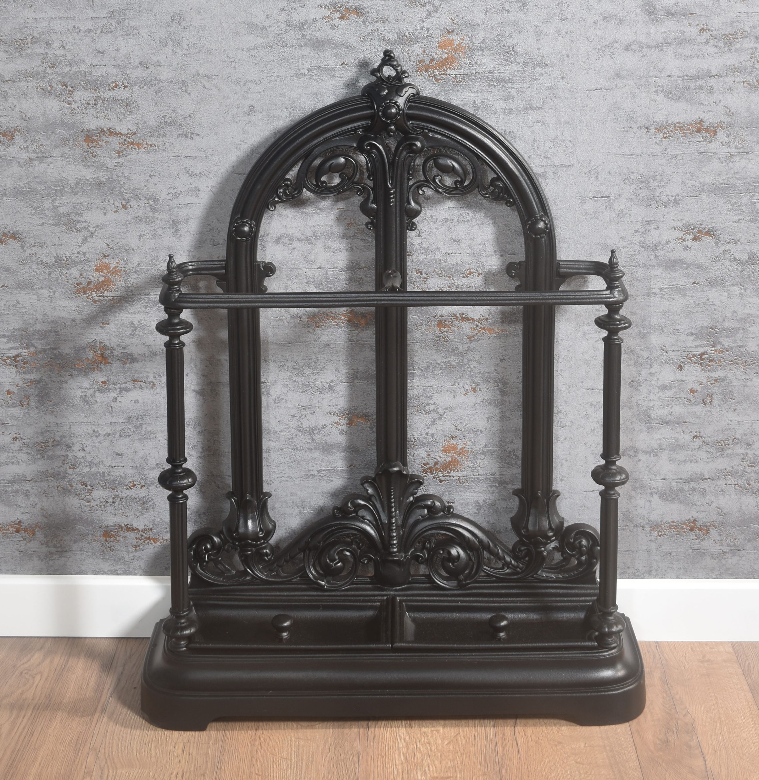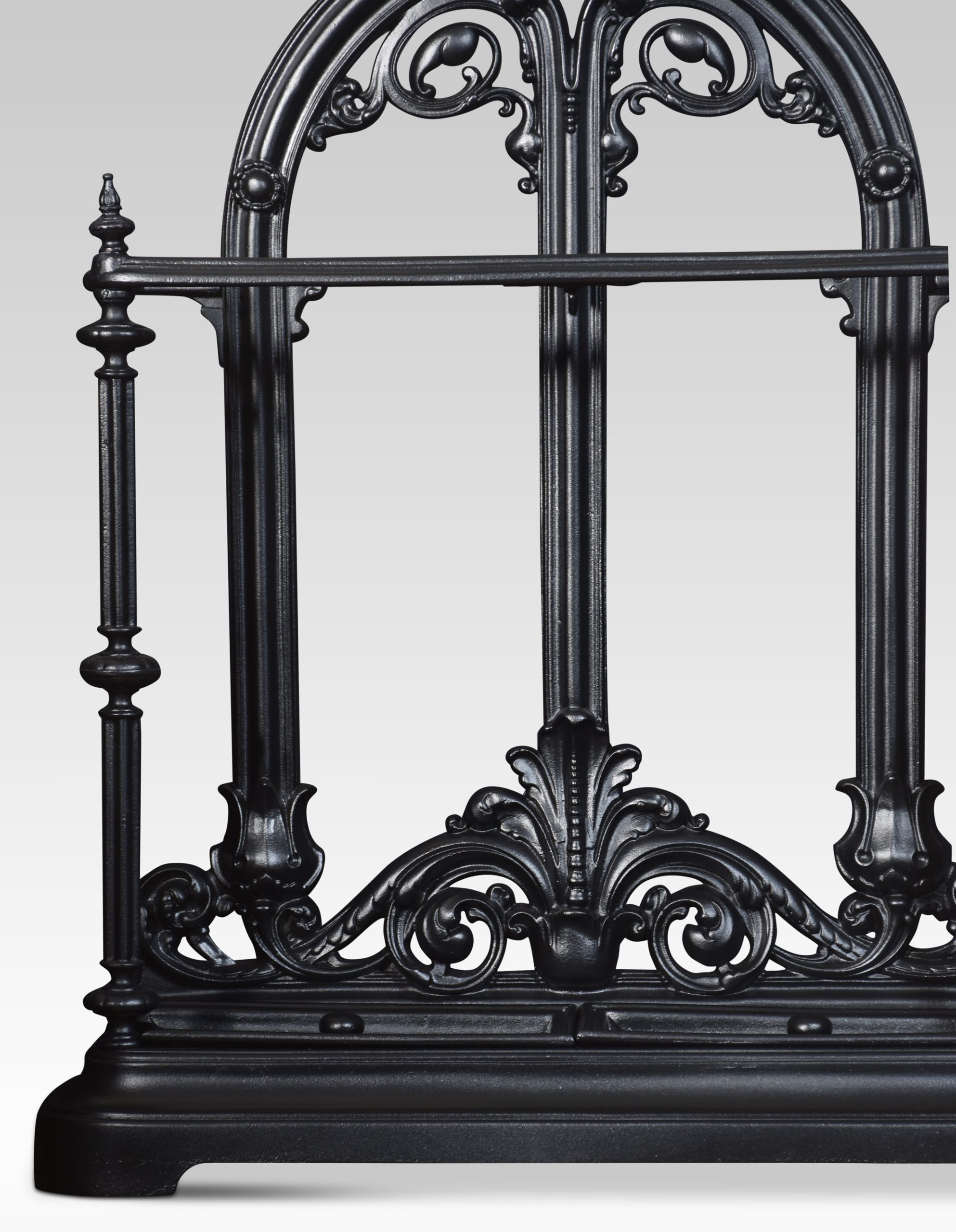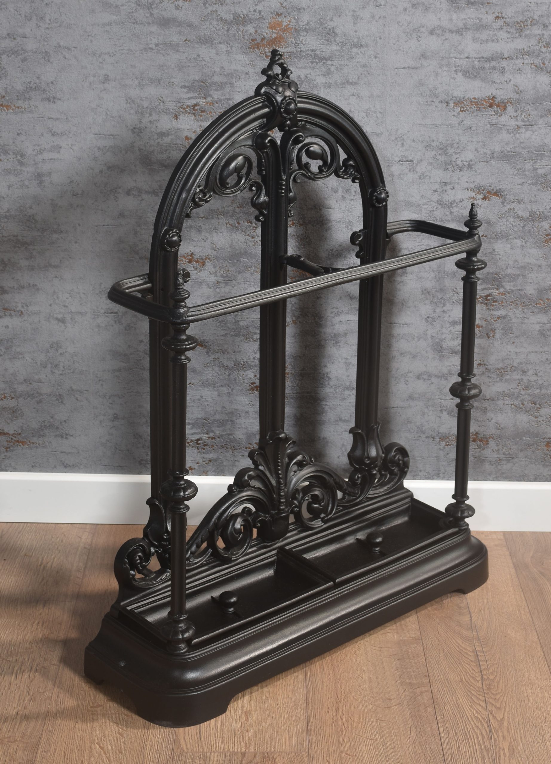 Cast Iron stick stand, the shaped top with foliating motif above the shaped bar to receive sticks and umbrellas, the base with original drip trays and raised on a shaped platform.