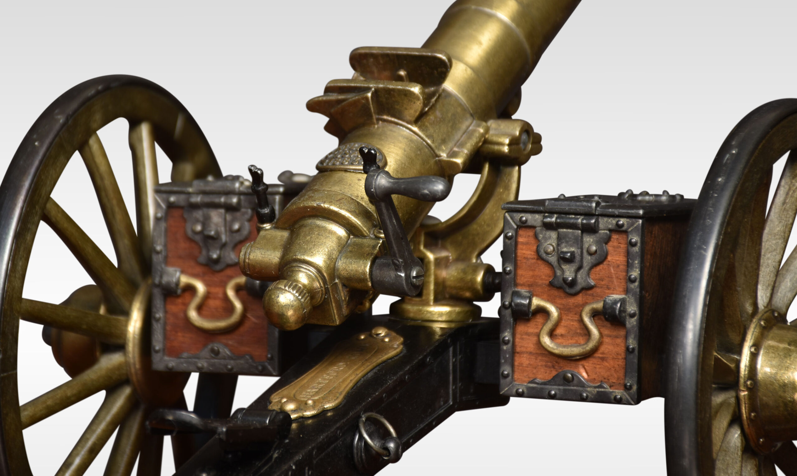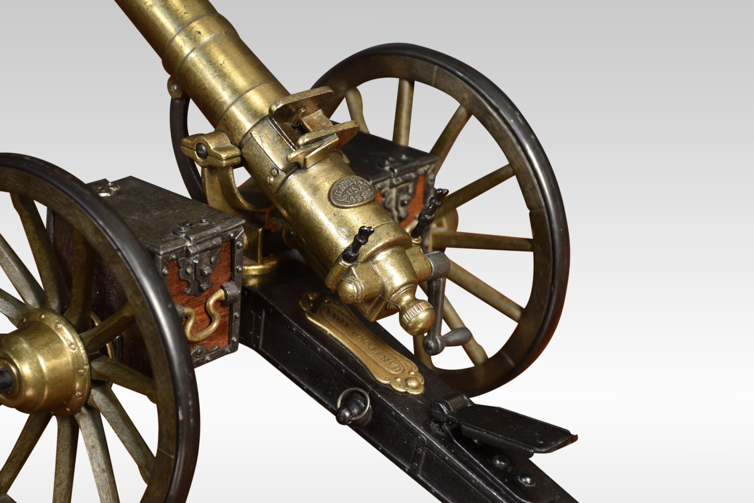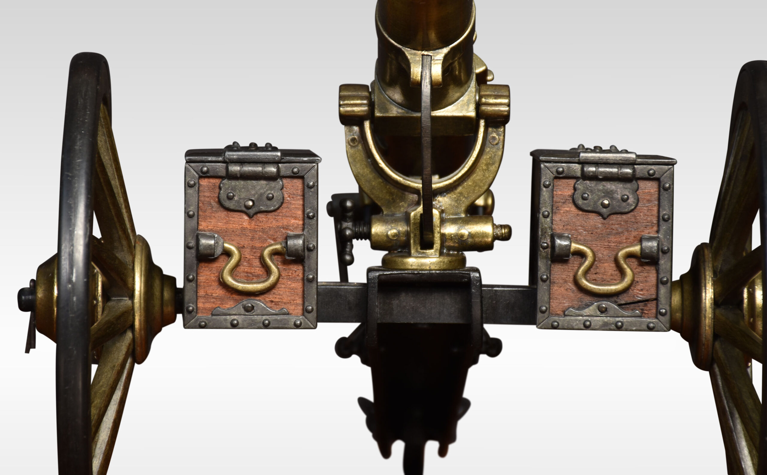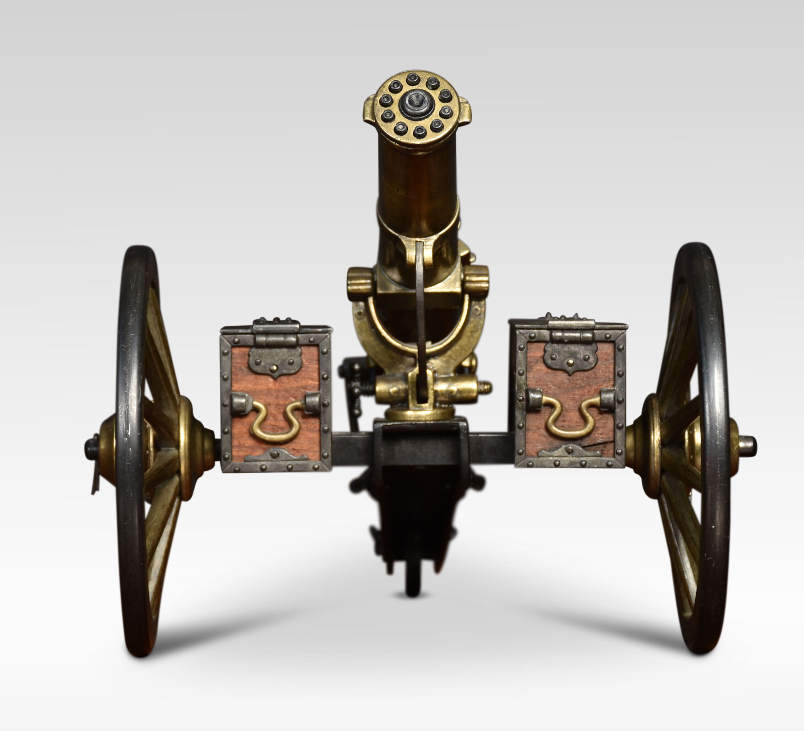 Desktop model of a Gatling field gun, the turned brass barrel set to a tilt mechanism on the painted metal carriage with brass bossed wheels, the working hand crank rotating the inner barrel to create a realist firing action, brass plaque stamped Hartford to carriage.