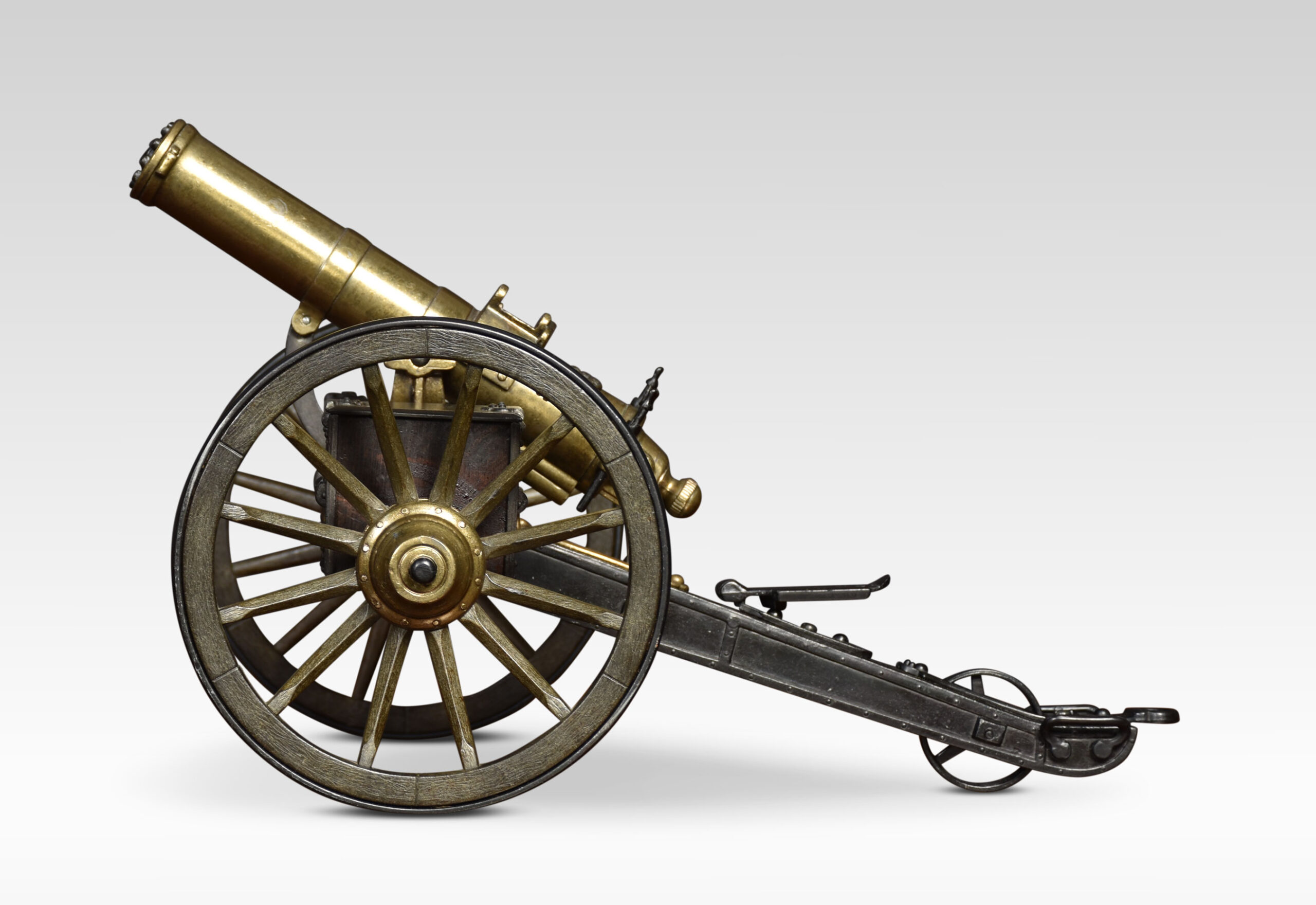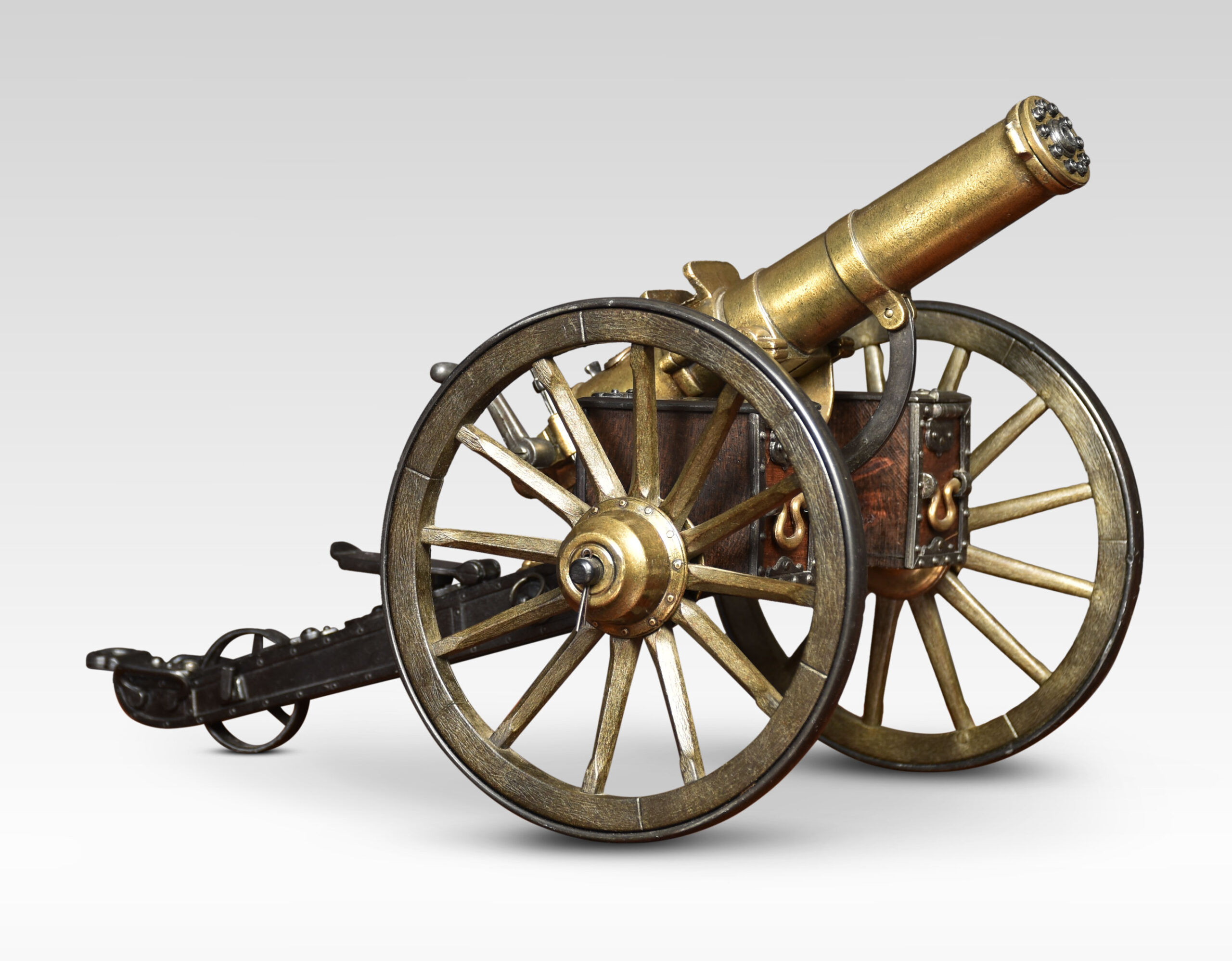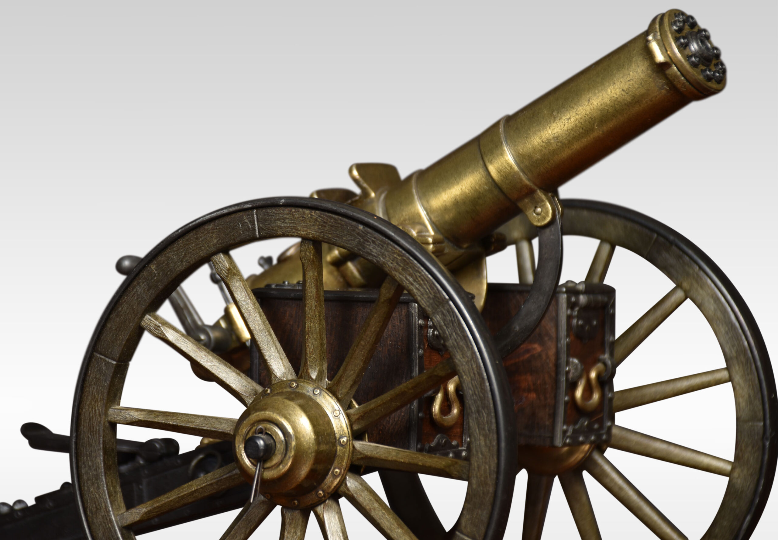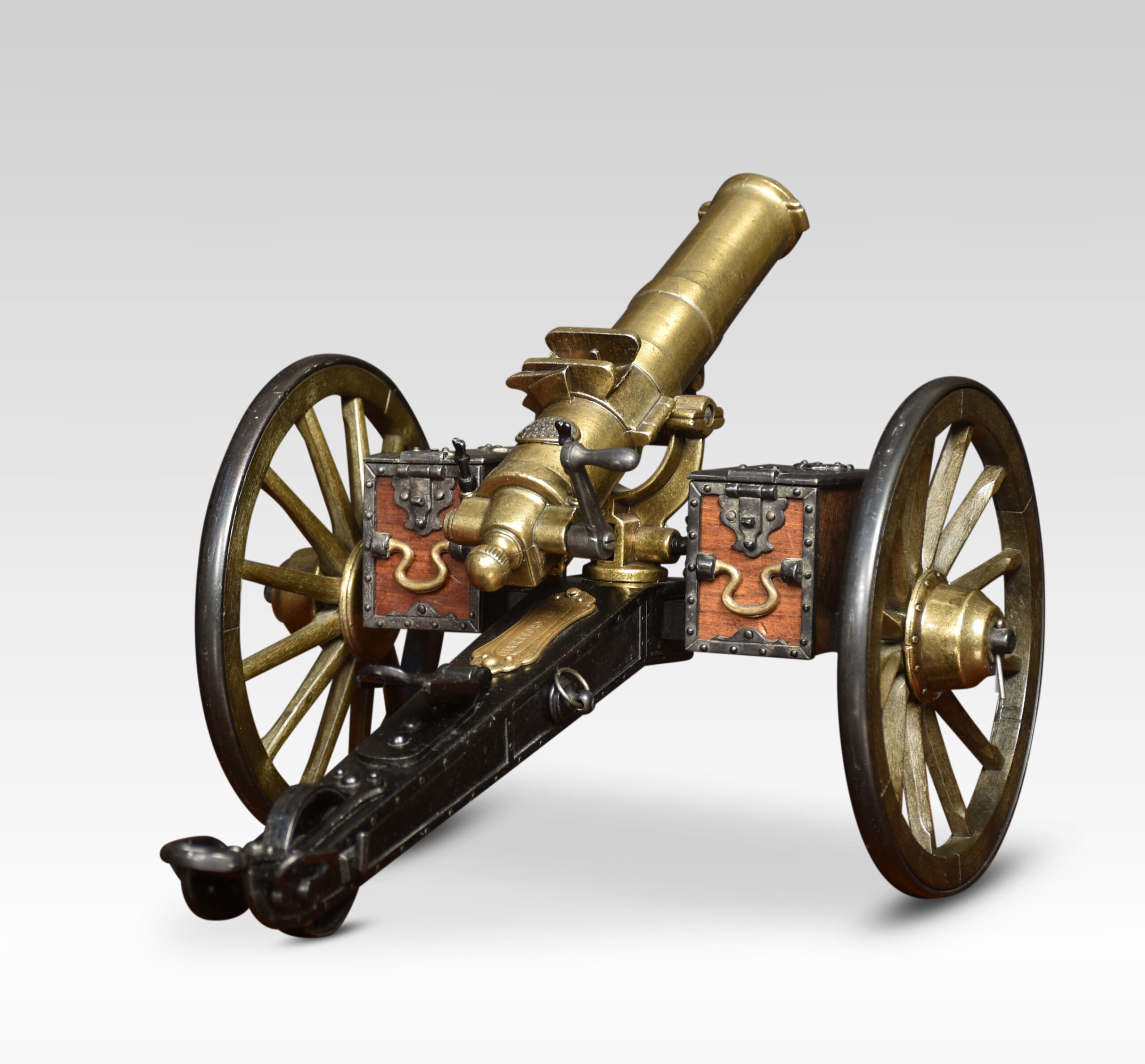 Desktop model of a Gatling field gun, the turned brass barrel set to a tilt mechanism on the painted metal carriage with brass bossed wheels, the working hand crank rotating the inner barrel to create a realist firing action, brass plaque stamped Hartford to carriage.