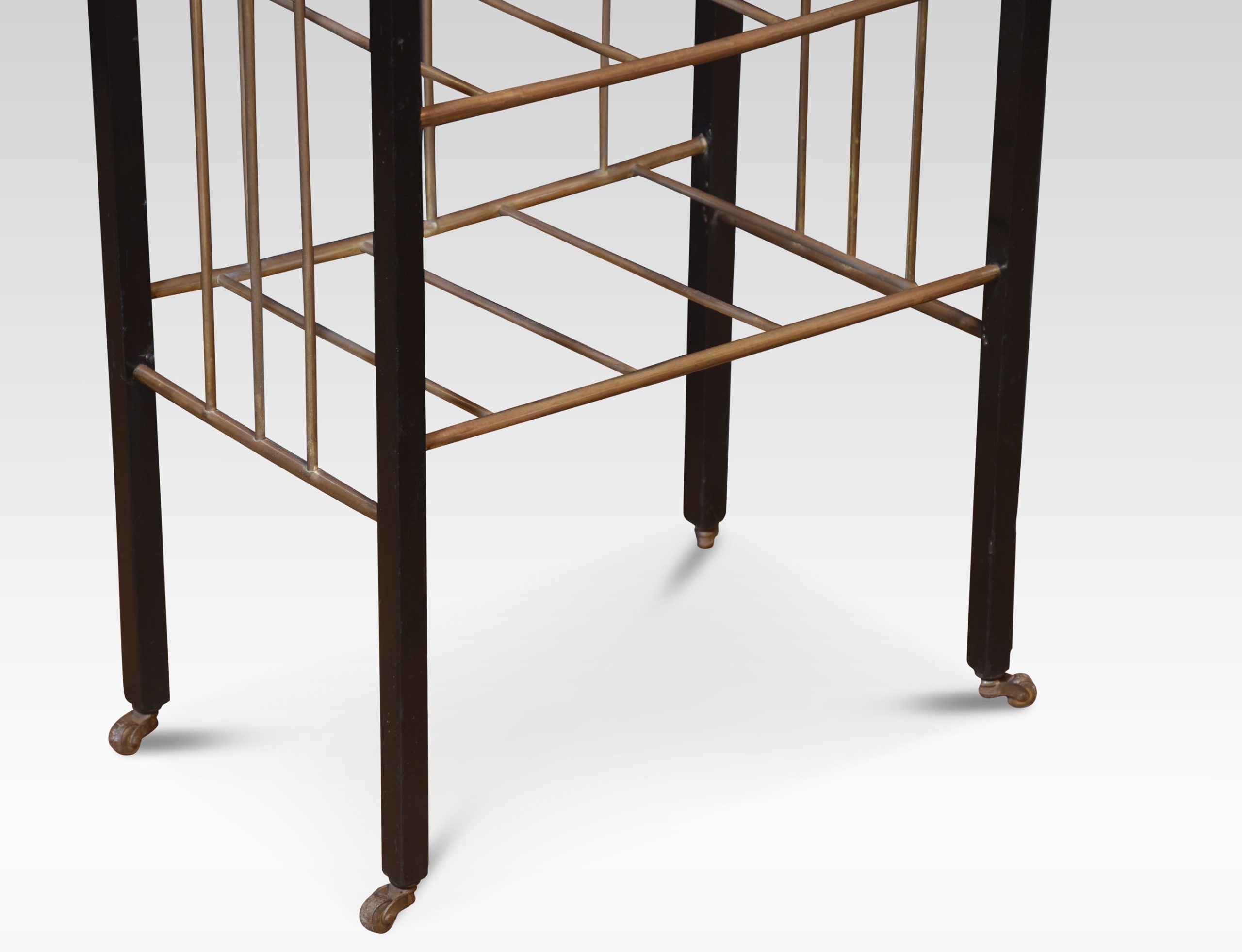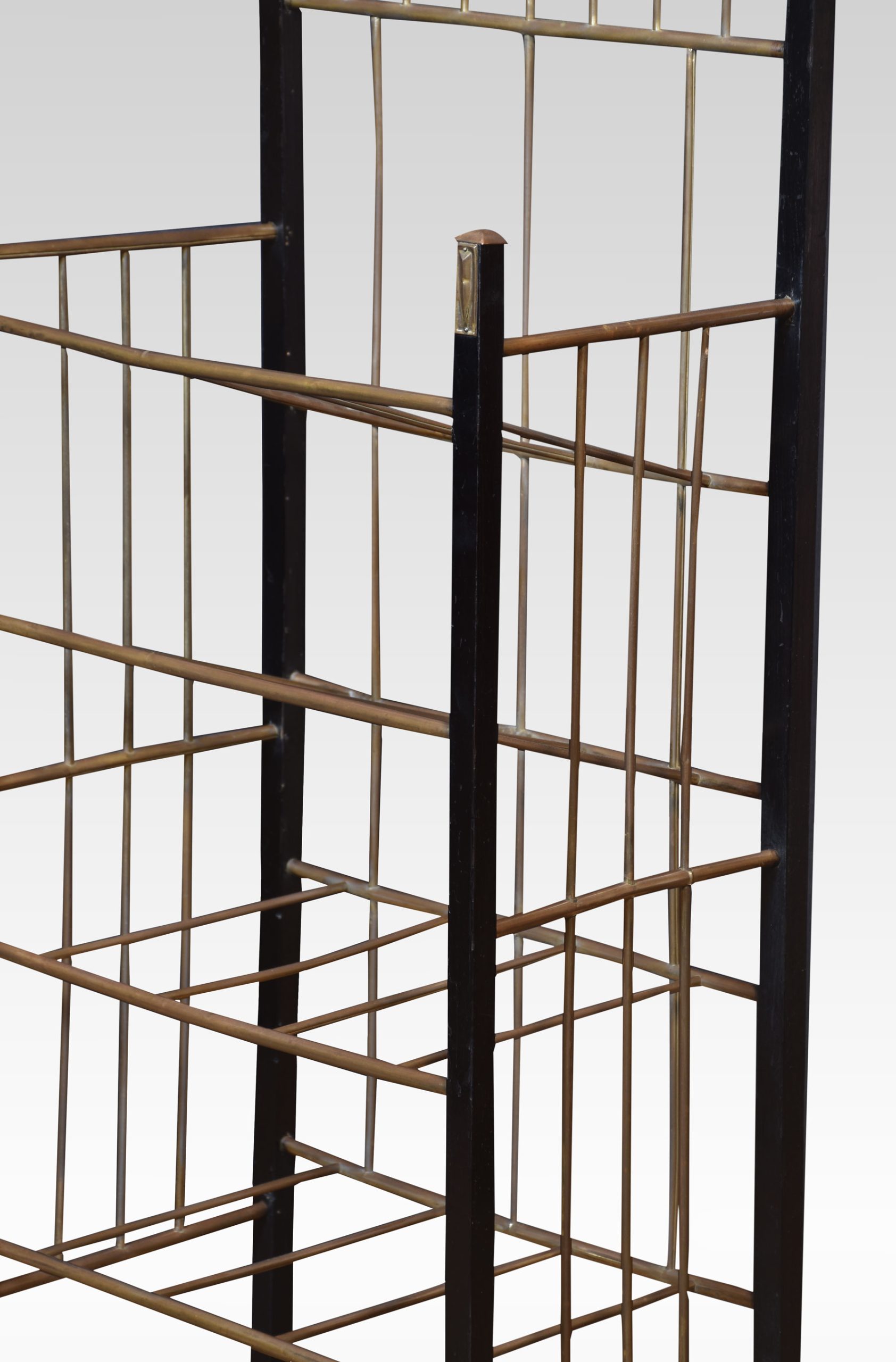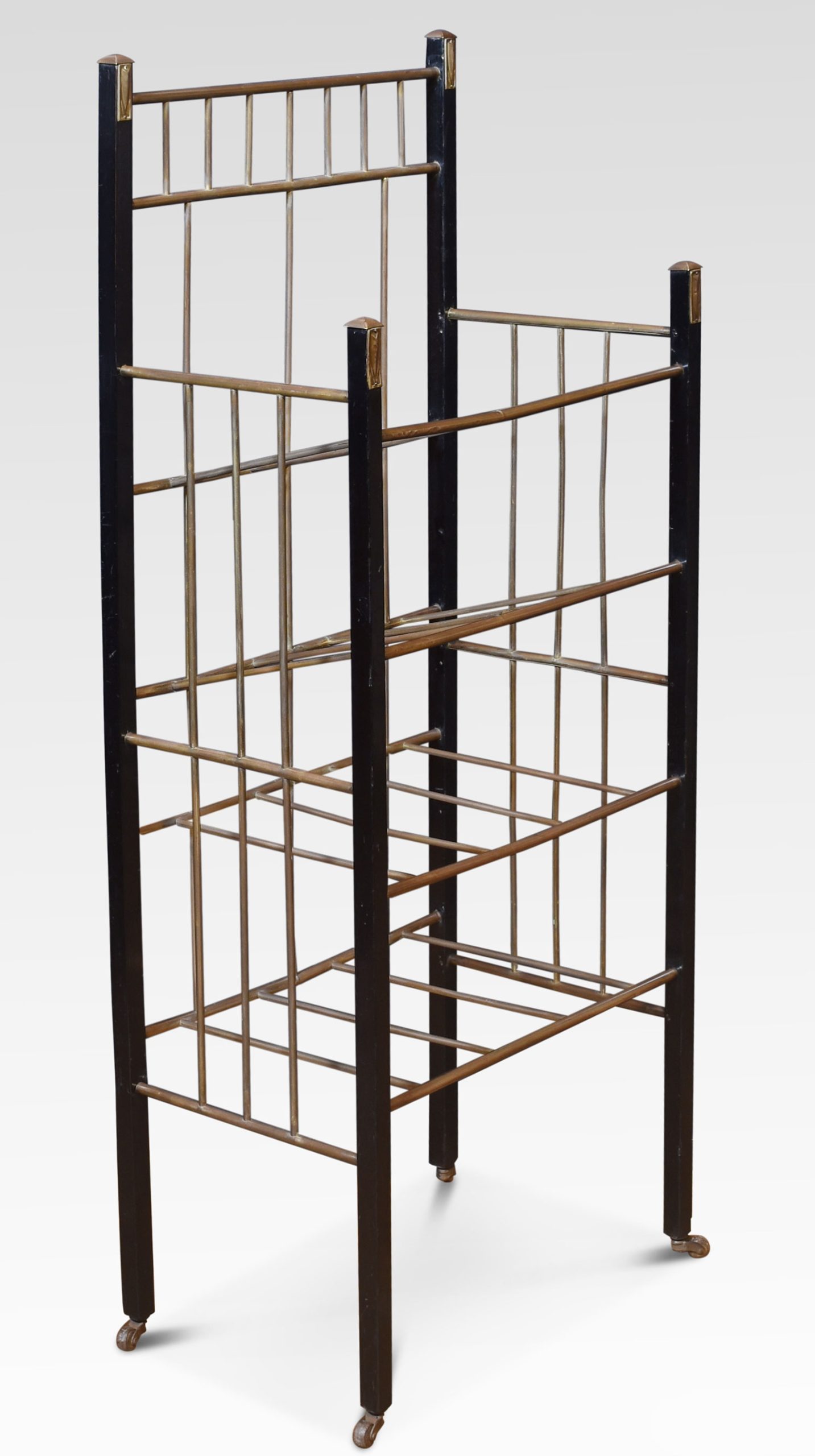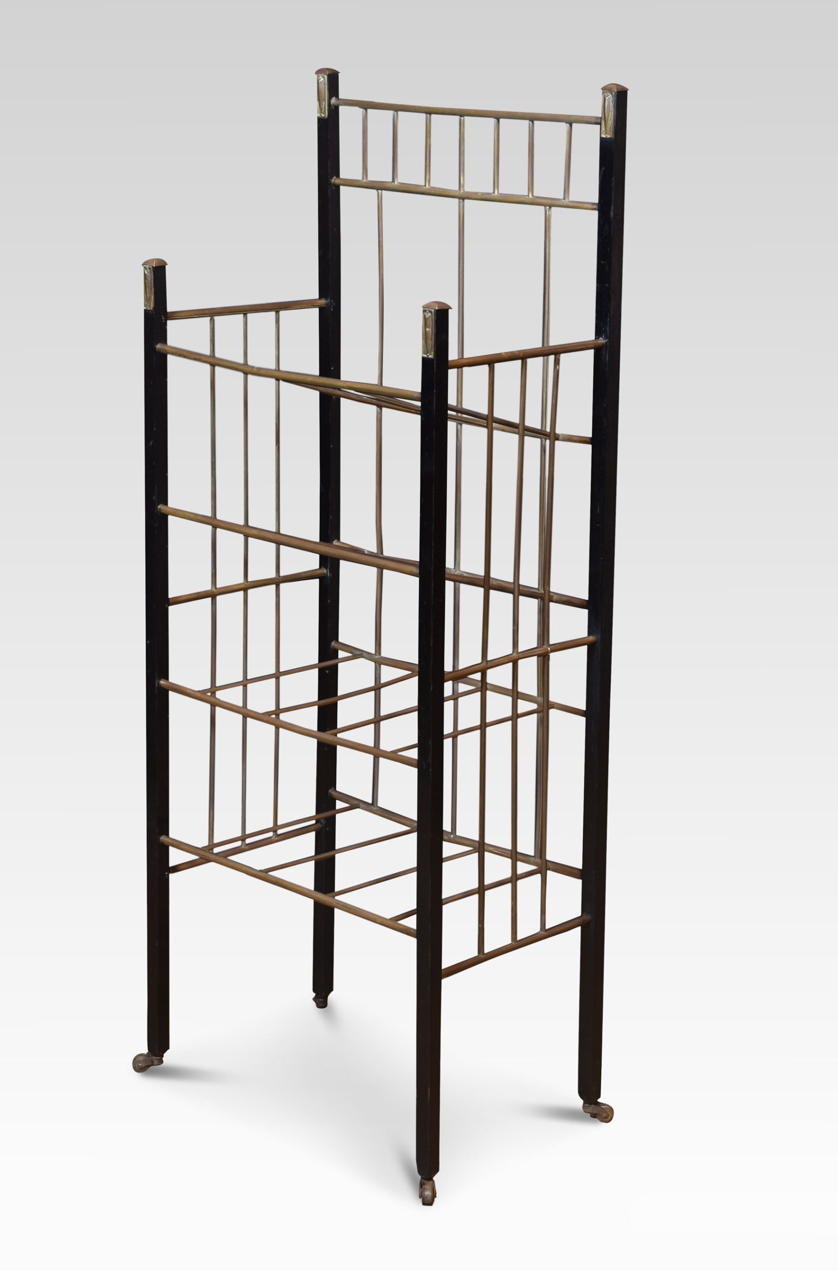 An early 20th-century newspaper stand. The ebonised frame fitted with tubular brass three-tier supports terminating in brass casters.