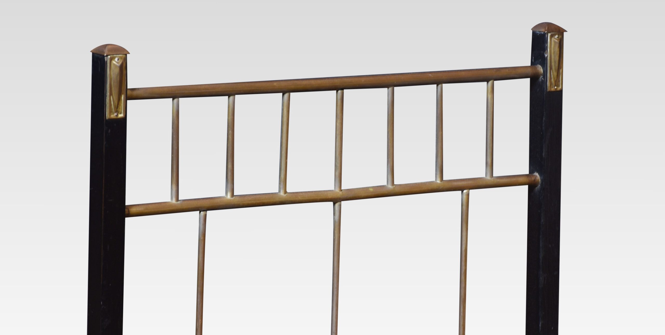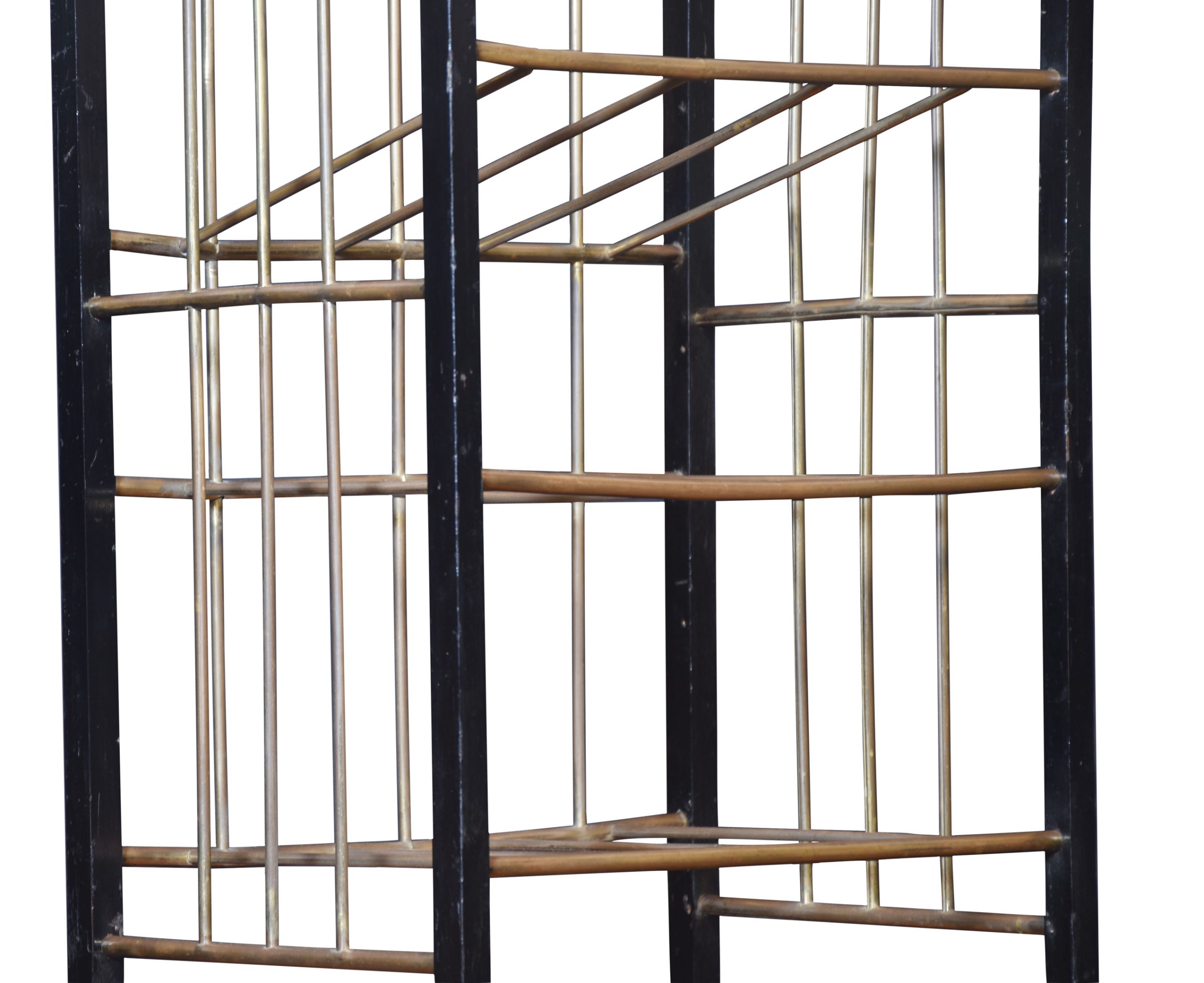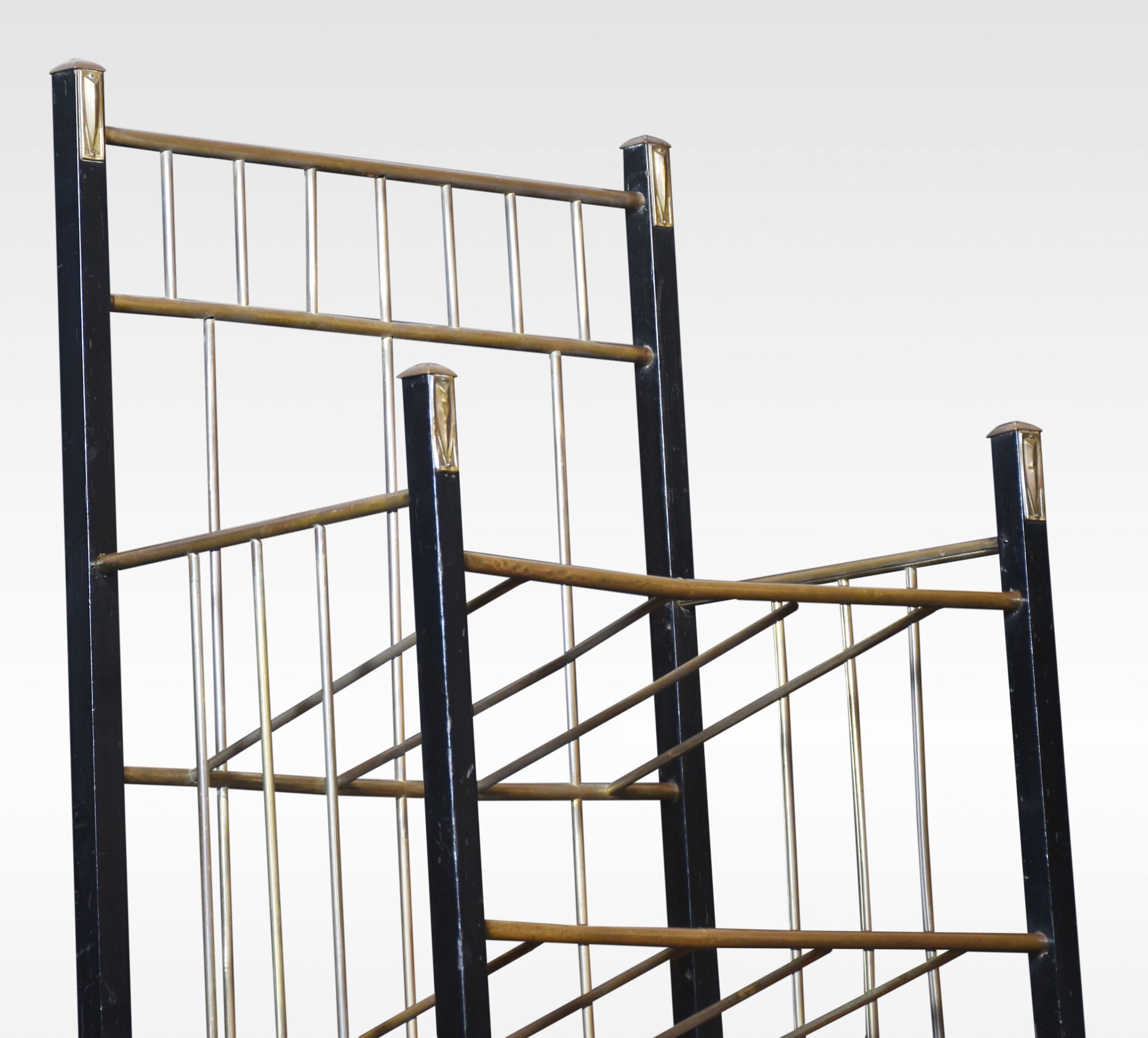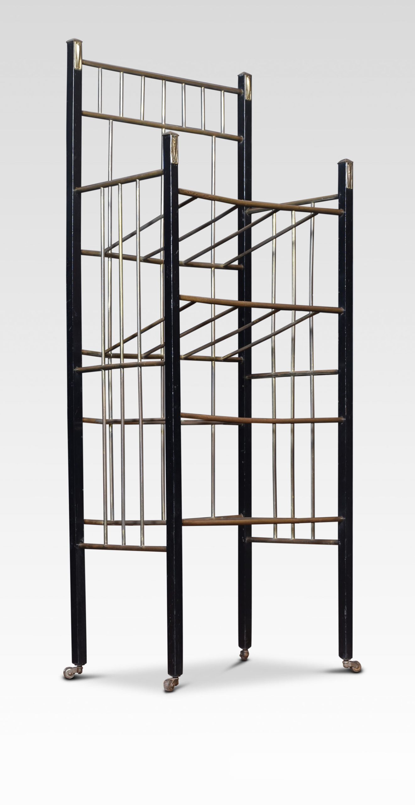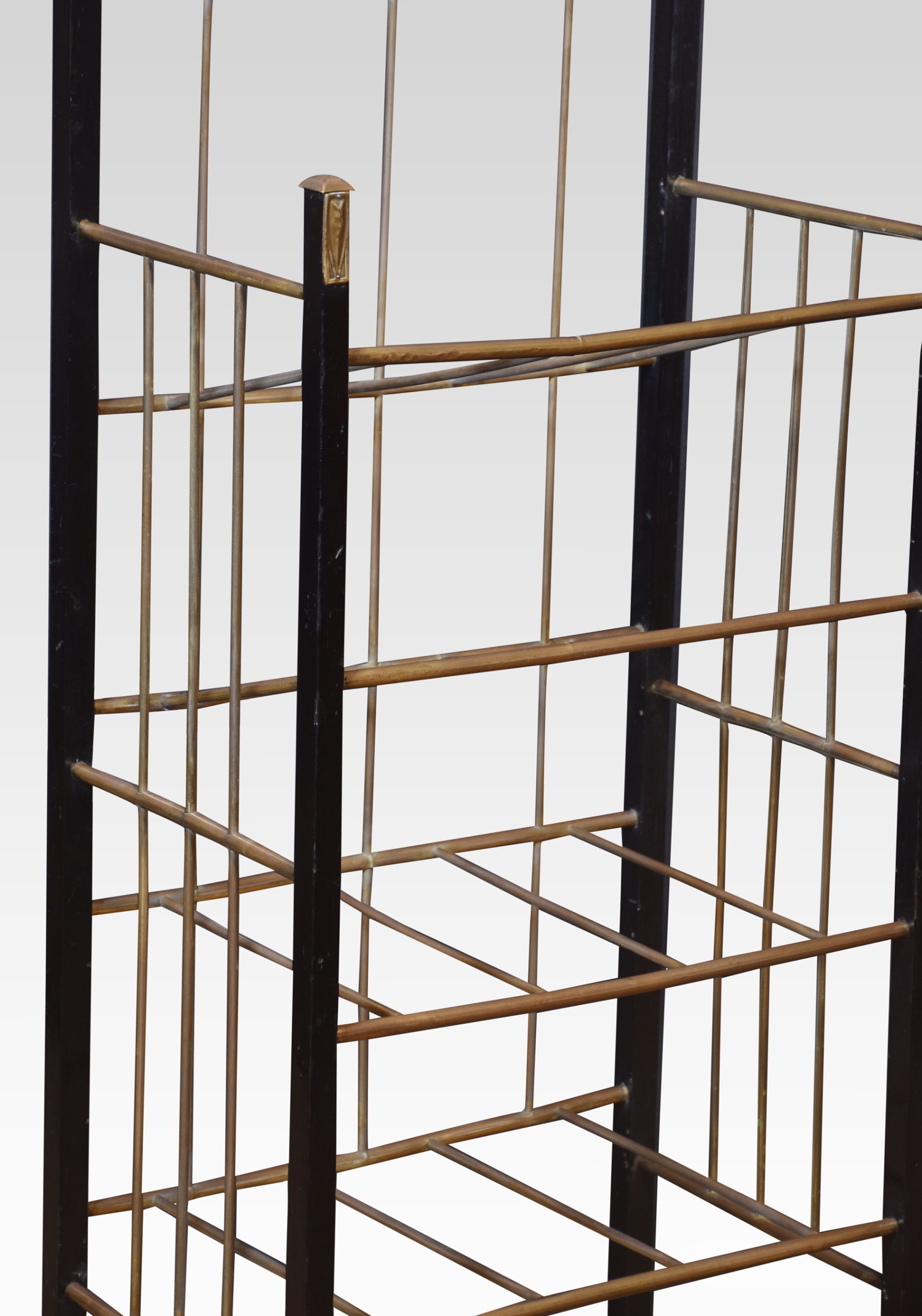 An early 20th-century newspaper stand. The ebonised frame fitted with tubular brass three-tier supports terminating in brass casters.