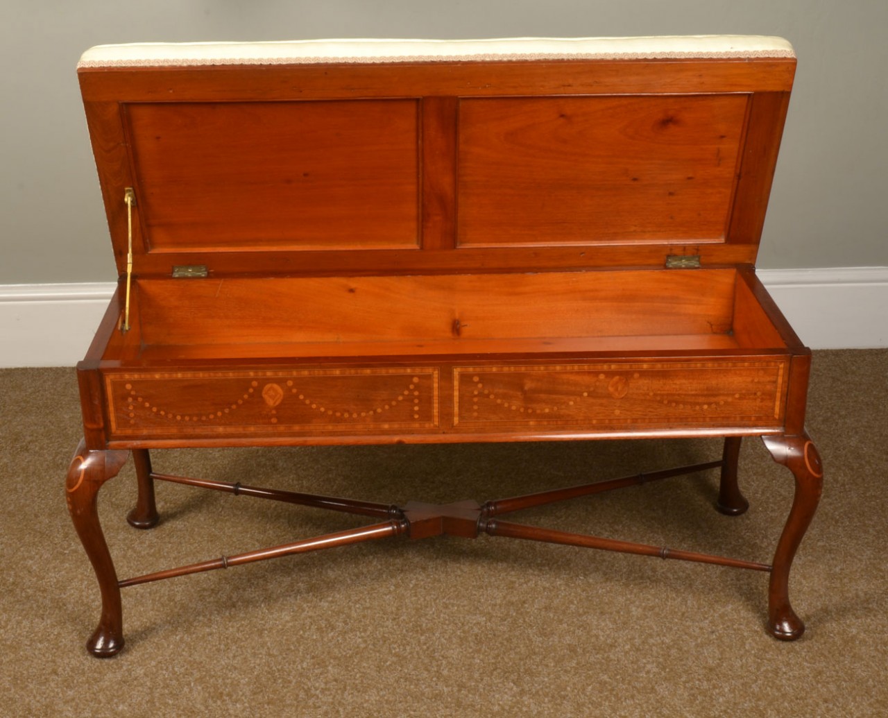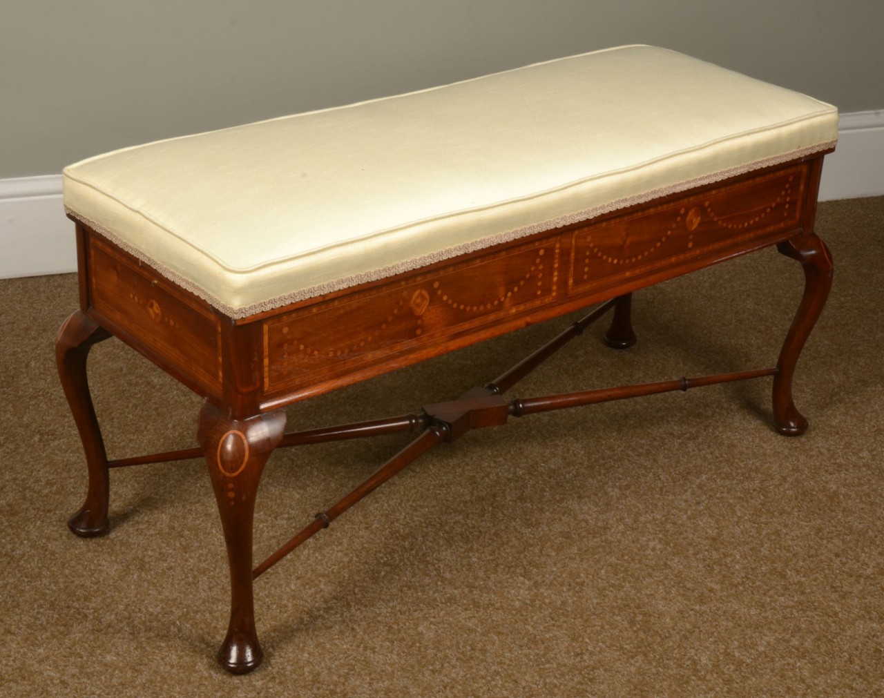 Edwardian mahogany inlaid duet piano stool the rectangular cream upholstered seat opening to reveal large storage area the freeze finely decorated in inlay all raised up on cabriole legs united by stretcher