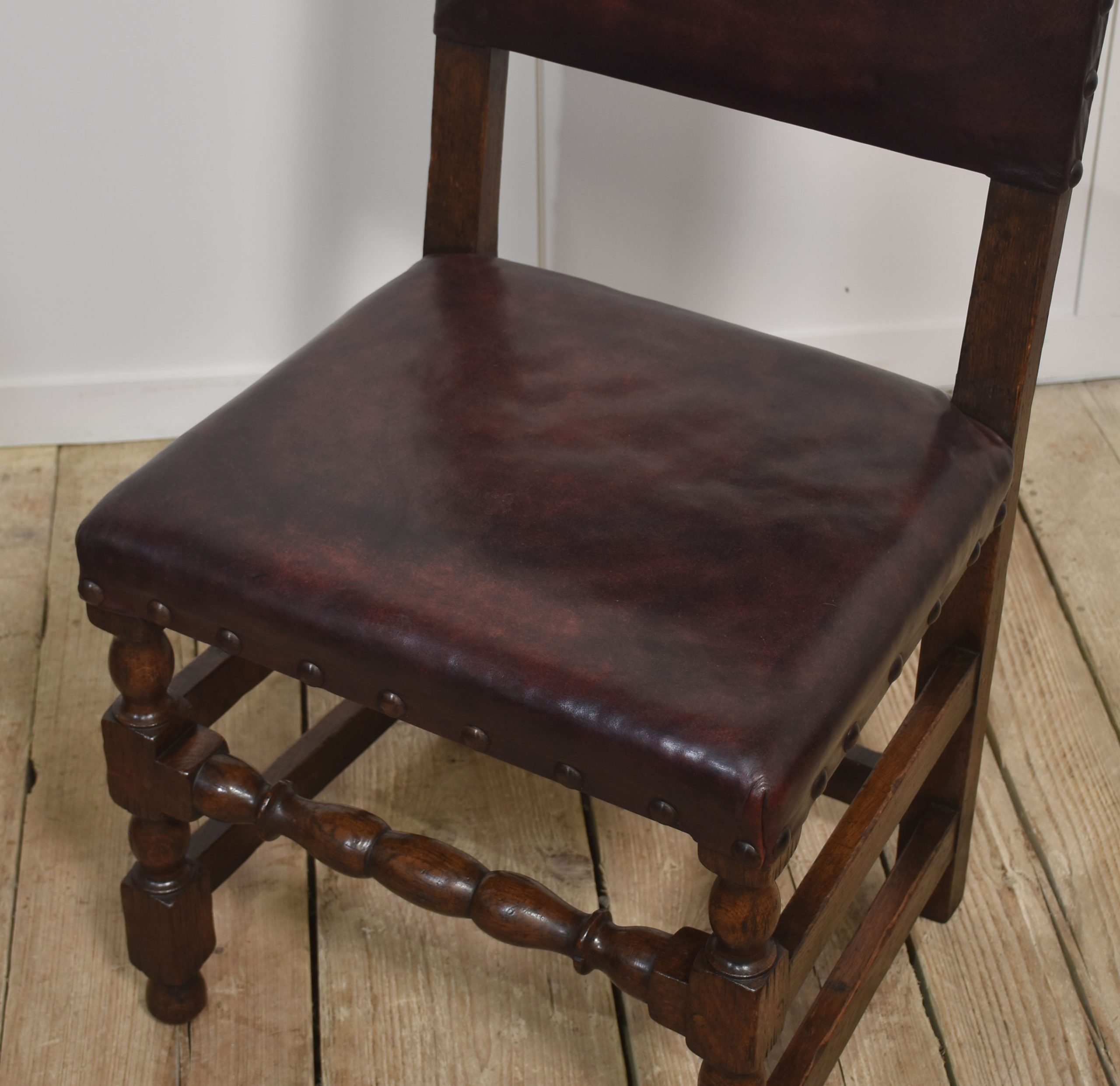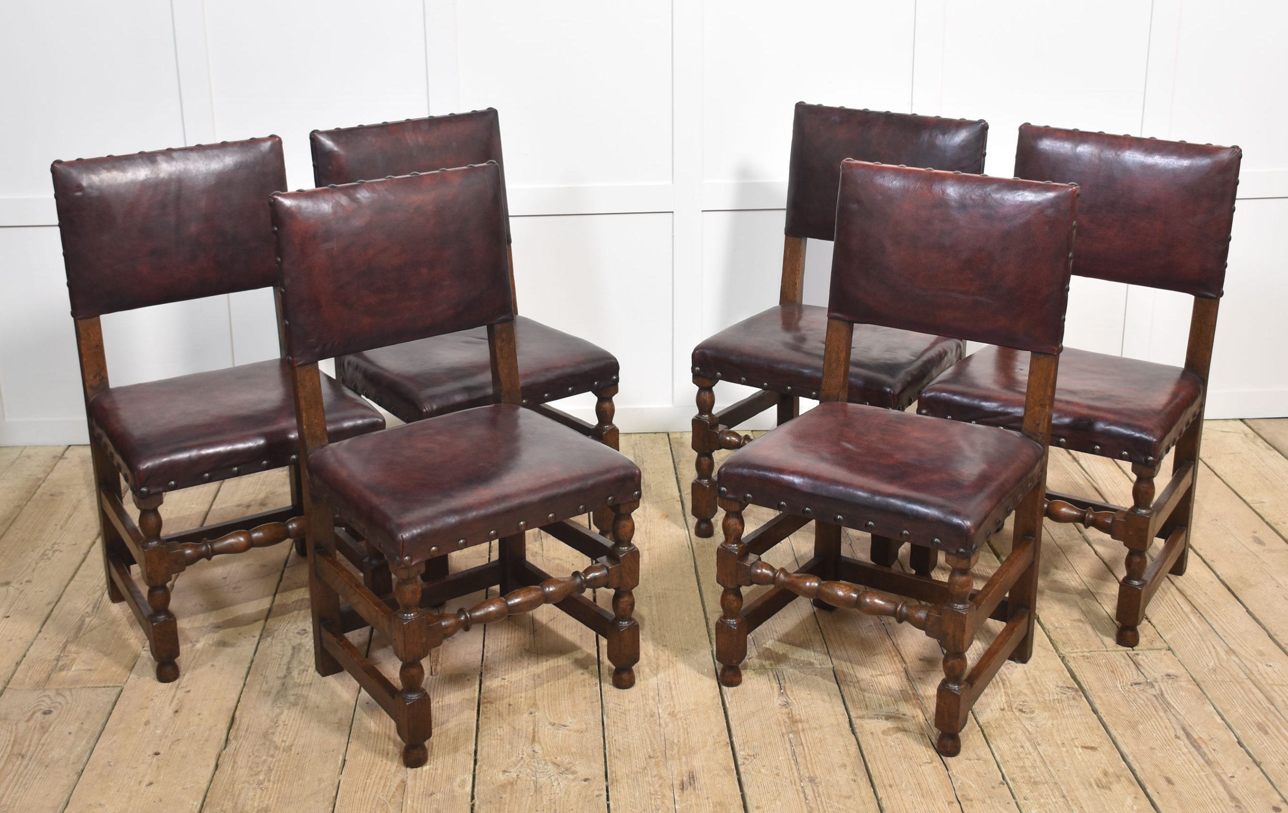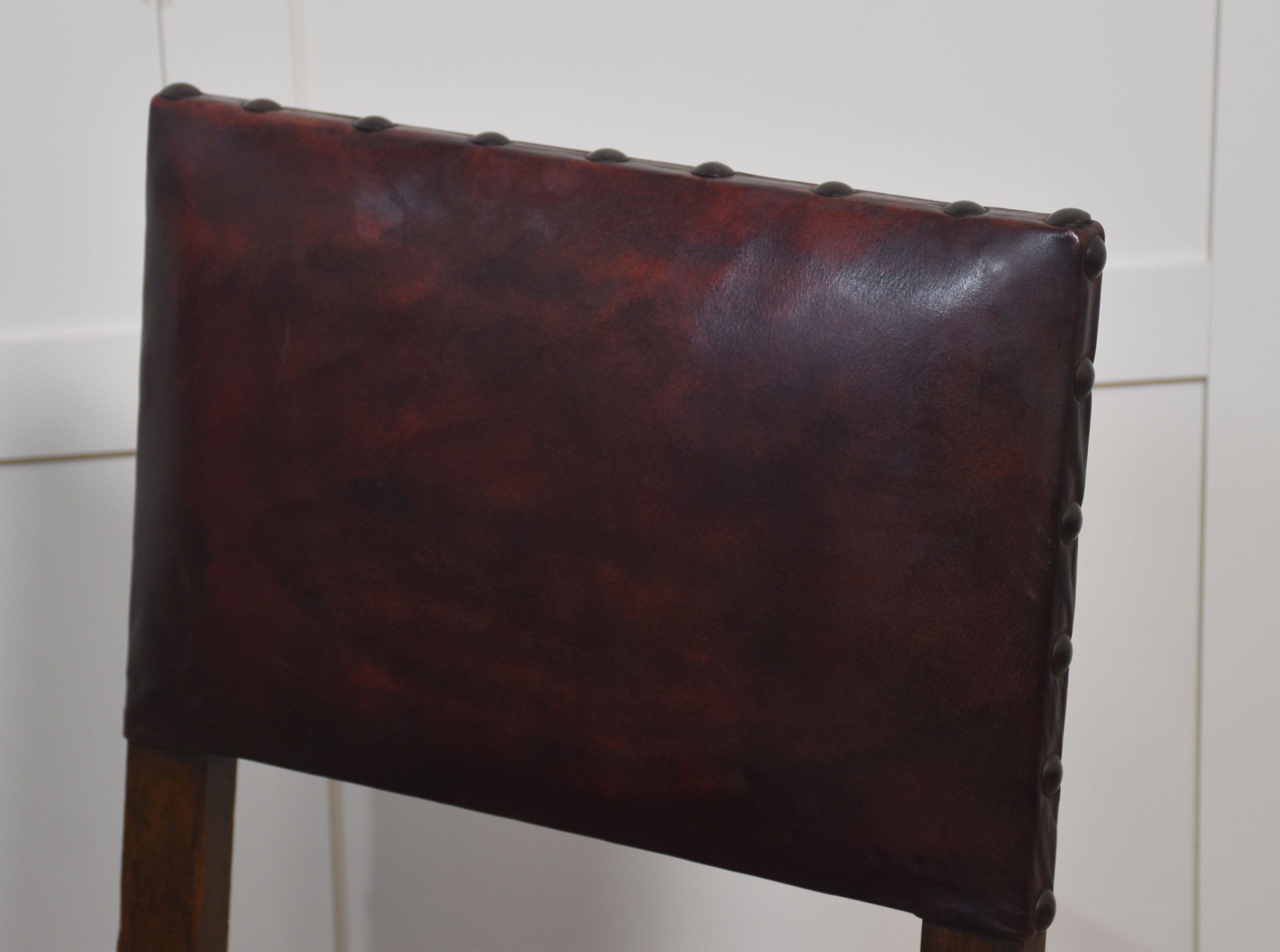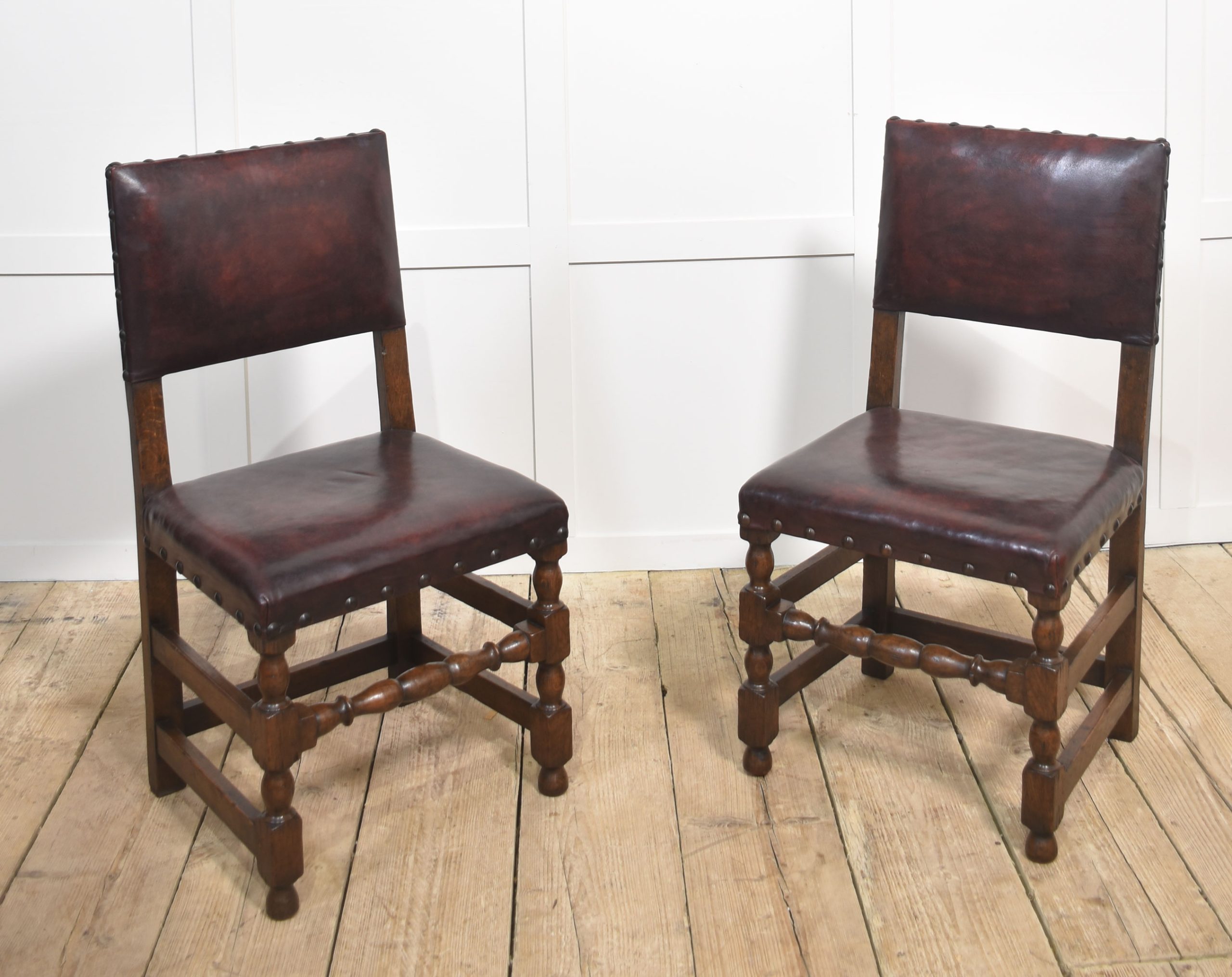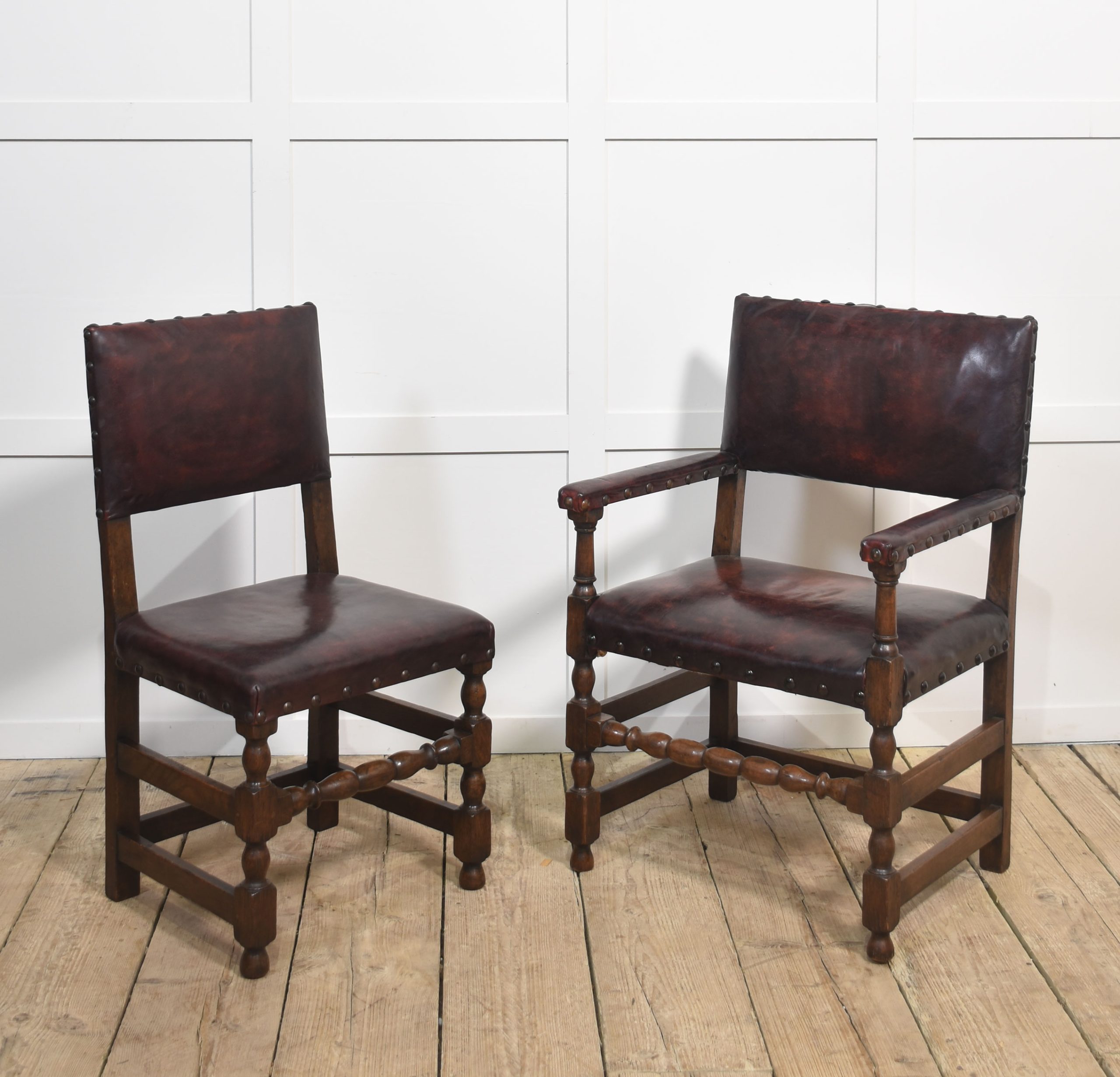 Set of eight dining chairs, the square leather-studded backs above overstuffed seats, the carvers with padded arms. All raised on turned front legs united by stretchers.