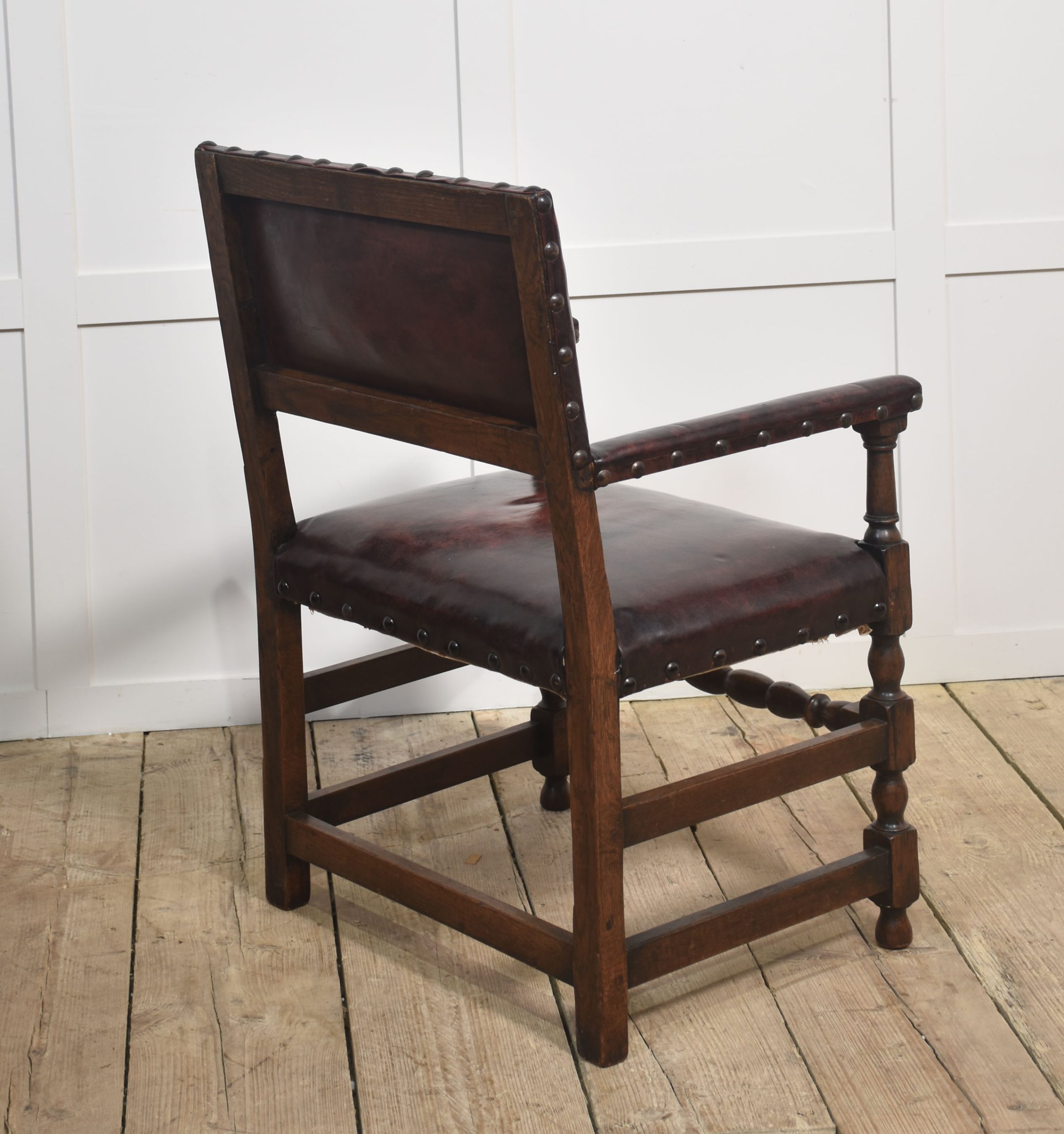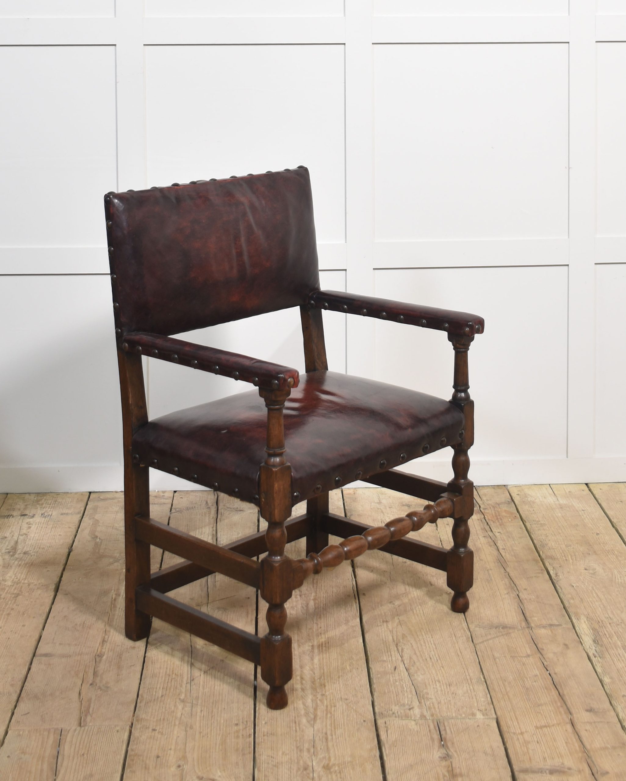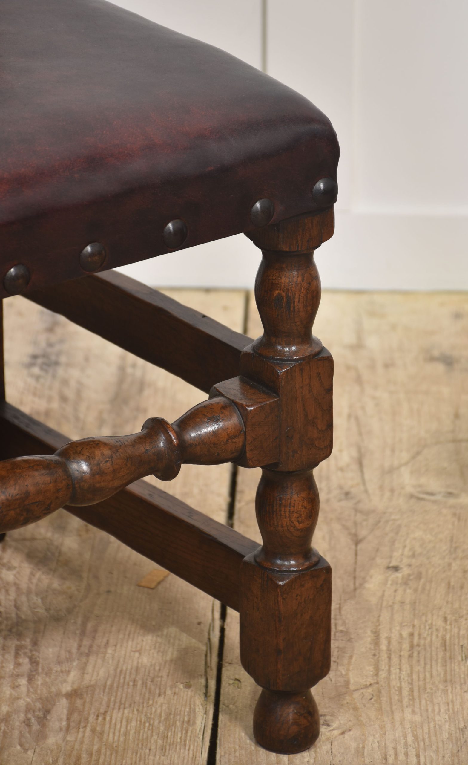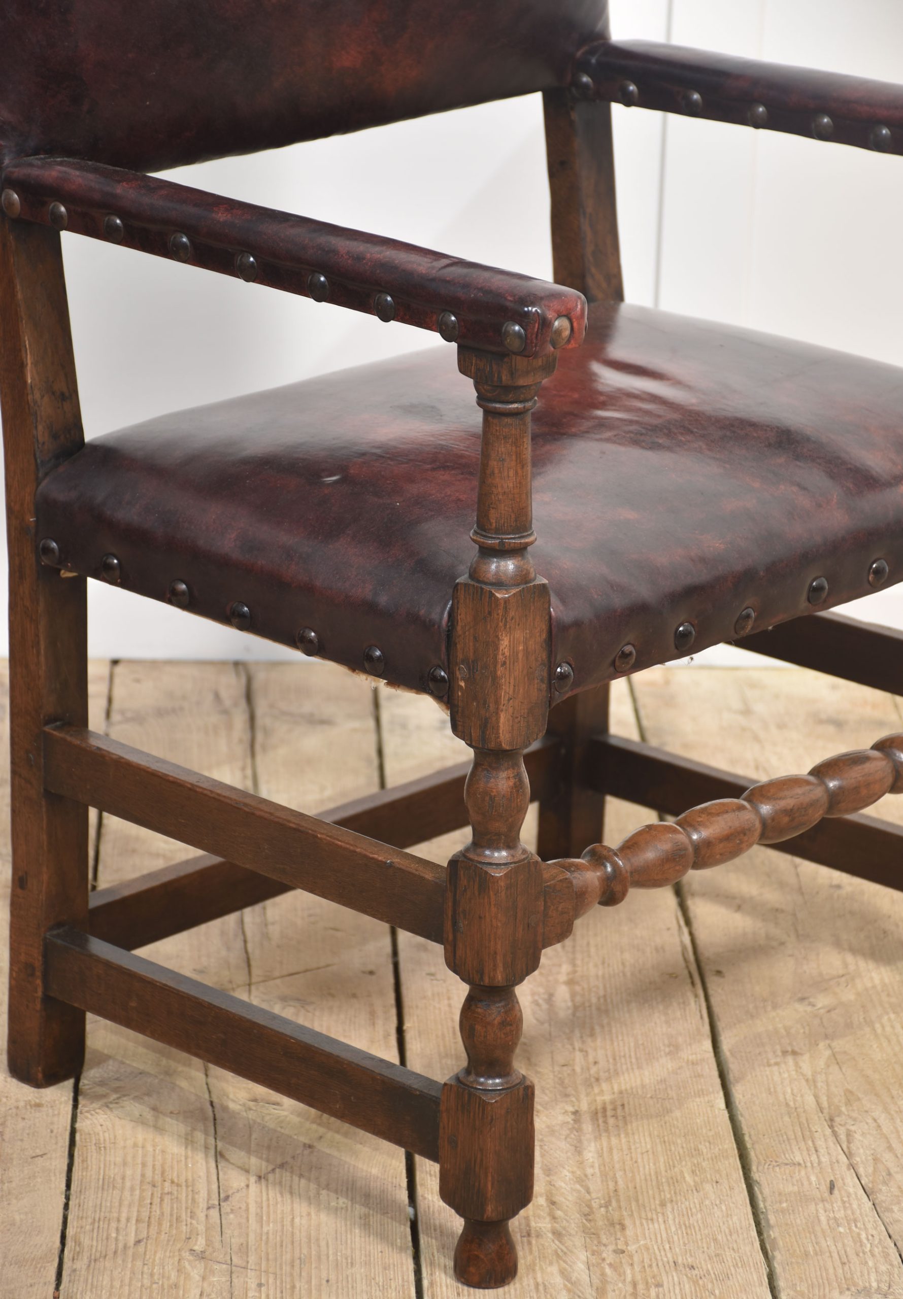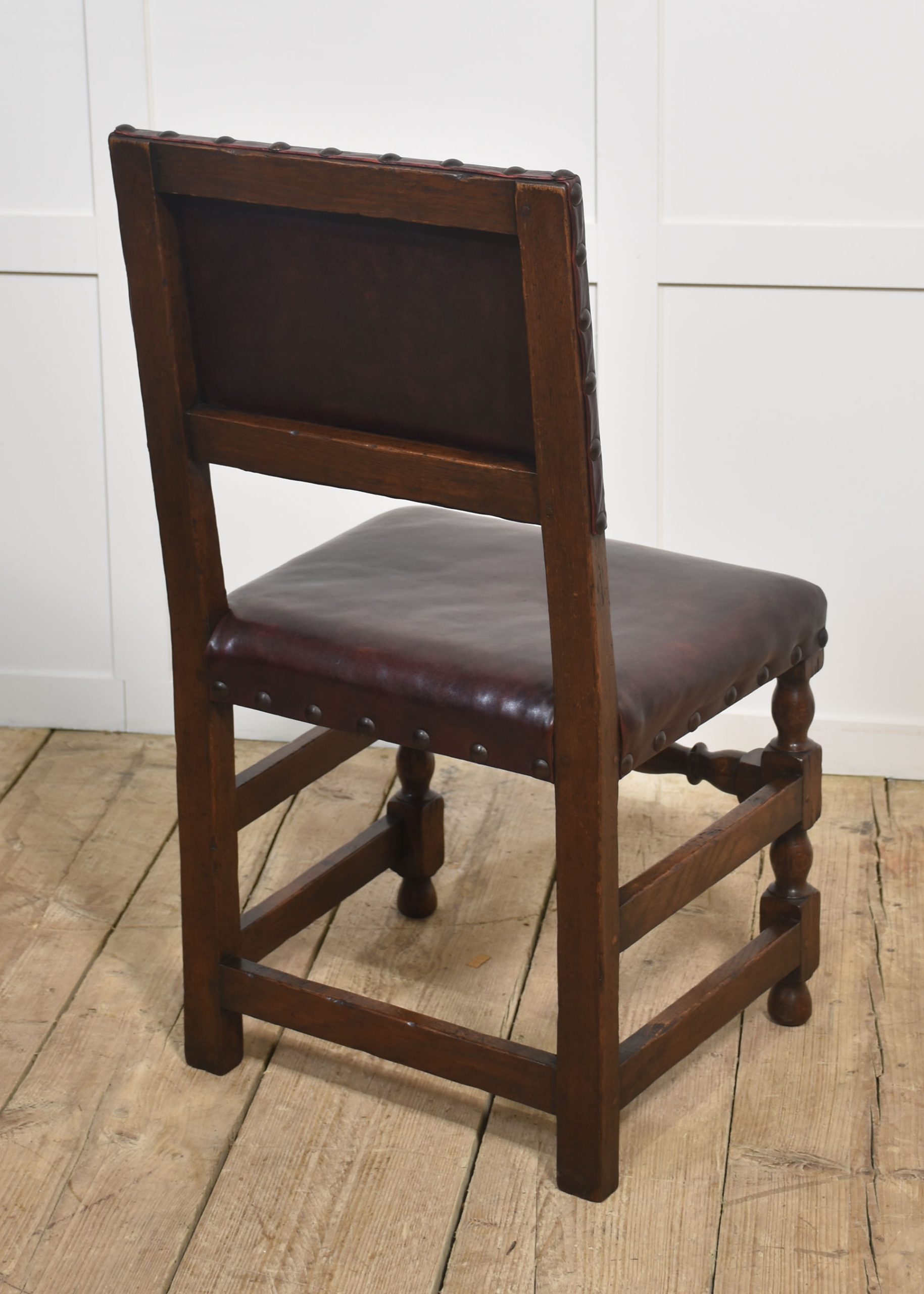 Set of eight dining chairs, the square leather-studded backs above overstuffed seats, the carvers with padded arms. All raised on turned front legs united by stretchers.