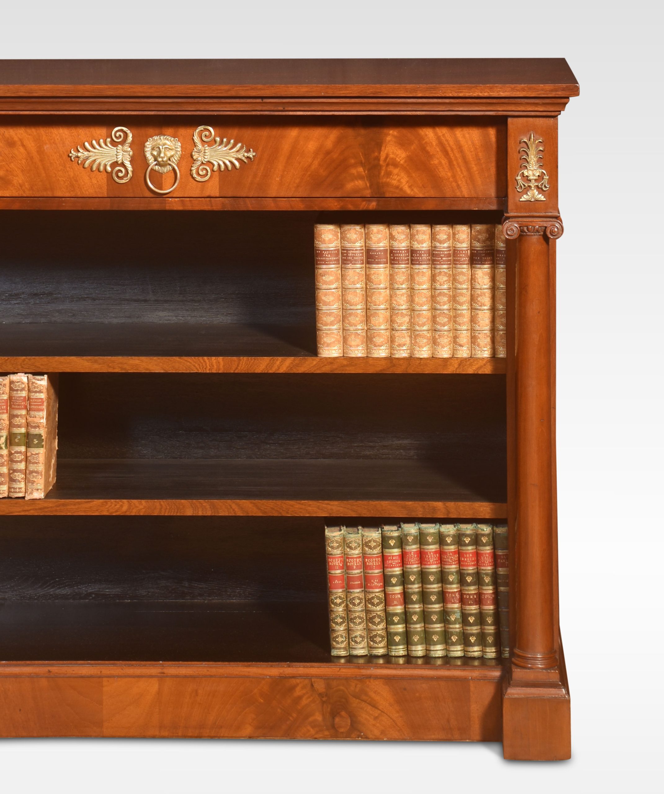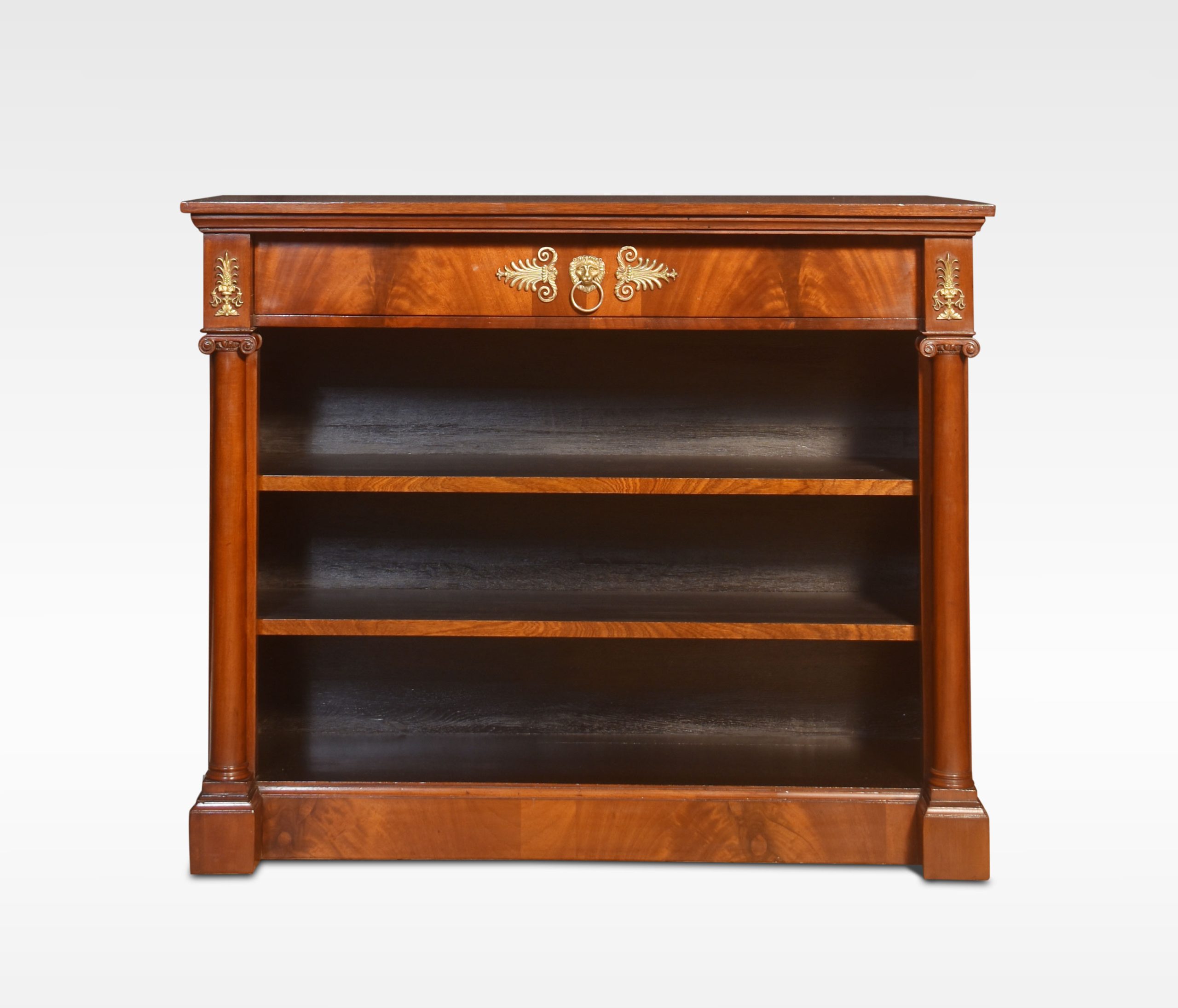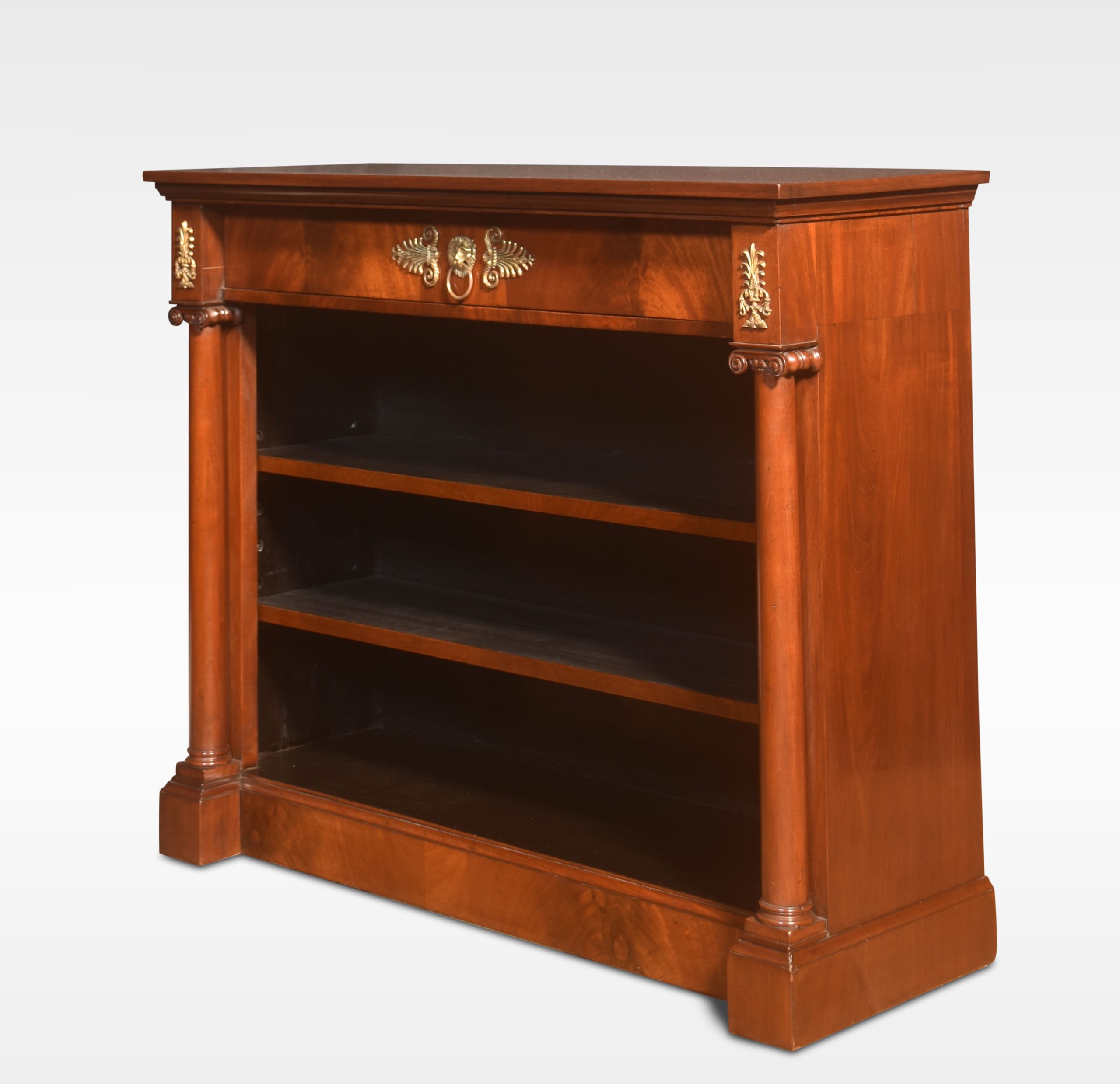 Mahogany open bookcase the rectangular well-figured top above large freeze drawer with central brass motif. To the adjustable shelved interior flanked by circular columns with brass capitals. All raised up on a plinth base.