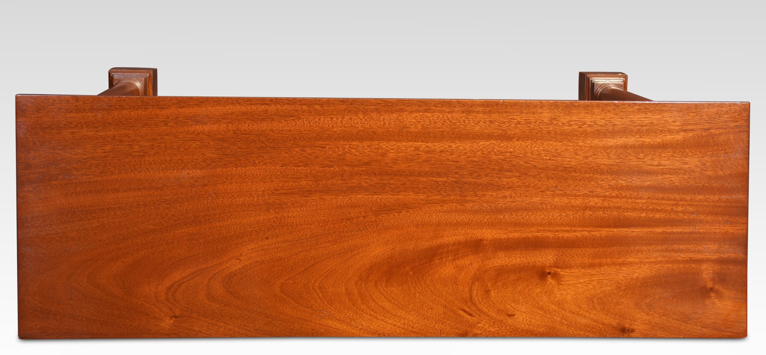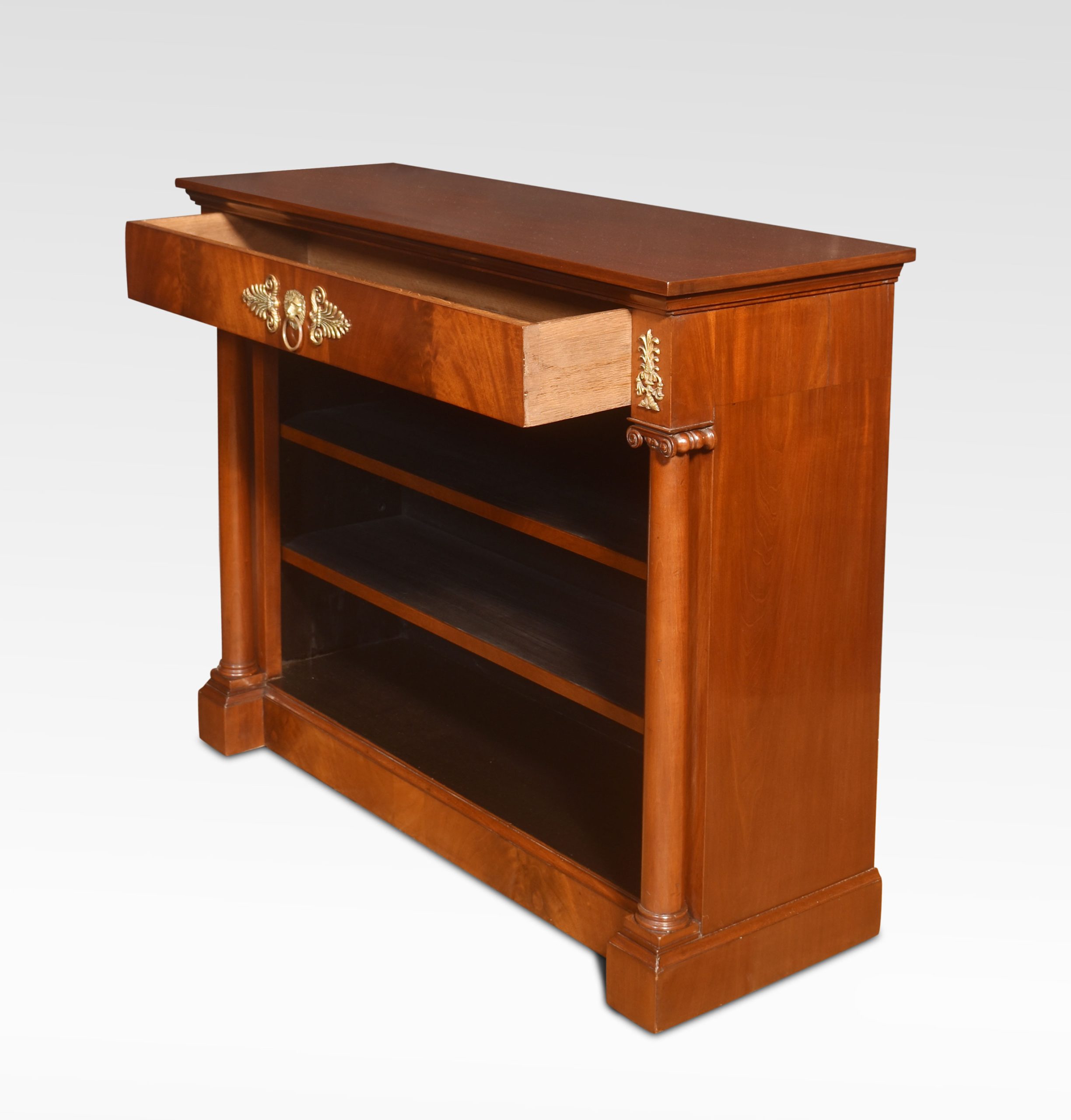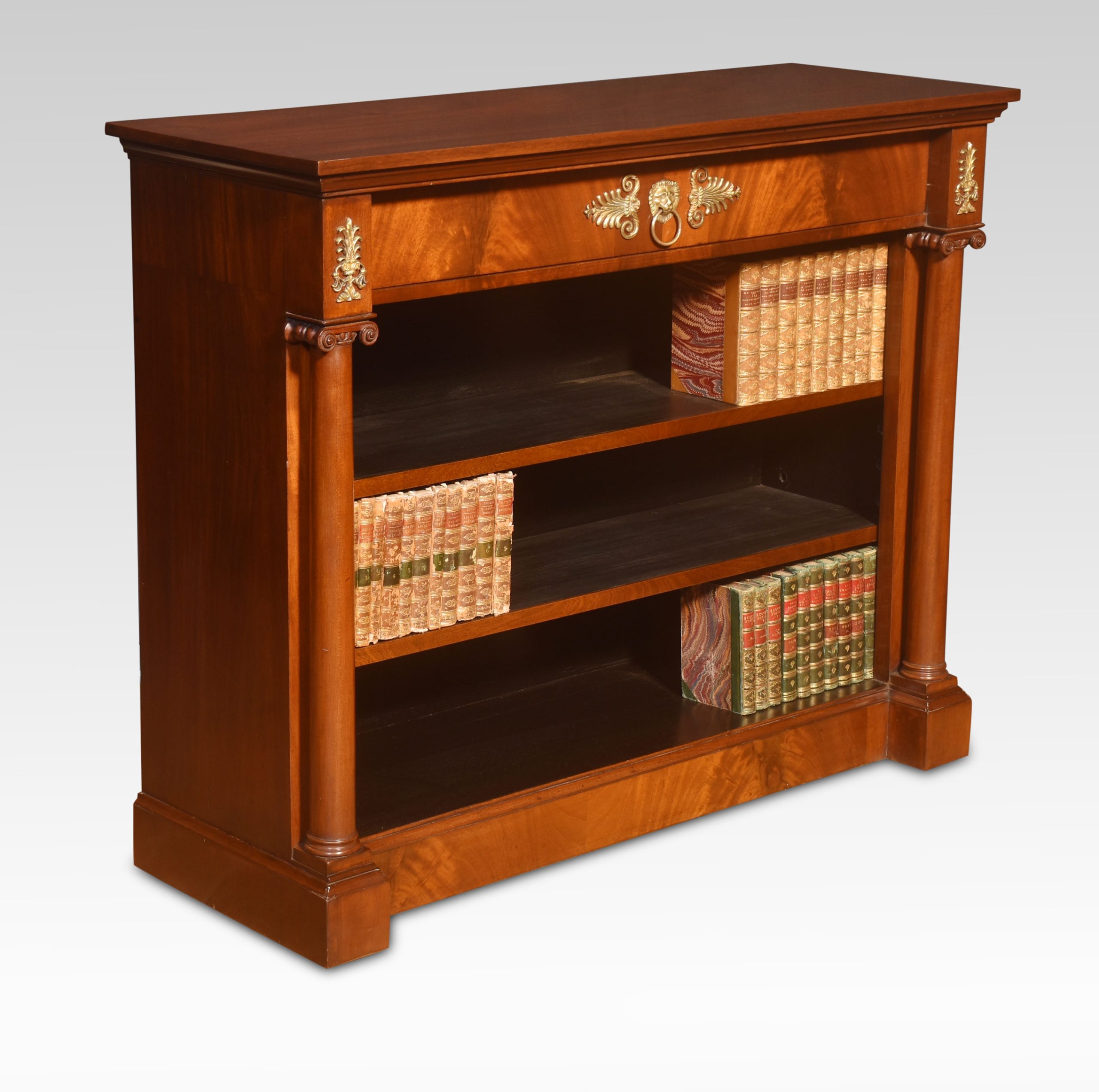 Mahogany open bookcase the rectangular well-figured top above large freeze drawer with central brass motif. To the adjustable shelved interior flanked by circular columns with brass capitals. All raised up on a plinth base.