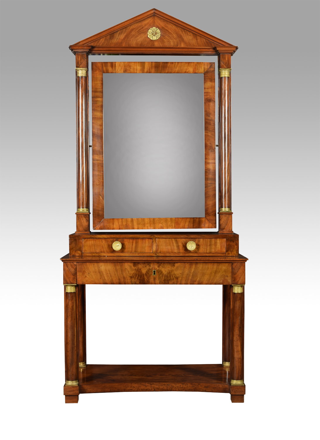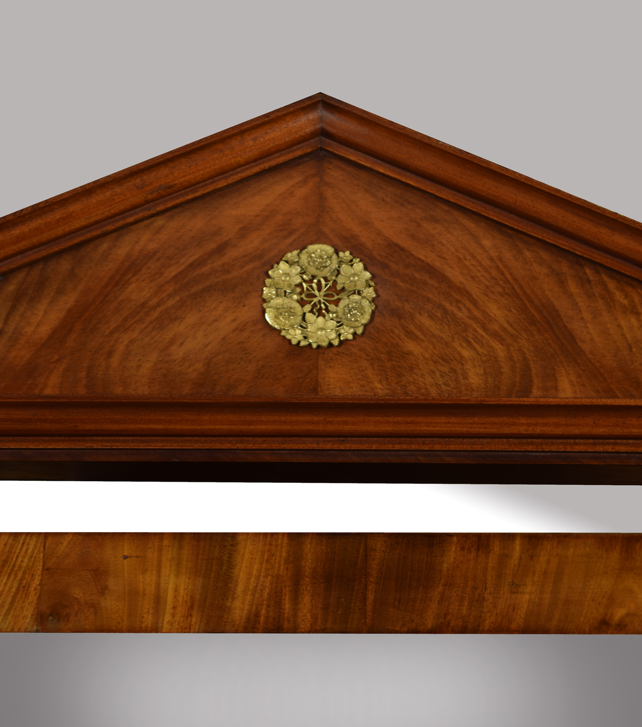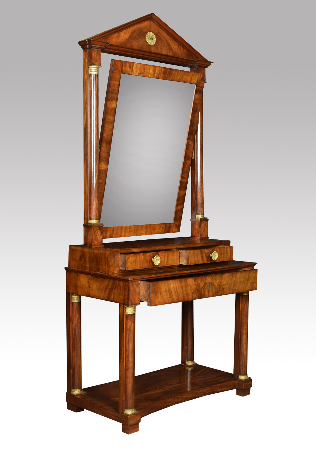figured mahogany and ormolu mounted dressing table, the architectural top above rectangular mirror supported by turned pilasters over an arrangement of two short and one long draw raised up on four turned supports united by under tier