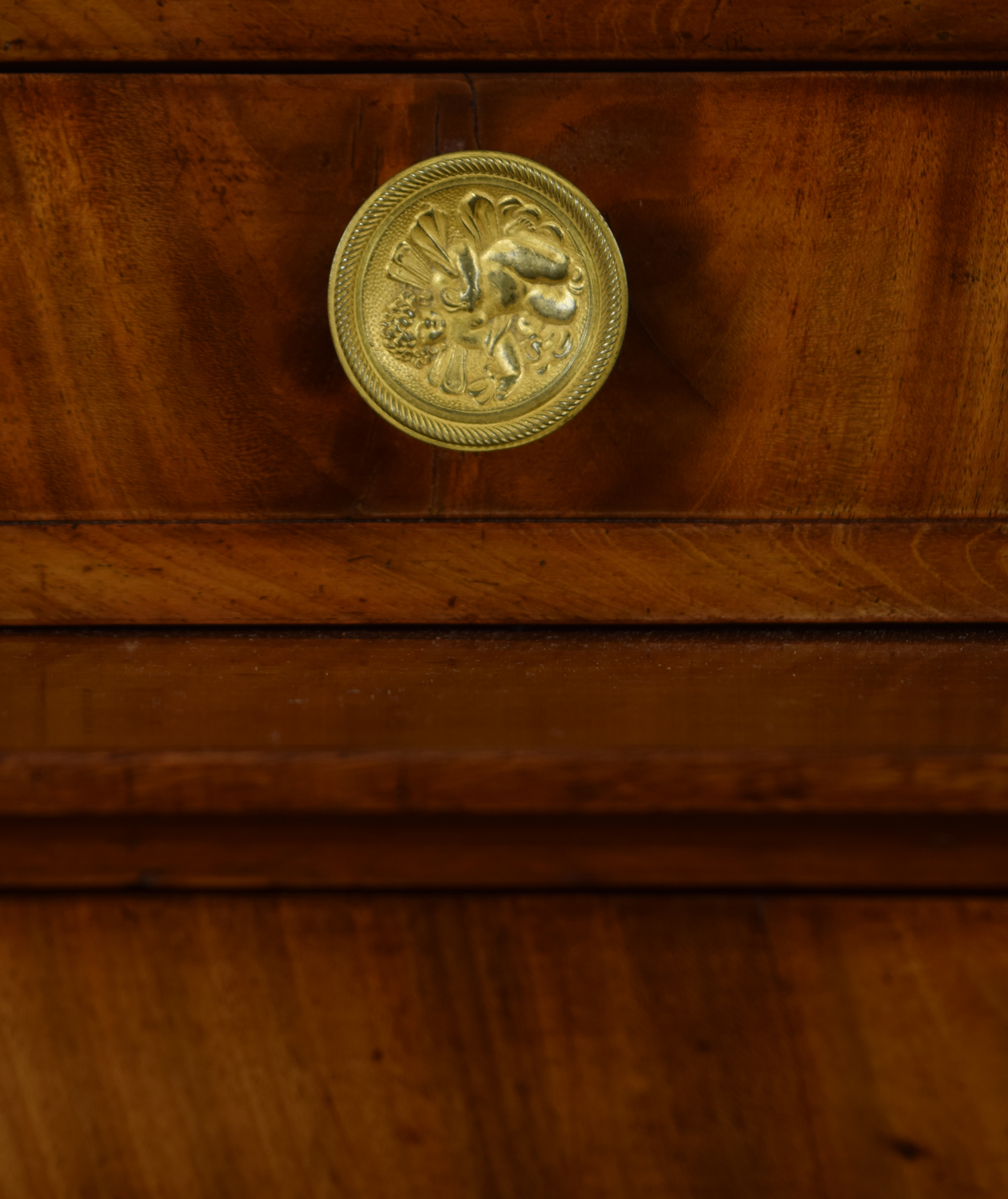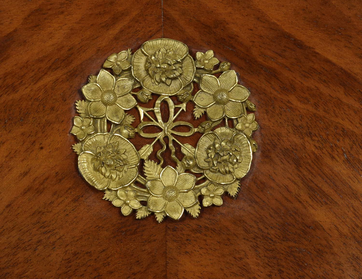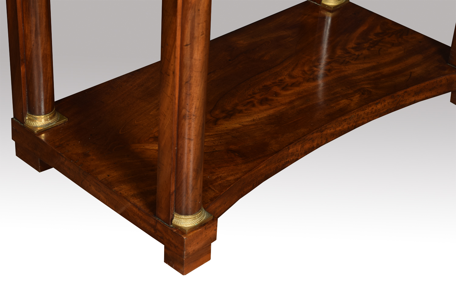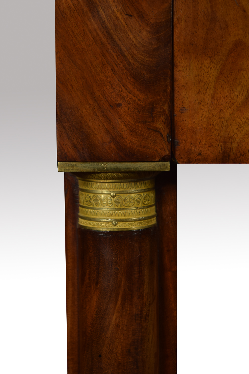 figured mahogany and ormolu mounted dressing table, the architectural top above rectangular mirror supported by turned pilasters over an arrangement of two short and one long draw raised up on four turned supports united by under tier