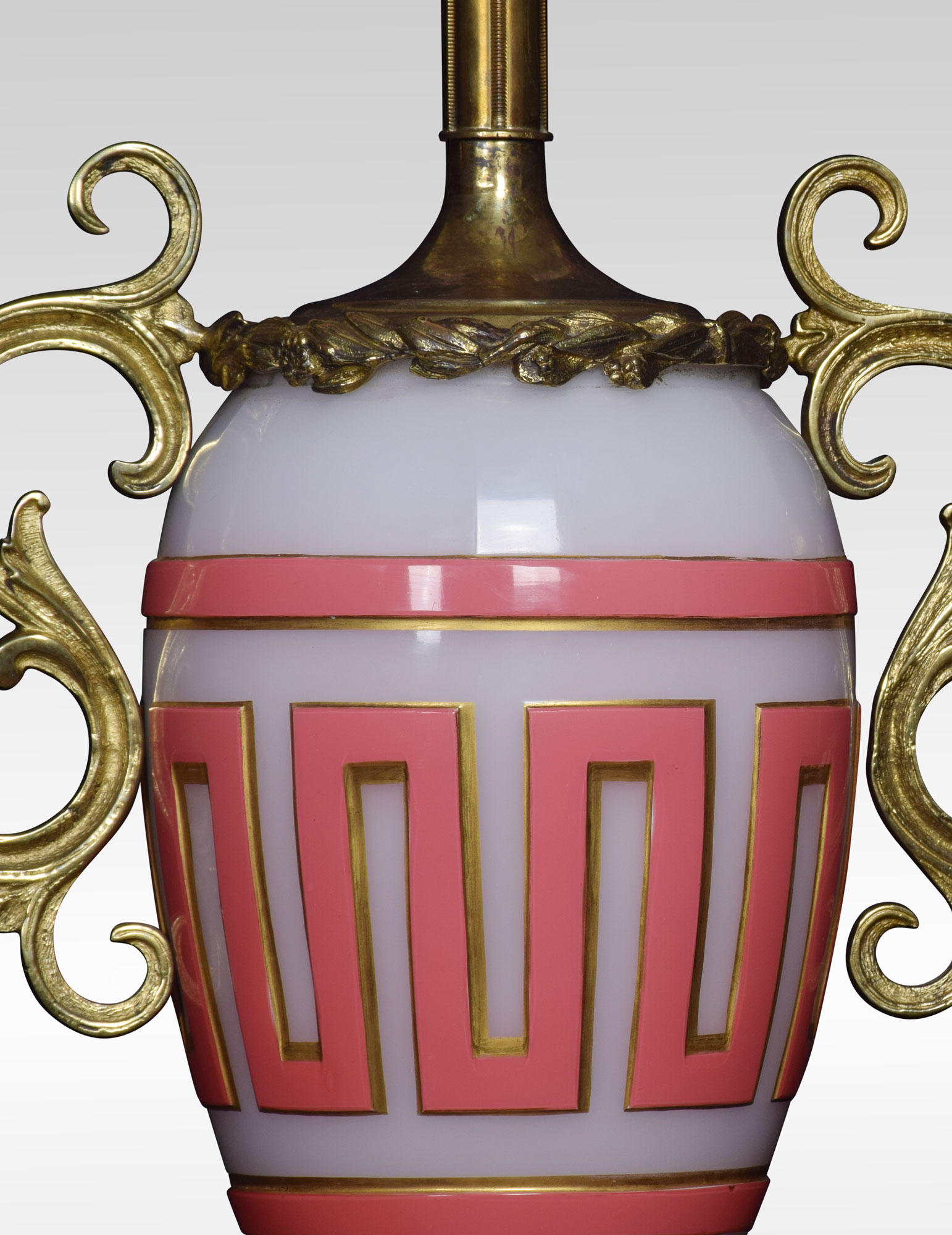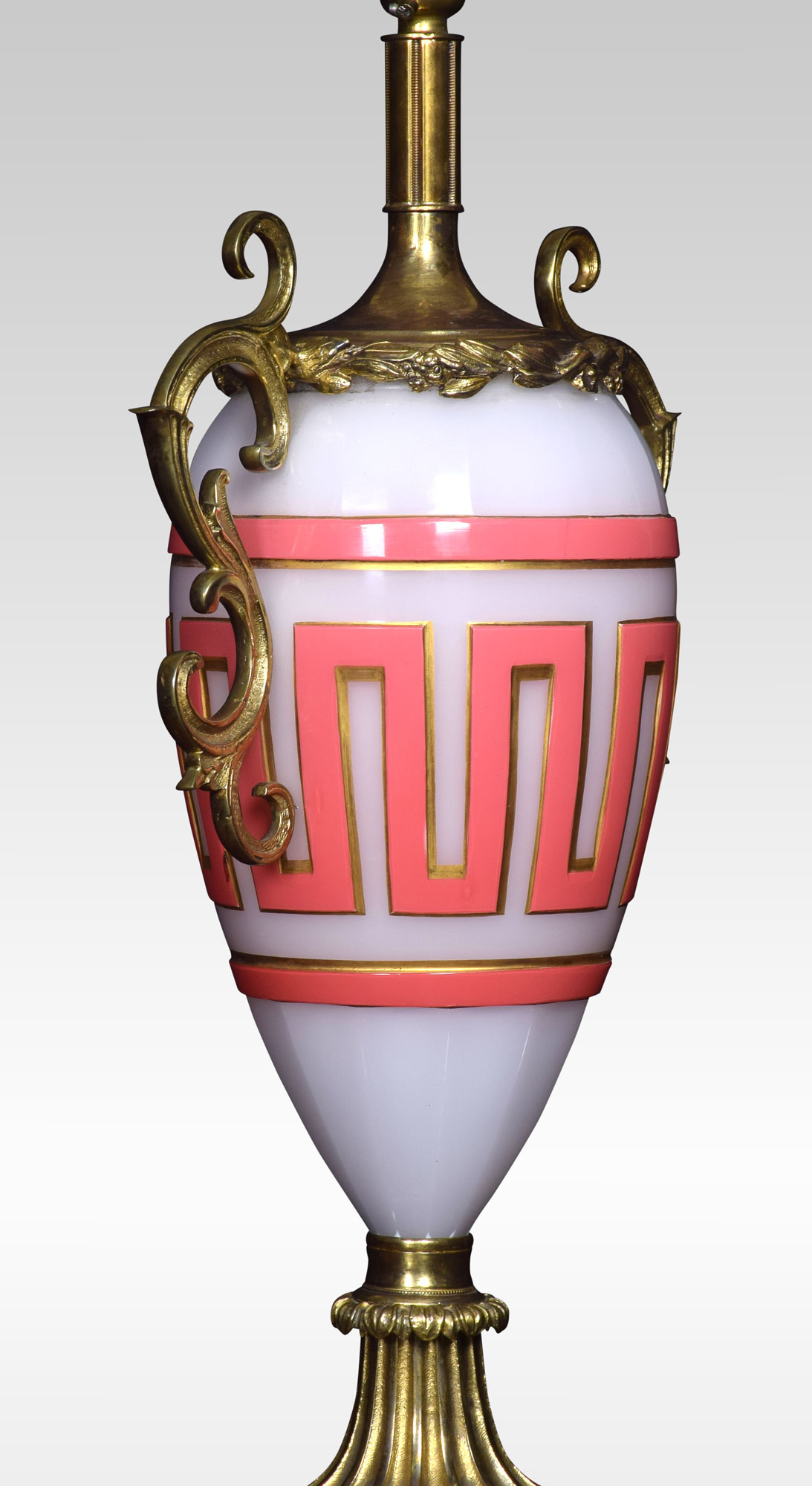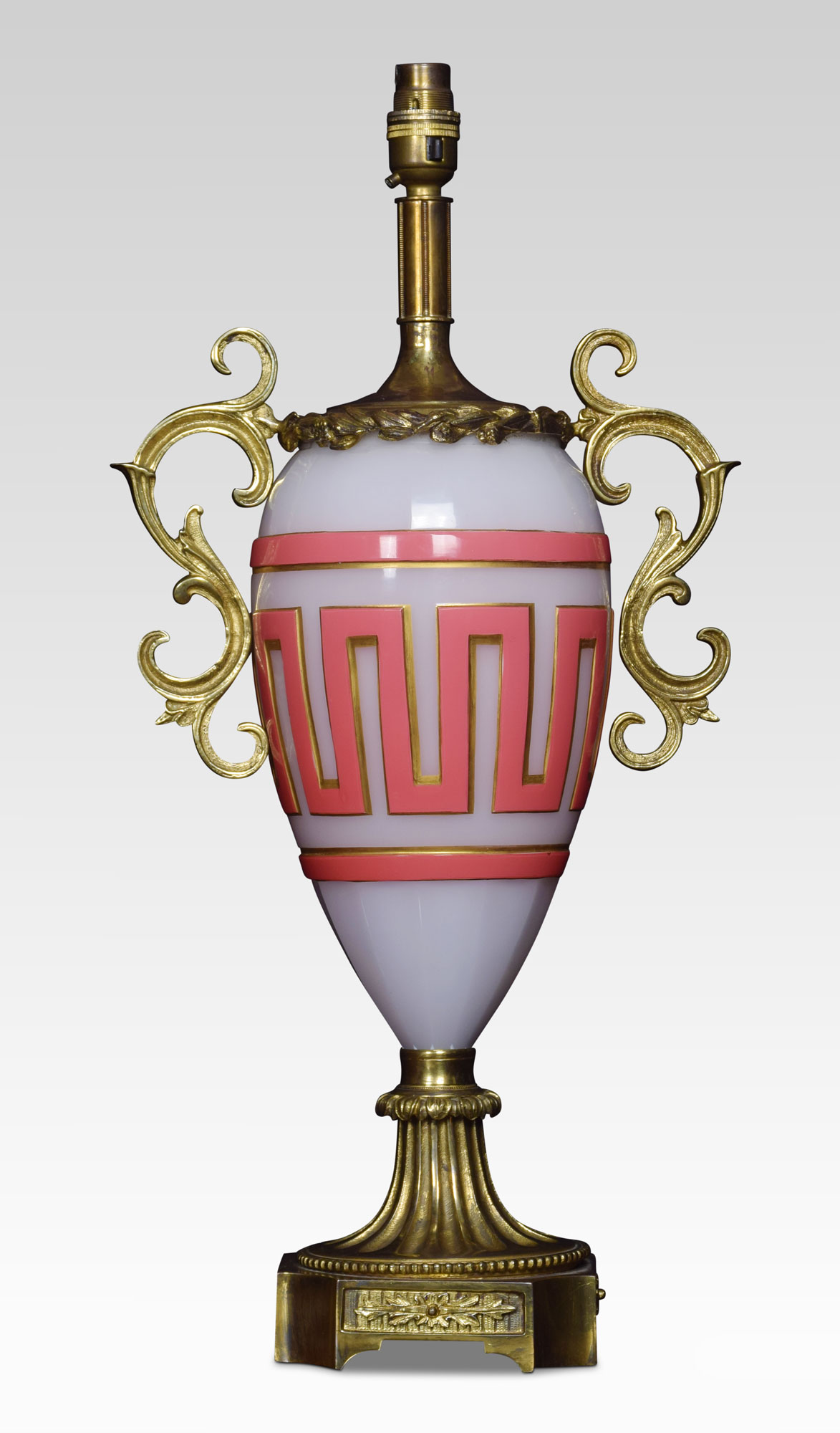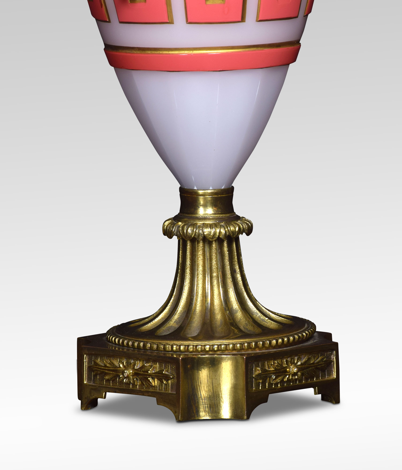 Large French glass and gilt brass mounted table lamp. The central vase-shaped opaline glass reservoir decorated in a pink overlay with gilt highlight. All raised up on a splayed base.