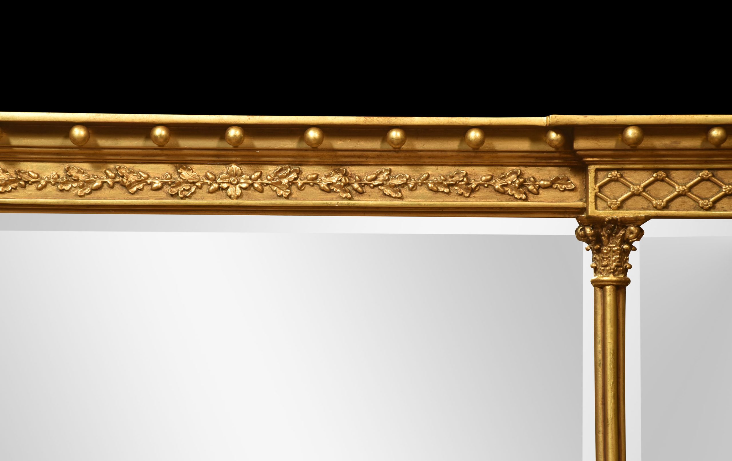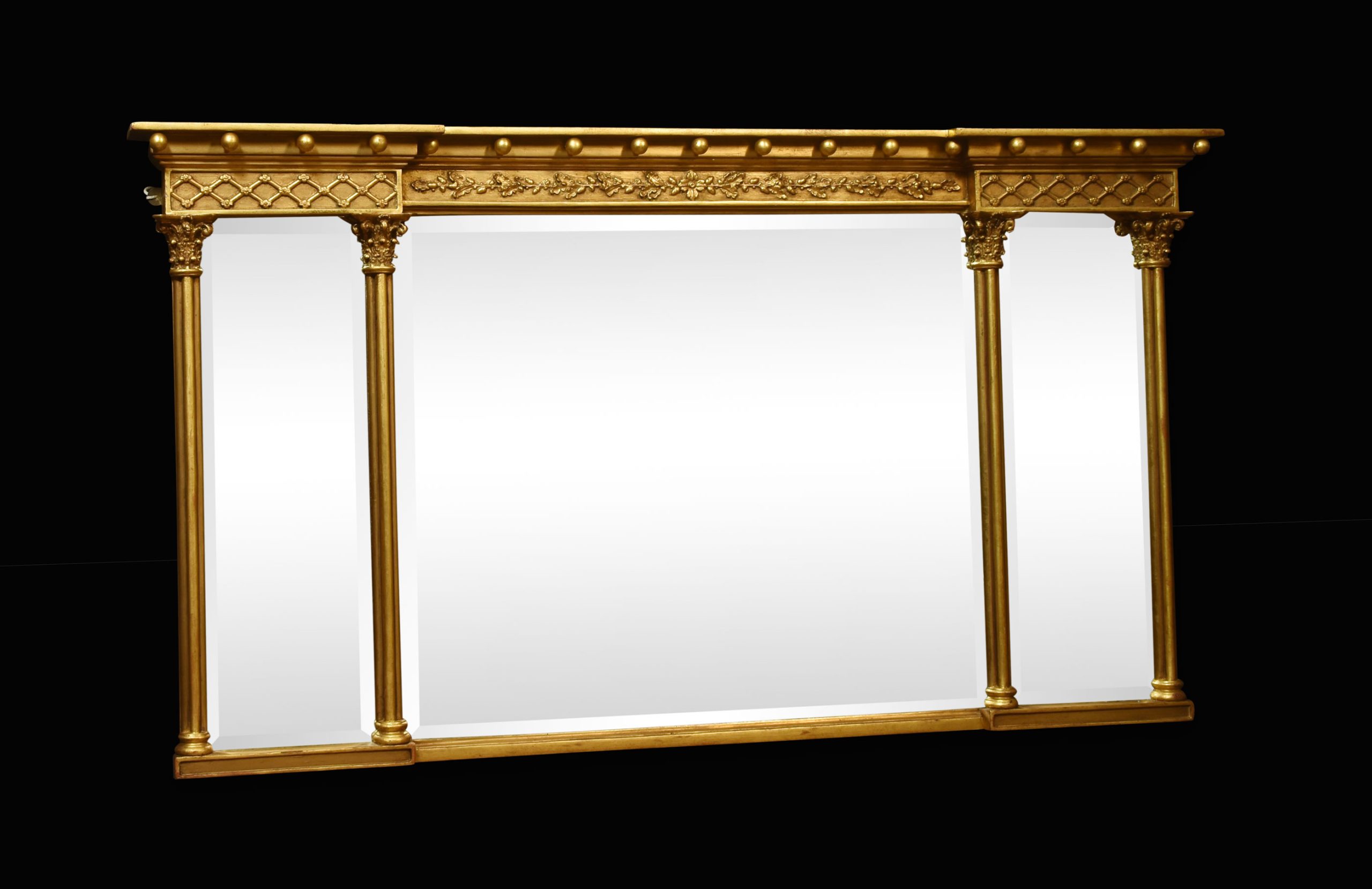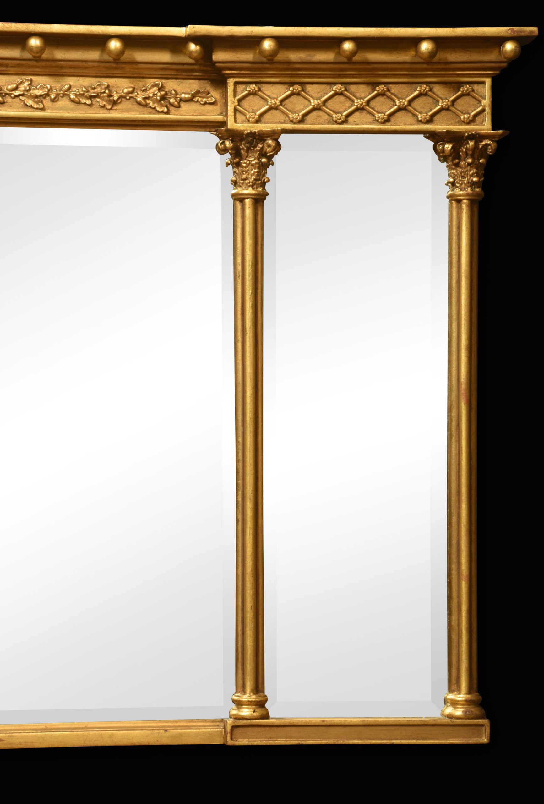 Gilded Overmantel Mirror, the projecting molded cornice with ball detail above a relief decorated frieze. To the three beveled mirror plates flanked by reeded half pilasters.