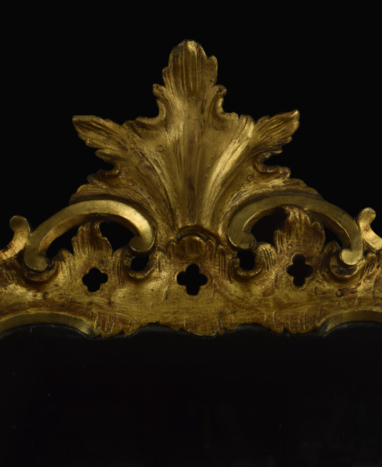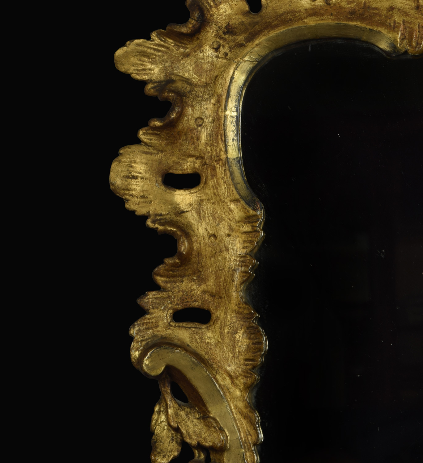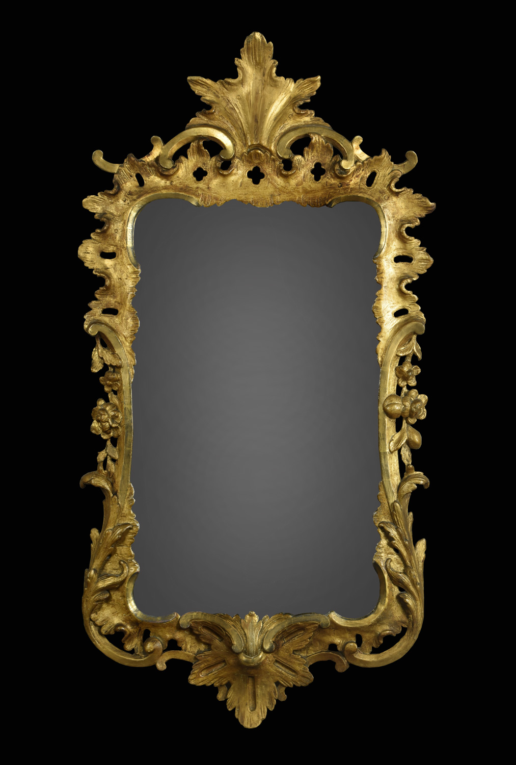 George II style gilt wood wall mirror with carved foliated pierced frame surrounding the original mirror plate