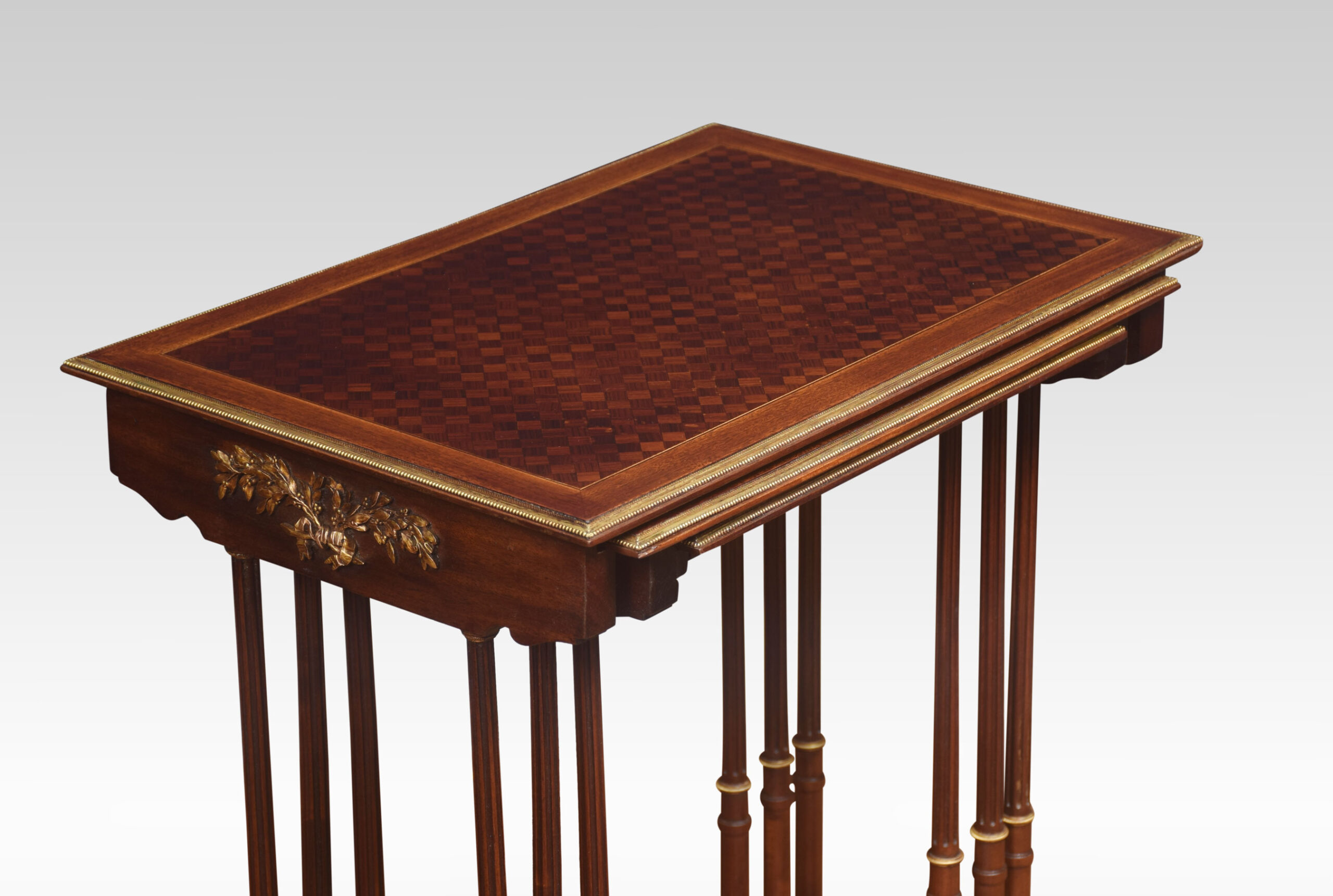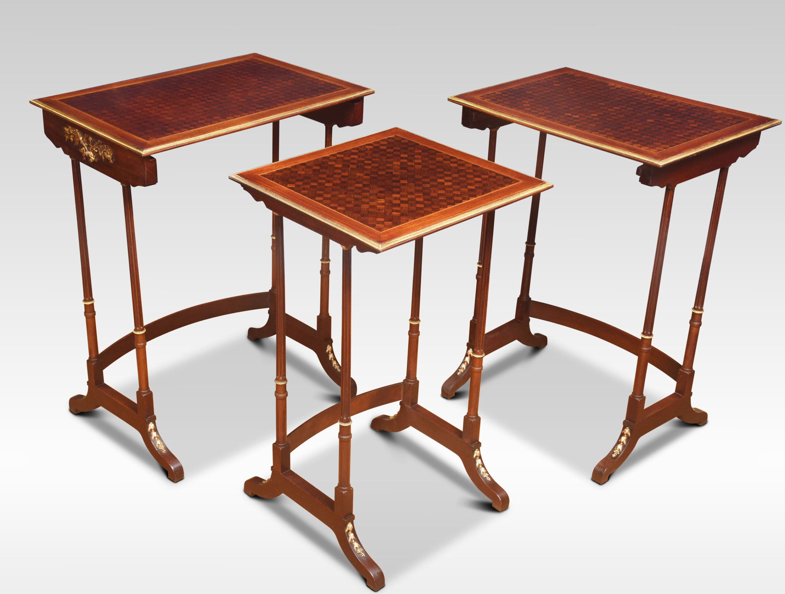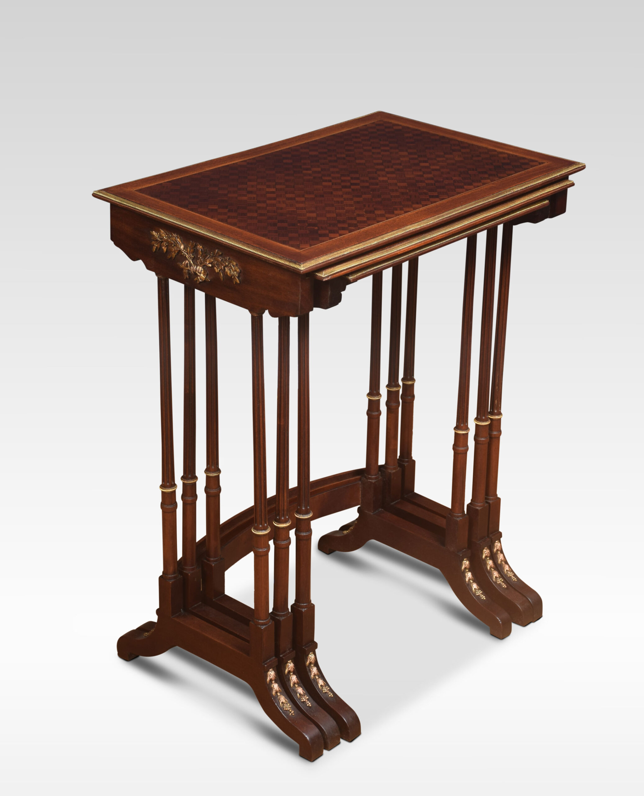 Nest of three walnut tables, the rectangular parquetry tops enclosed by a brass banded edge. raised on slender turned tapered supports with brass mounts, united by stretcher. All raised up on short swept splayed supports.