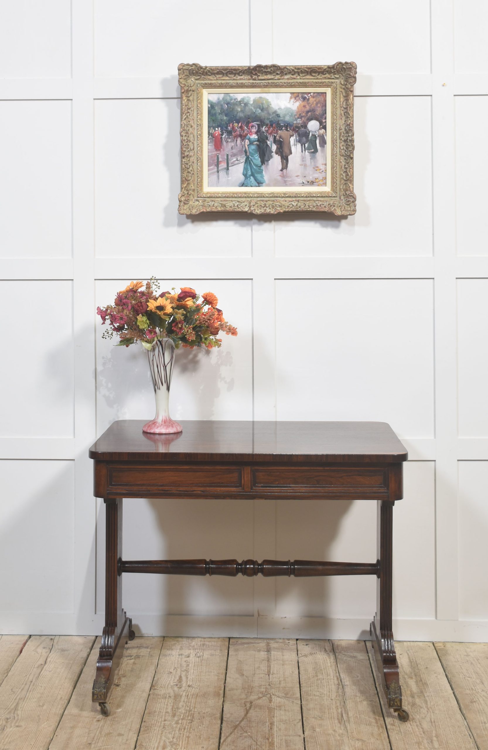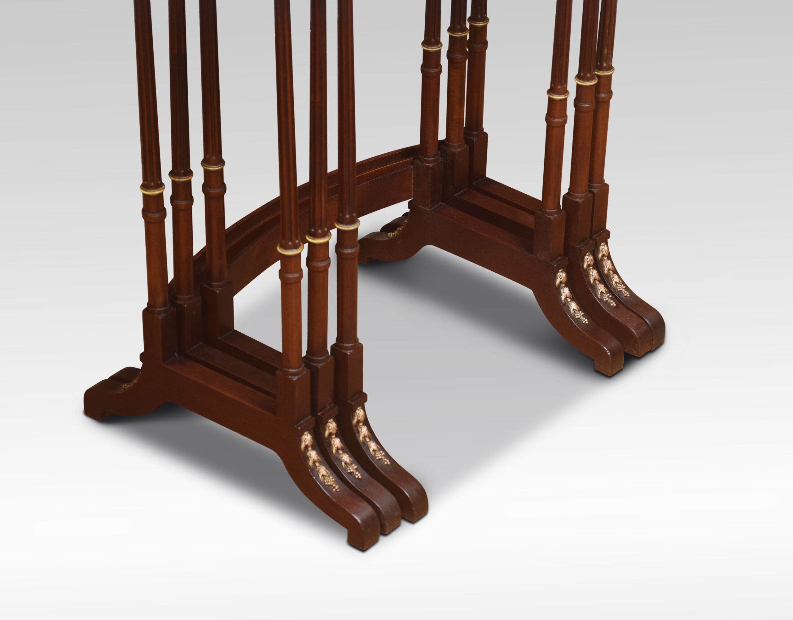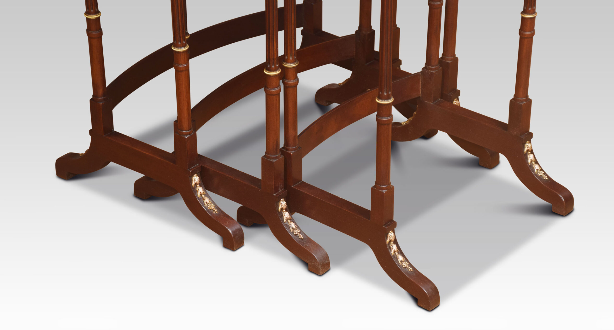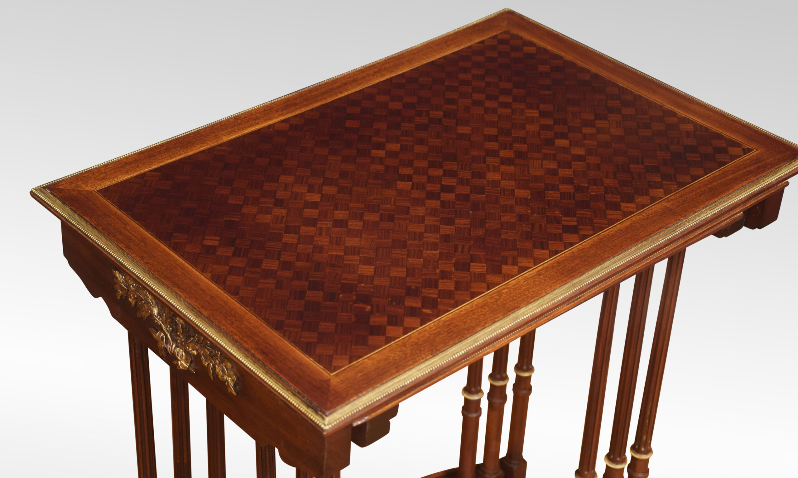 Nest of three walnut tables, the rectangular parquetry tops enclosed by a brass banded edge. raised on slender turned tapered supports with brass mounts, united by stretcher. All raised up on short swept splayed supports.